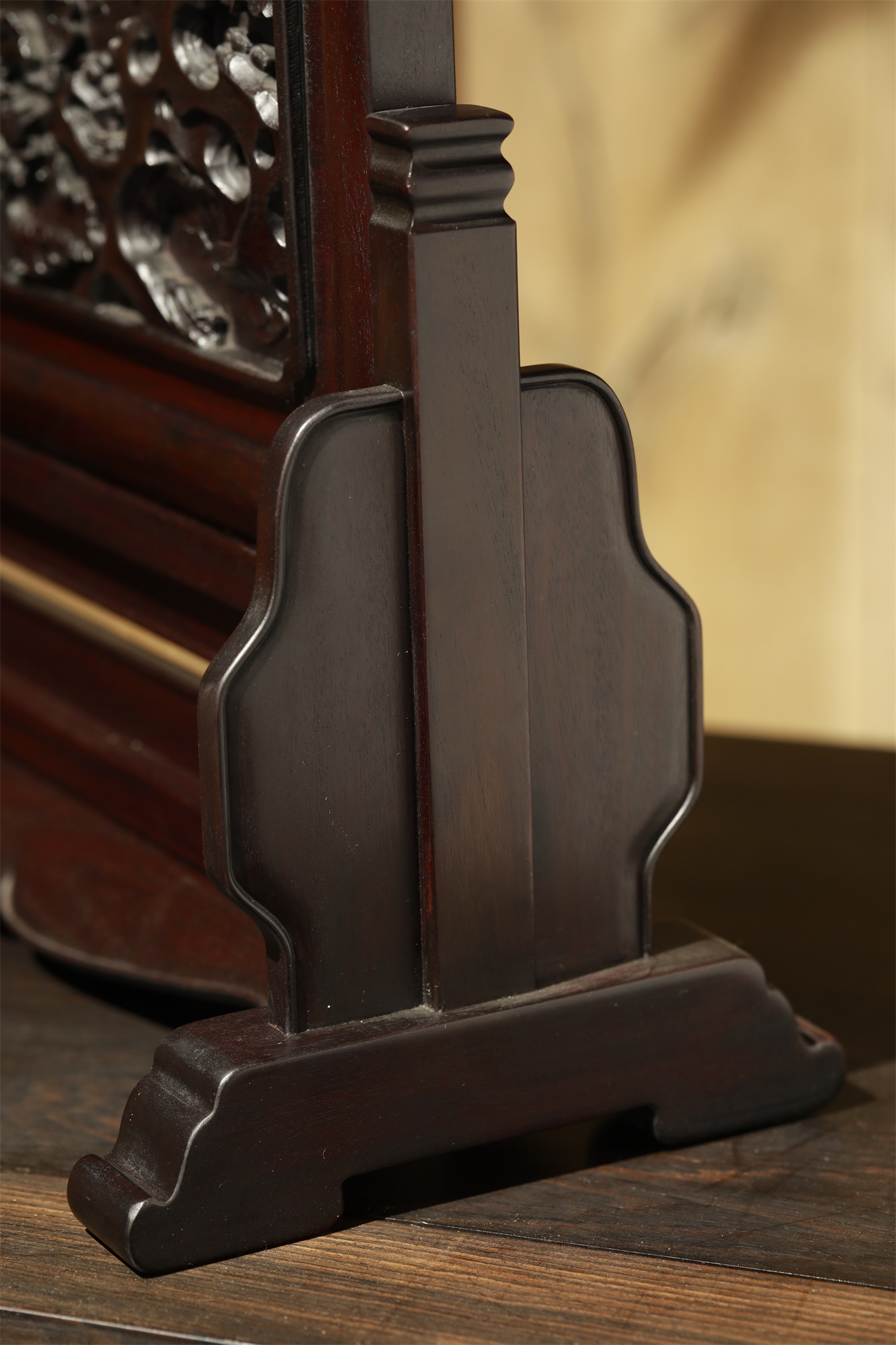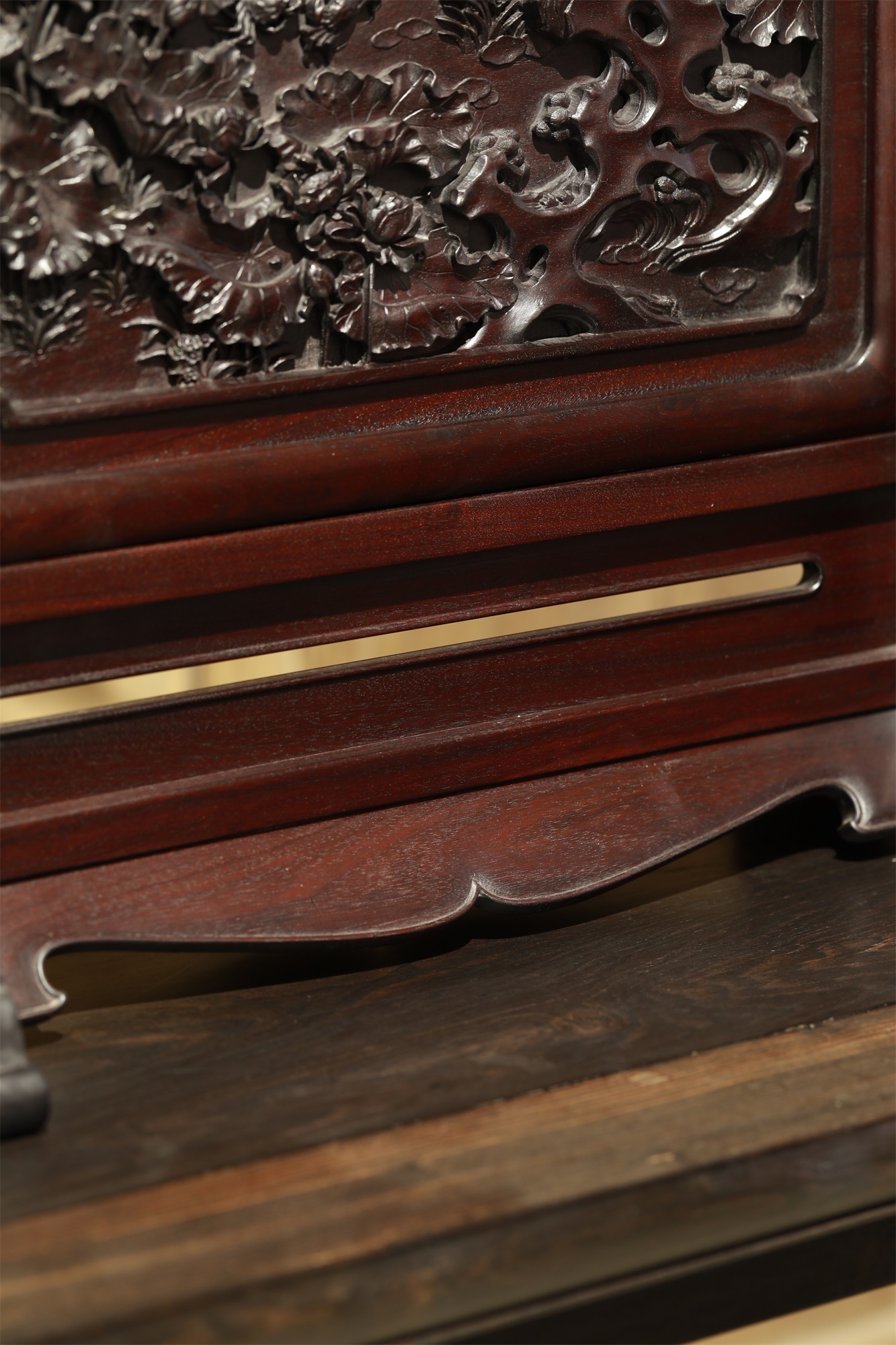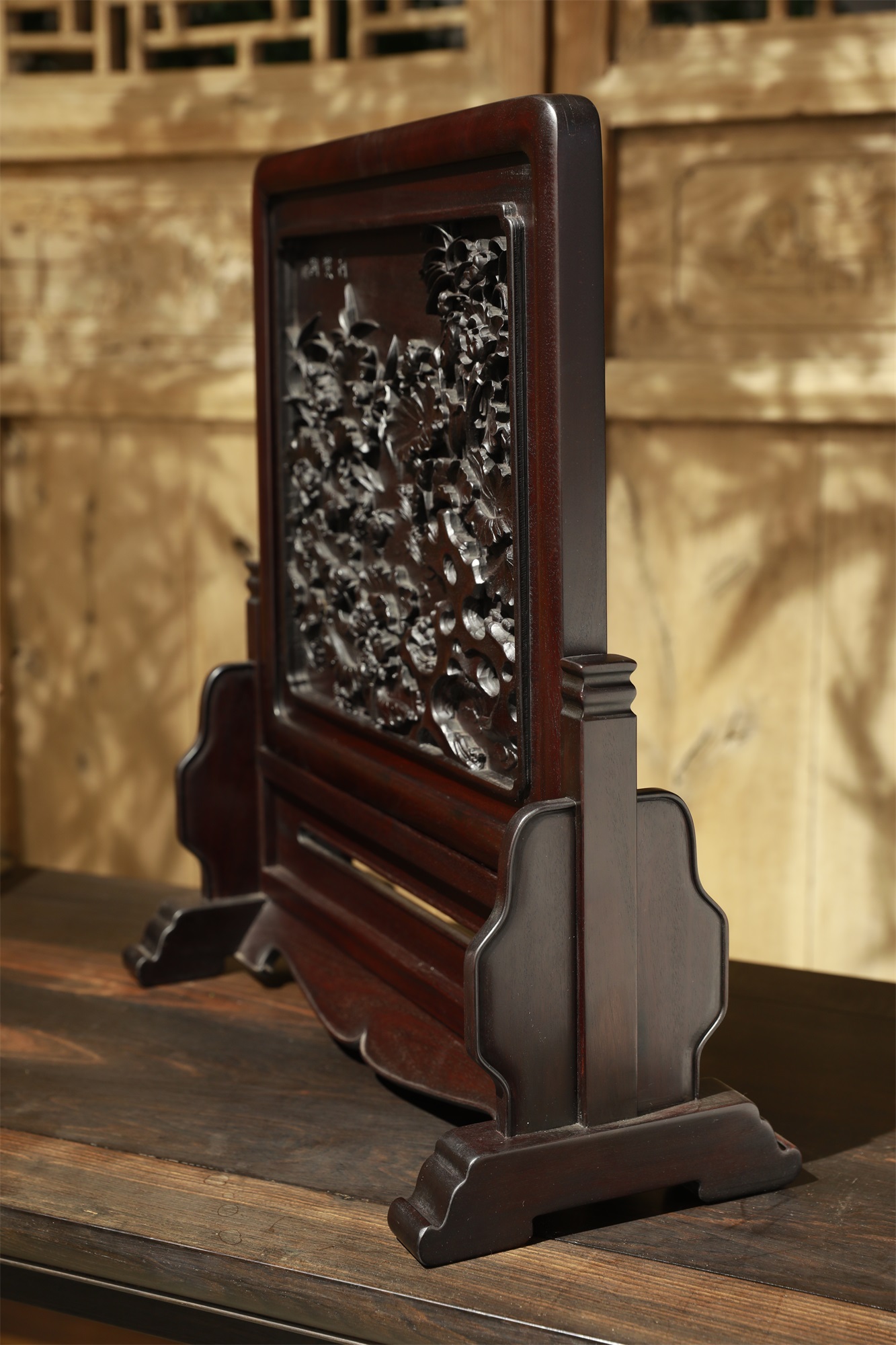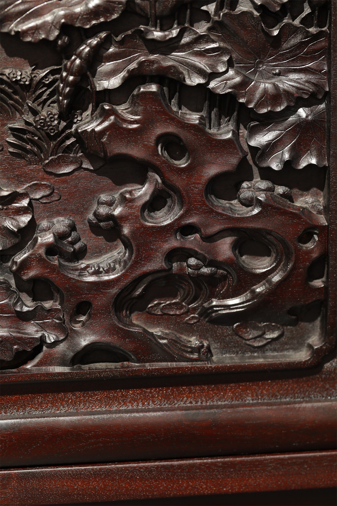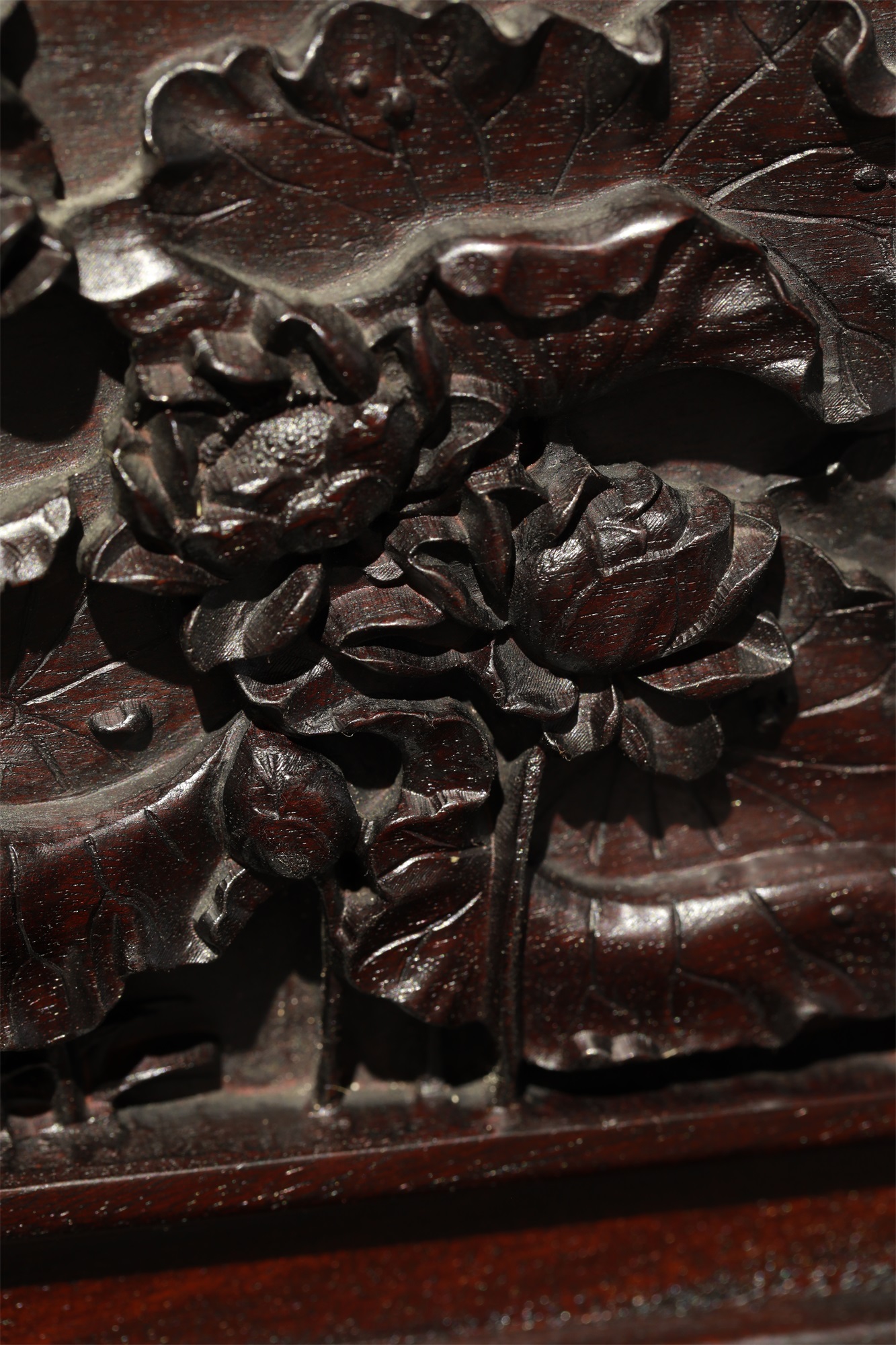 作品采用徽州传统手工艺雕刻而成。方寸间荷花枝干灵动,穿插有致,花与叶的层次、位置、穿插、向背,繁而不乱,显示出高妙的匠意。踞于荷叶间的小螃蟹成为构图的点睛之笔,刻划自然生动细腻,增添了画面的趣味。荷花、螃蟹均为中国传统的吉祥图案。“荷”“和”谐音,赋予荷和气、和平、祥和、和合、和好的美好寓意。也承载了文人墨客的生活情趣和人文情怀。