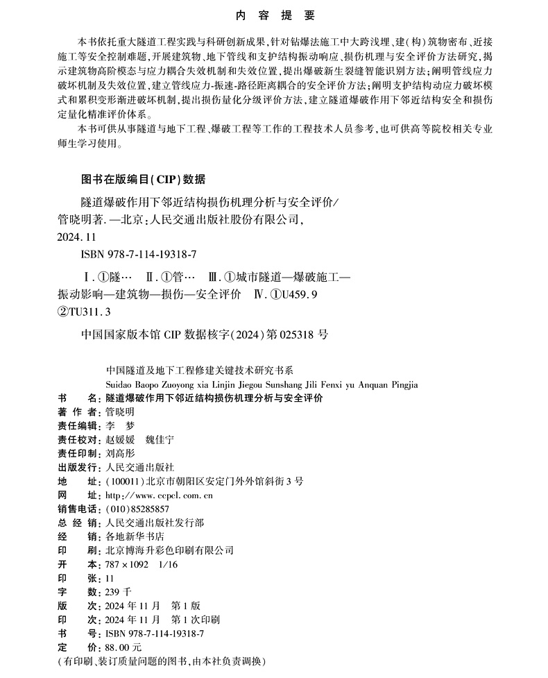 书名:隧道爆破作用下邻近结构损伤机理分析与安全评价