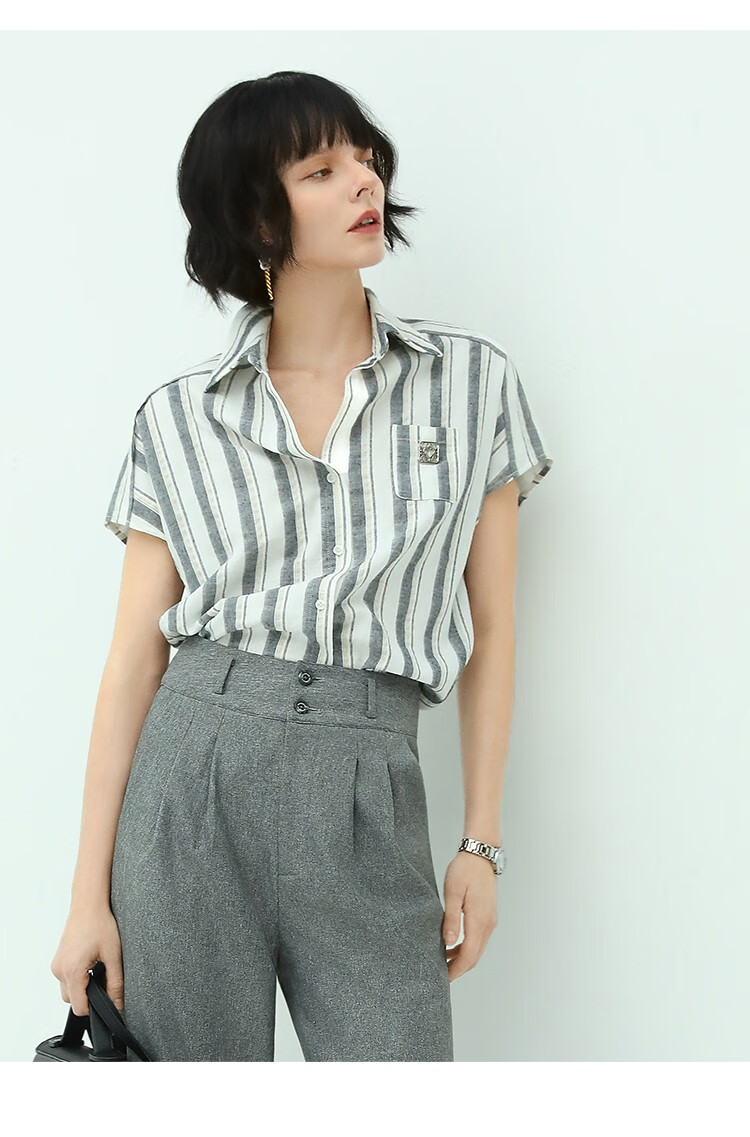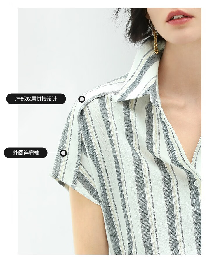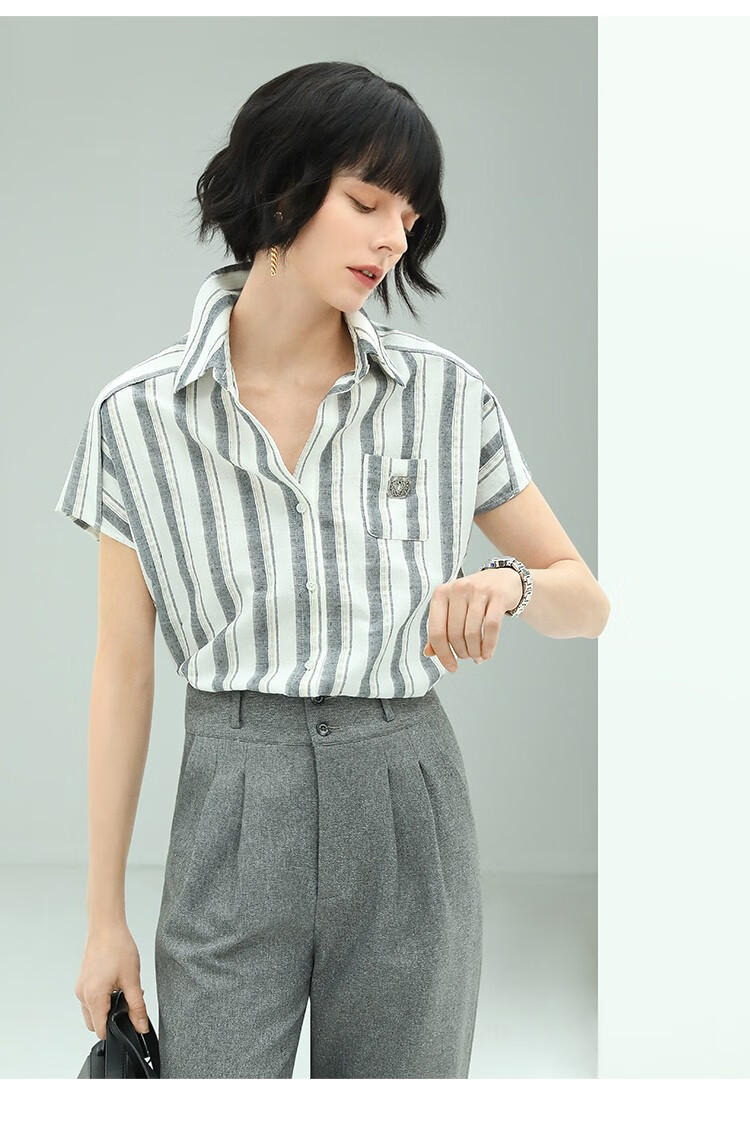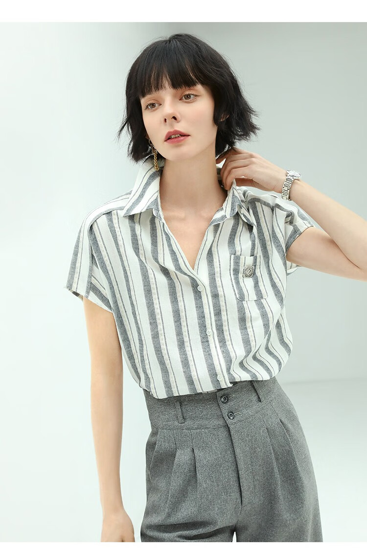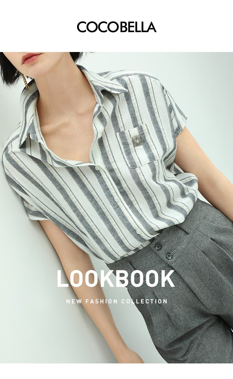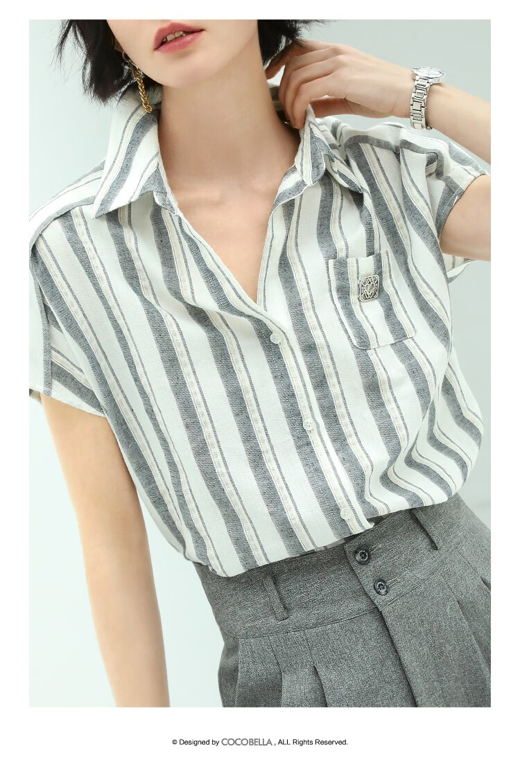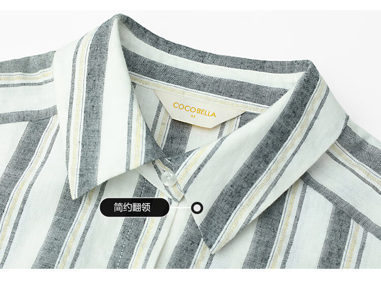 COCOBELLA亮丝竖条纹短袖衬衫女宽松休闲舒适全棉衬衣SR607