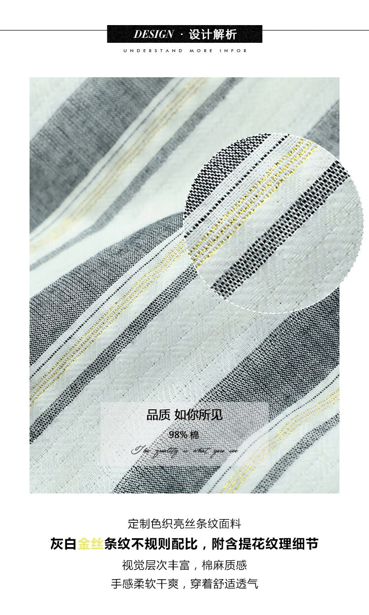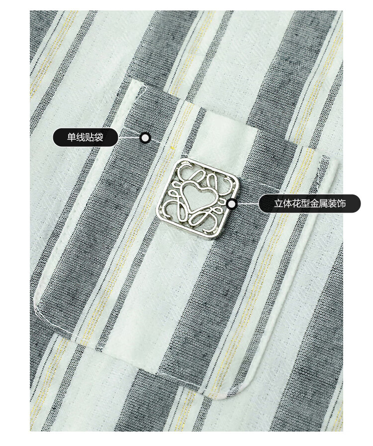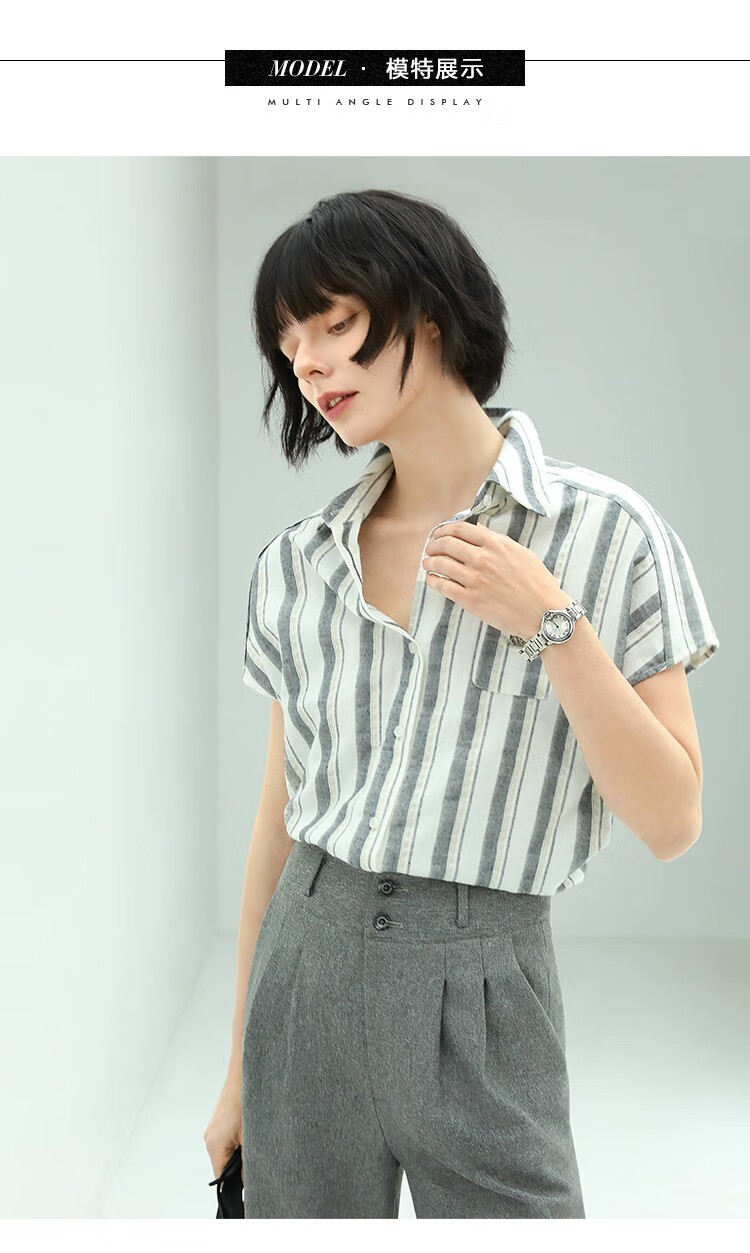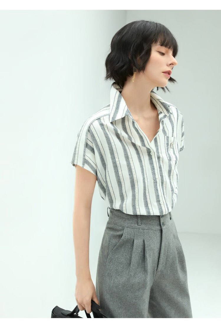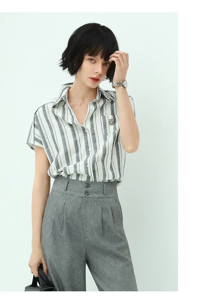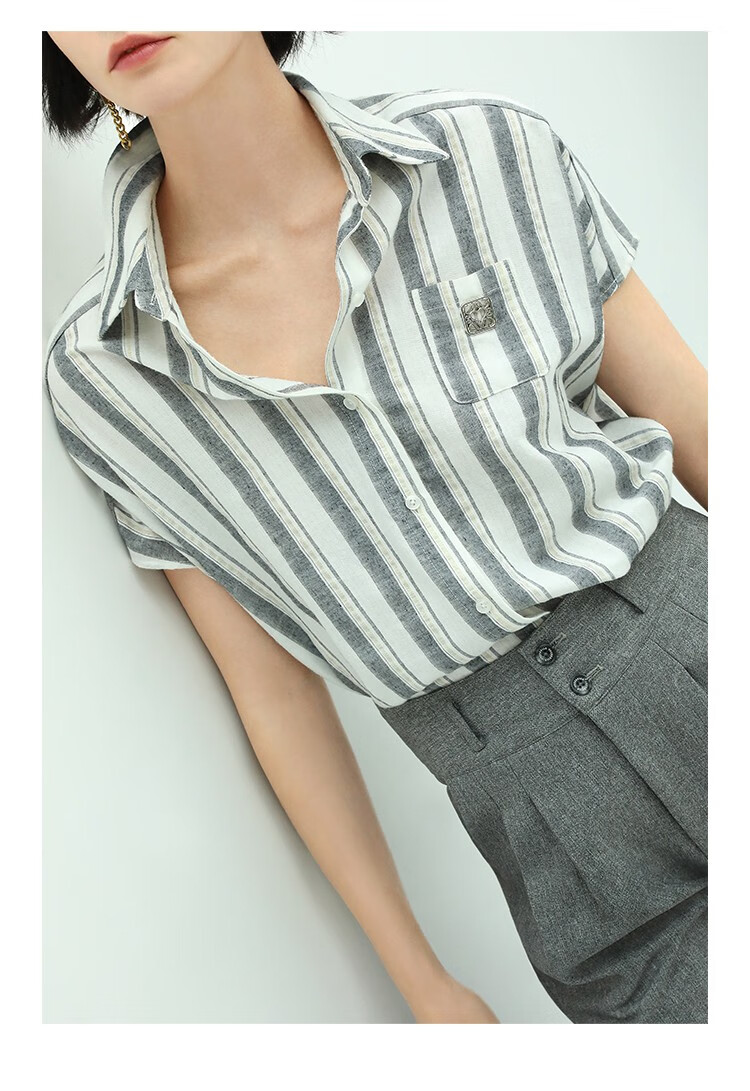 COCOBELLA亮丝竖条纹短袖衬衫女宽松休闲舒适全棉衬衣SR607