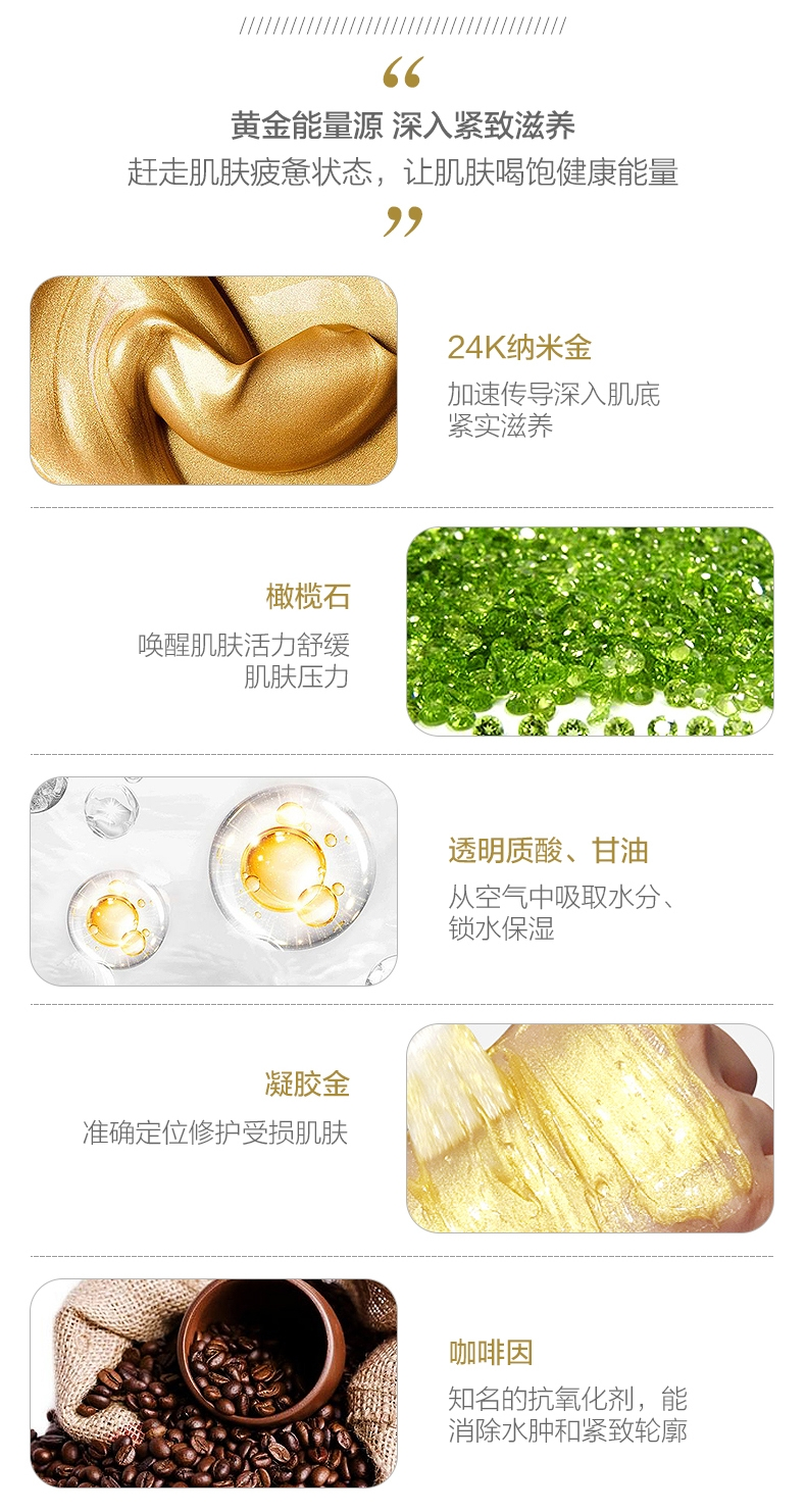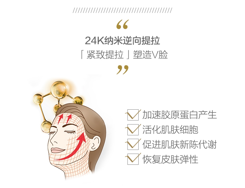 •纯粹的24克拉黄金——给予一个华丽的,晶莹剔透,黄金颗粒锁住水分,使皮肤维持胶原蛋白在皮肤和抑制弹性蛋白的分解