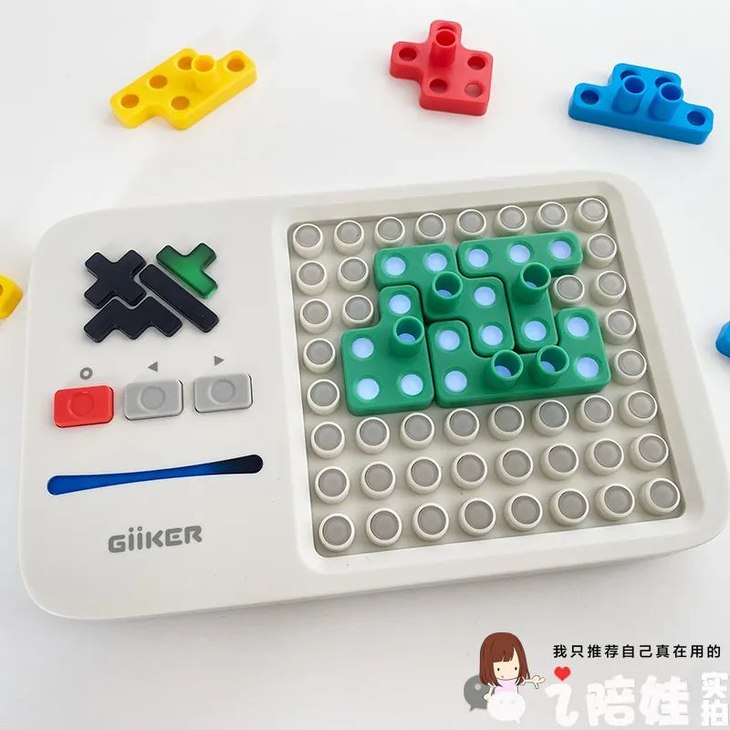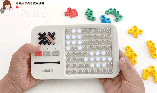 每关是自动或者手动显示下一题(图形亮灯显示出来),只要用相应的积木往上插就行(有个方便插拔的小揪揪,孩子玩也很丝滑),比带着一堆图案卡要省事。