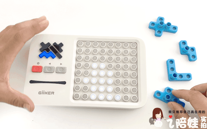 这次的玩法我们觉得比华容道还要炫酷一些。每关会用到不同的积木进行图形拼插组合。一旦通关,整个棋盘会一闪一闪的亮起来,特有仪式感(是64个小灯珠,没有电子屏幕,对眼睛也更友好)