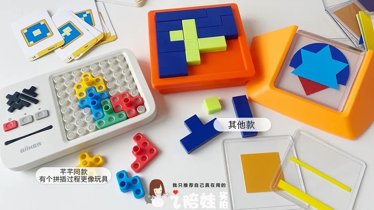 因为积木块是立体的,就比卡片或拼图式的有游戏的道具感(题卡+拼图的,芊芊总说跟做题似的,没什么意思),芊芊觉得像拼乐高。
