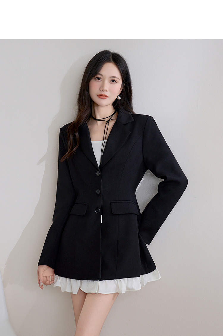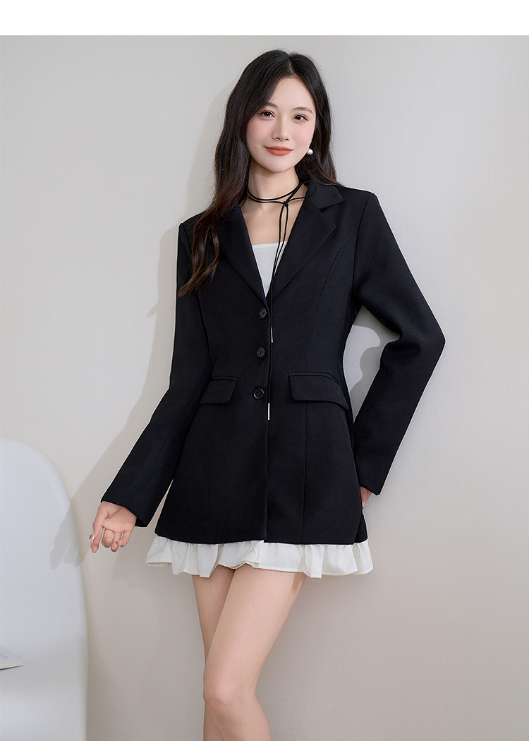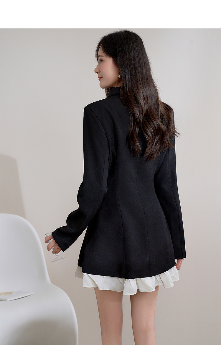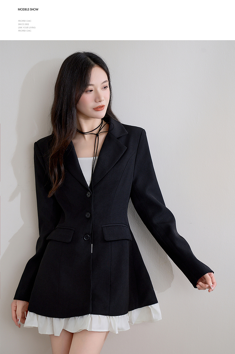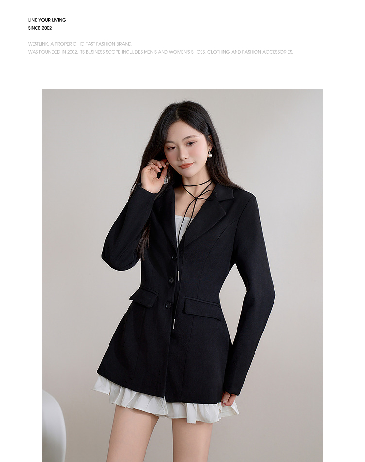 西遇黑色西装连衣裙女新款通勤v领拼接收腰长袖裙子SS150082