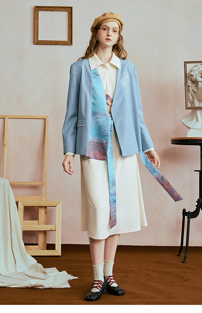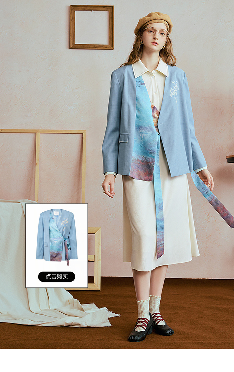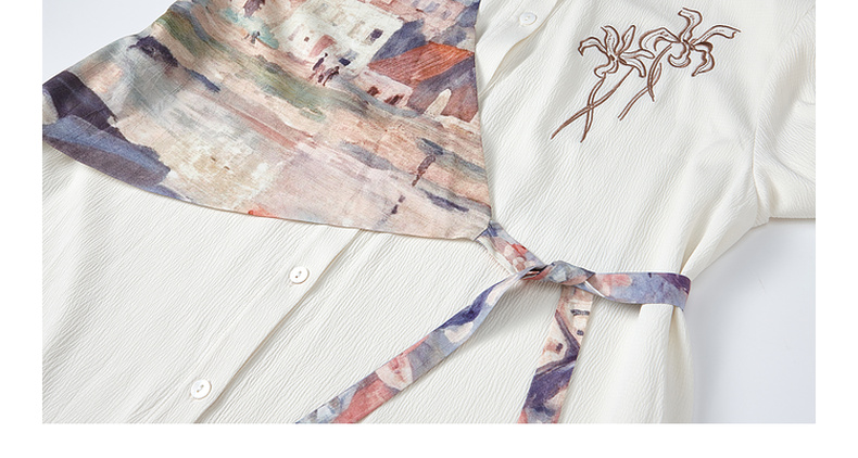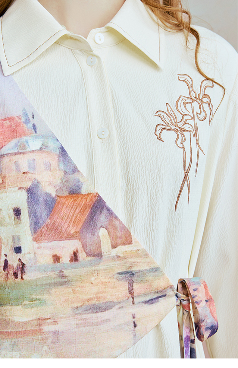 两三事梵高艺术花也谈情夏季压褶拼接印花两面穿雪纺衫女