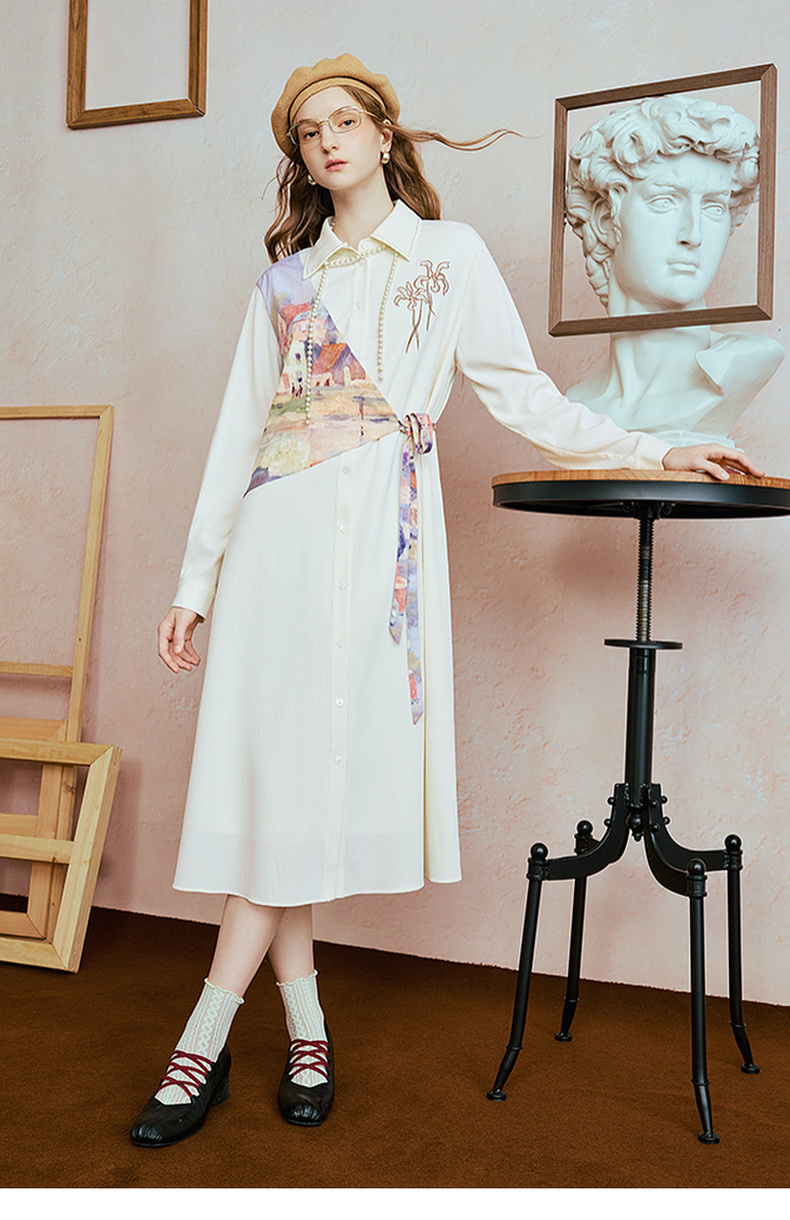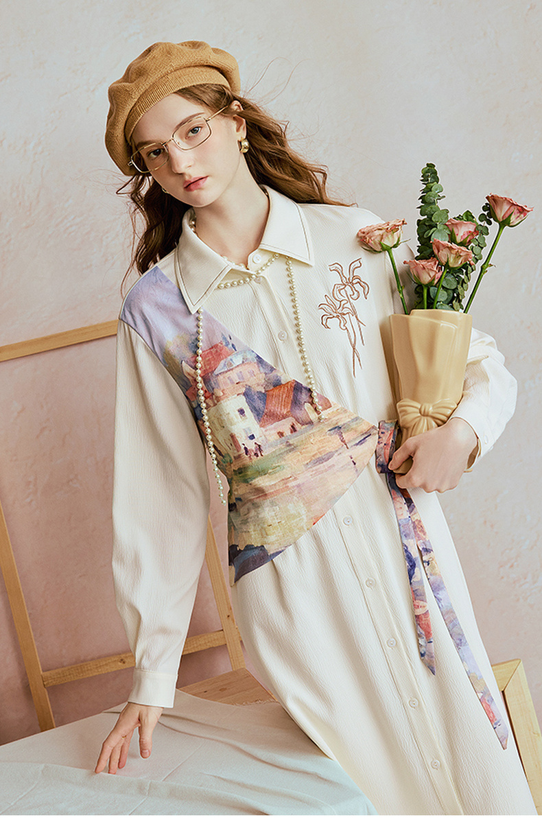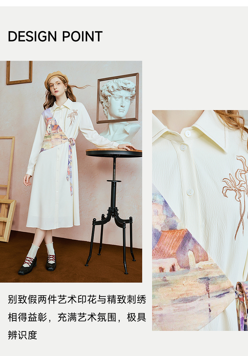 两三事 花朝小镇 2025秋季新款文艺风印花布绑带绣花假两件连衣裙