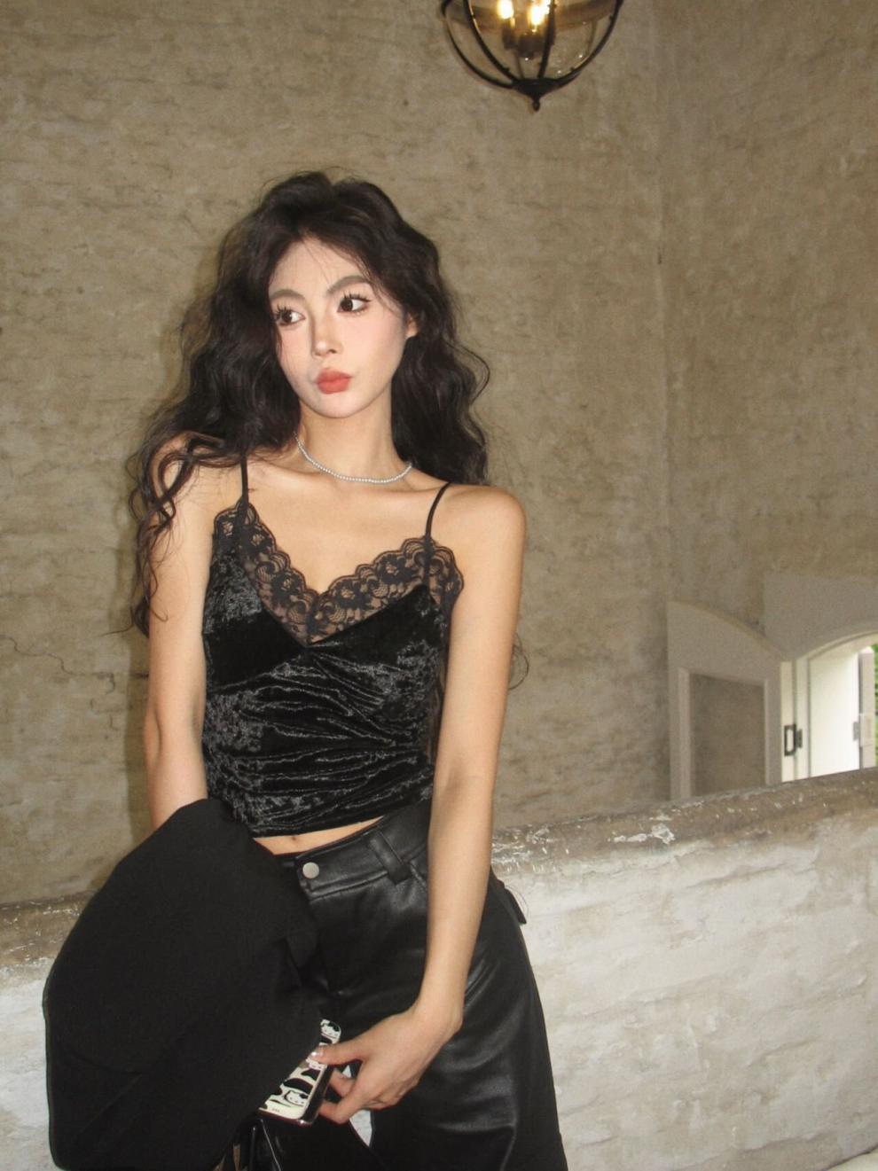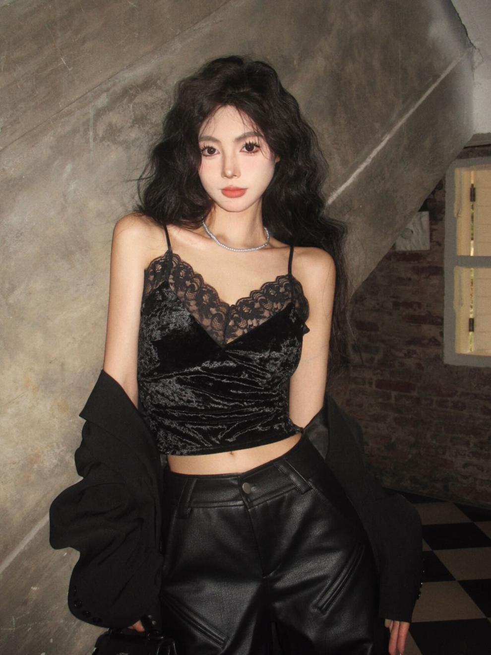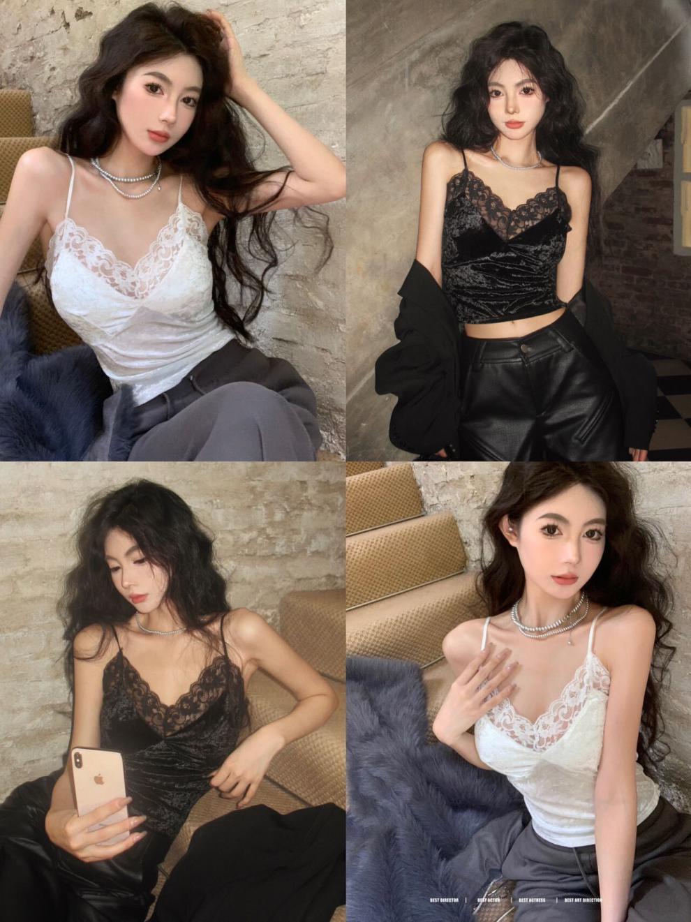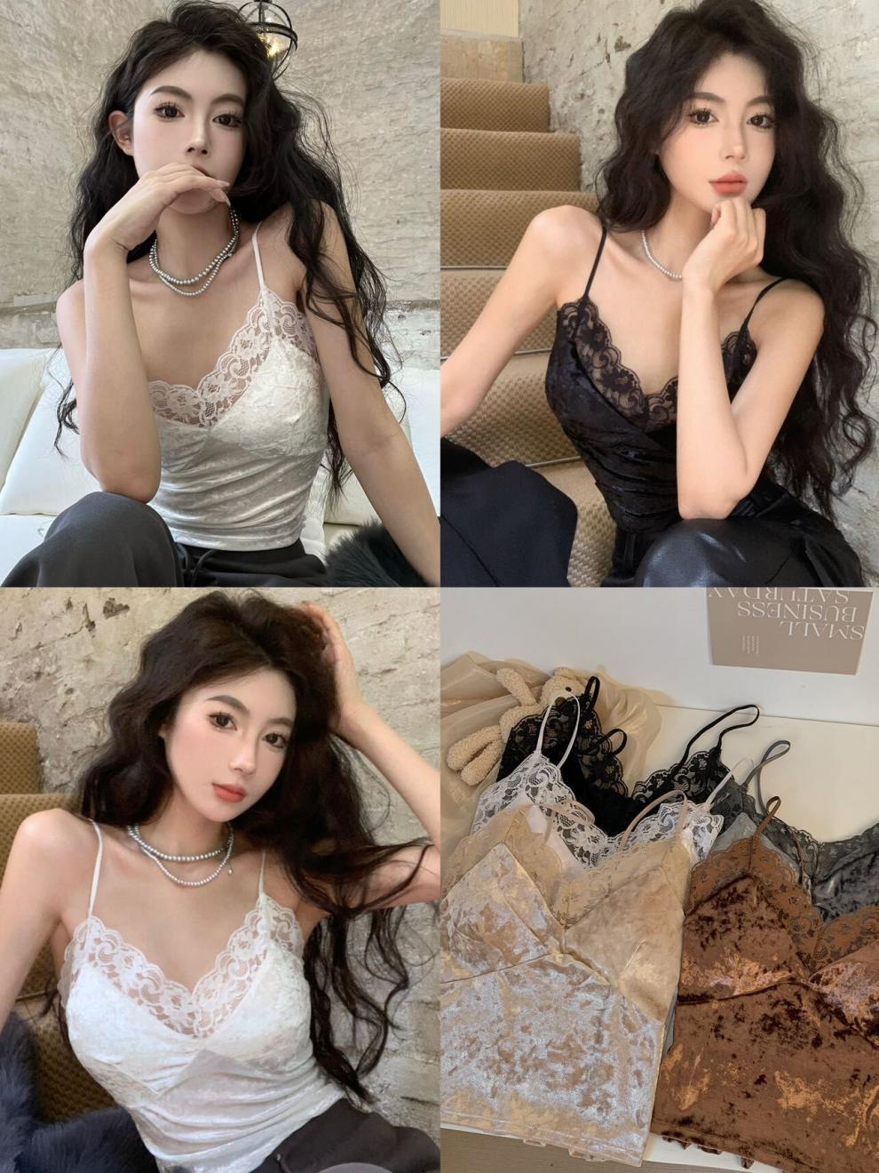 【小众设计款!抢2件更划算!】纯欲蕾丝金丝绒拼接吊带 百搭舒适遮副乳 秋冬美背上衣bra