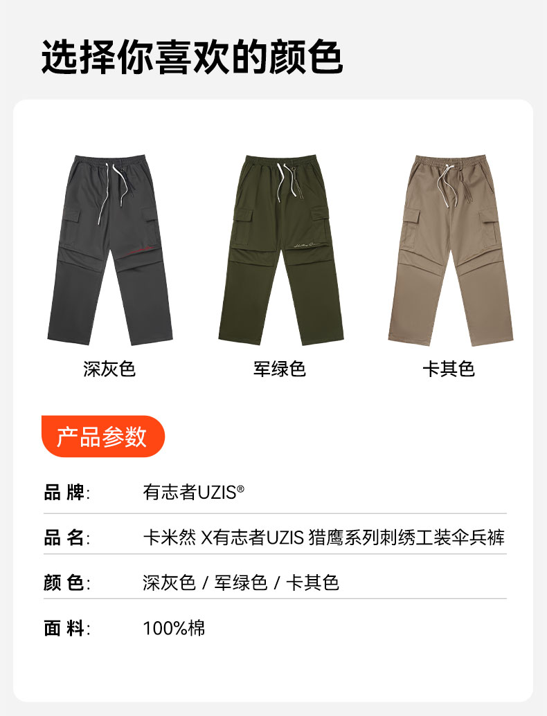 有志者UZISx卡米然猎鹰系列美式刺绣长裤男秋冬季直筒工装伞兵裤