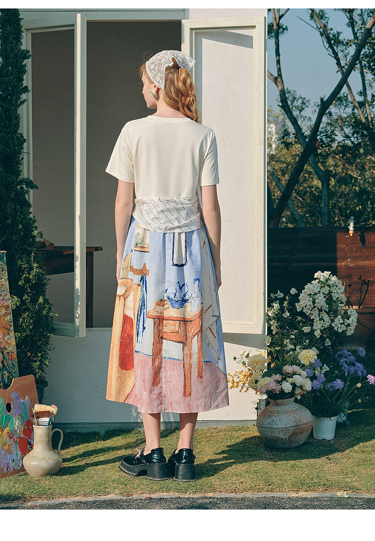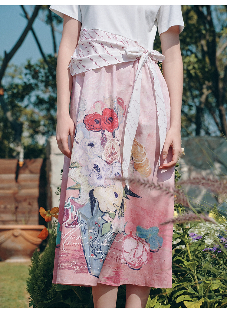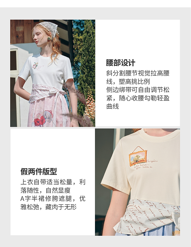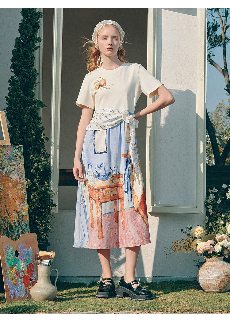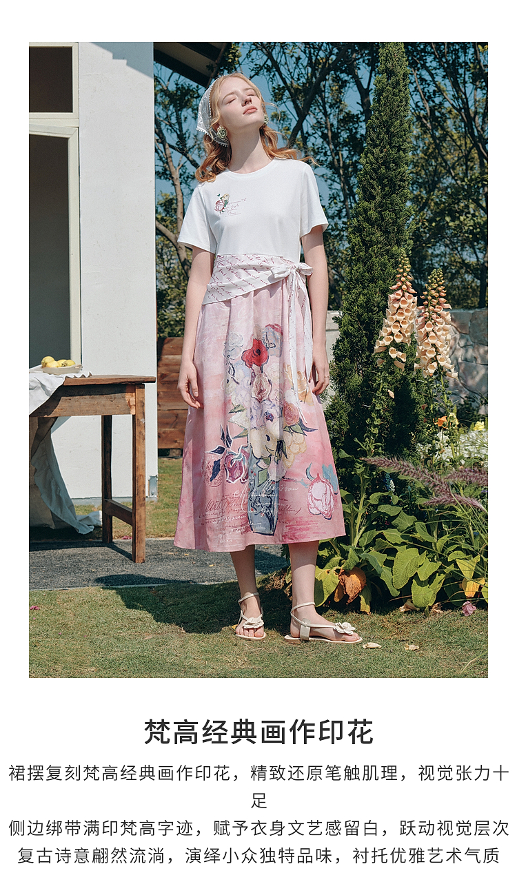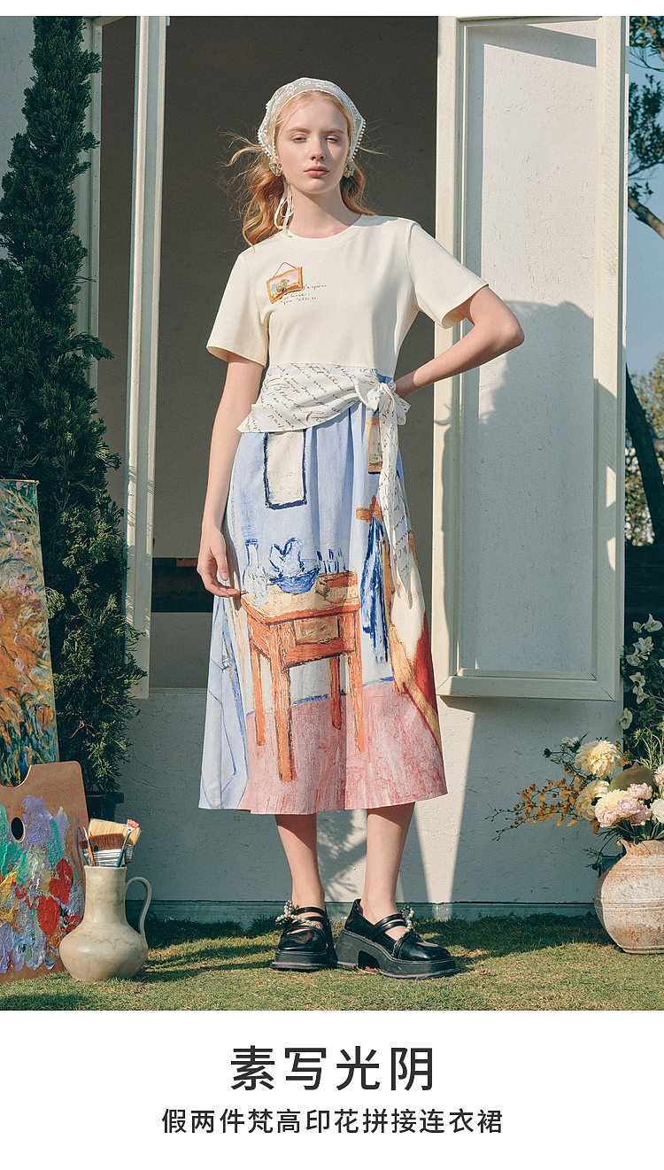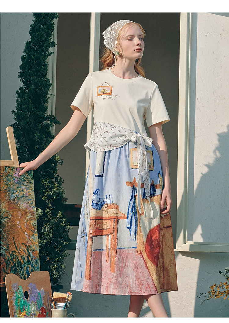 两三事梵高文艺 素写光阴 2026夏季新款印花拼接绑带假两件连衣裙