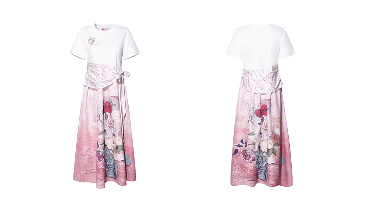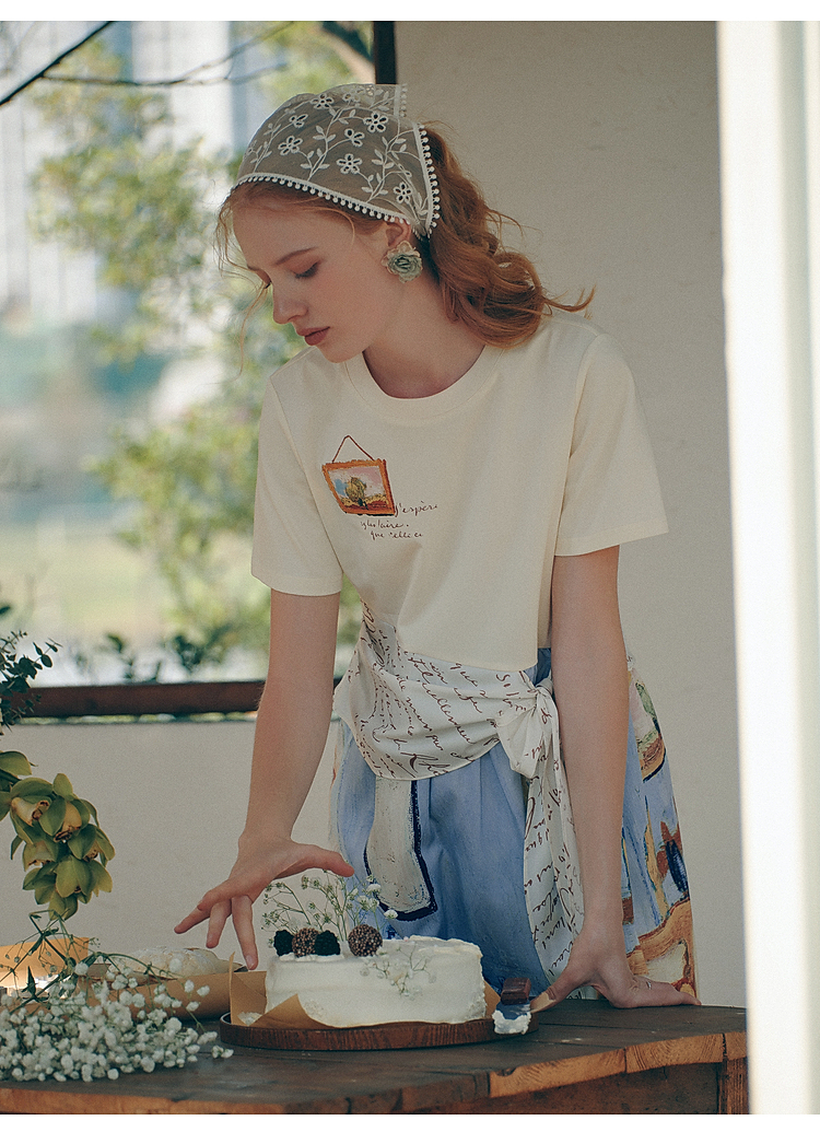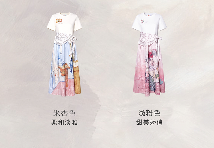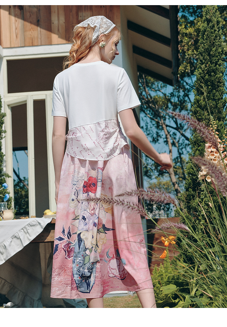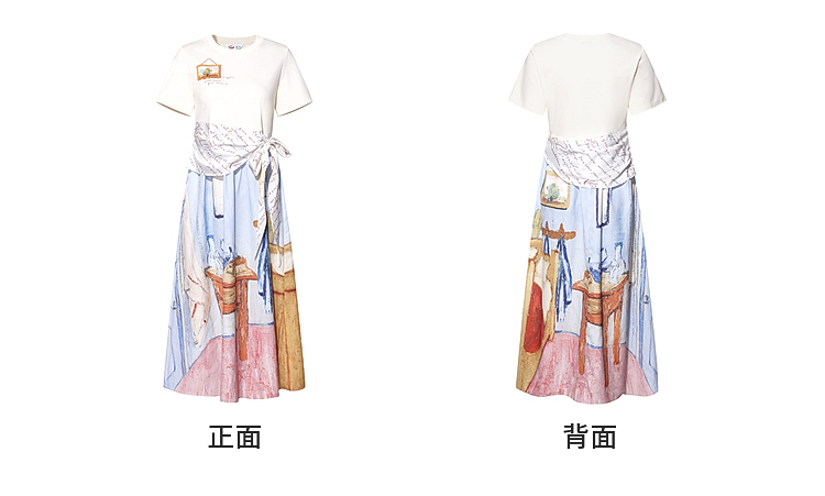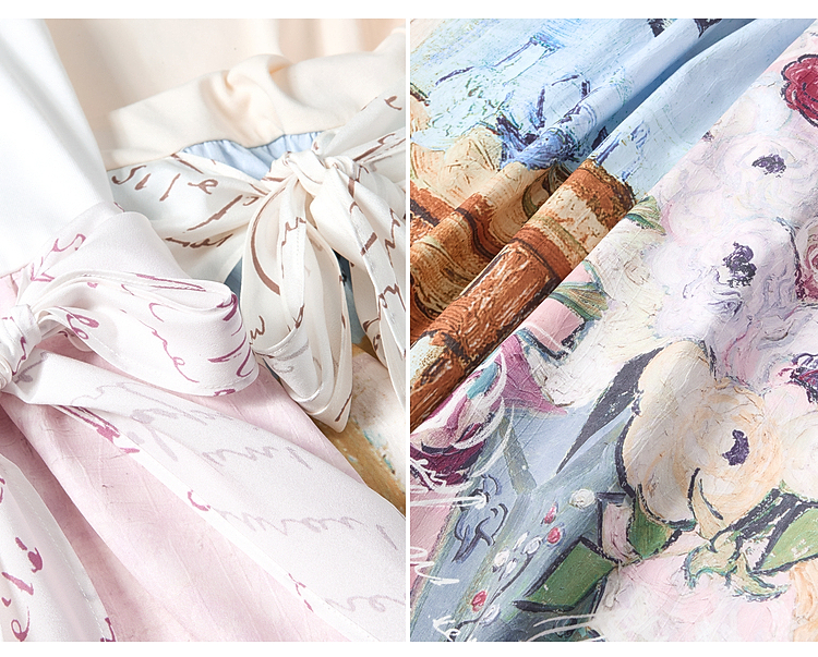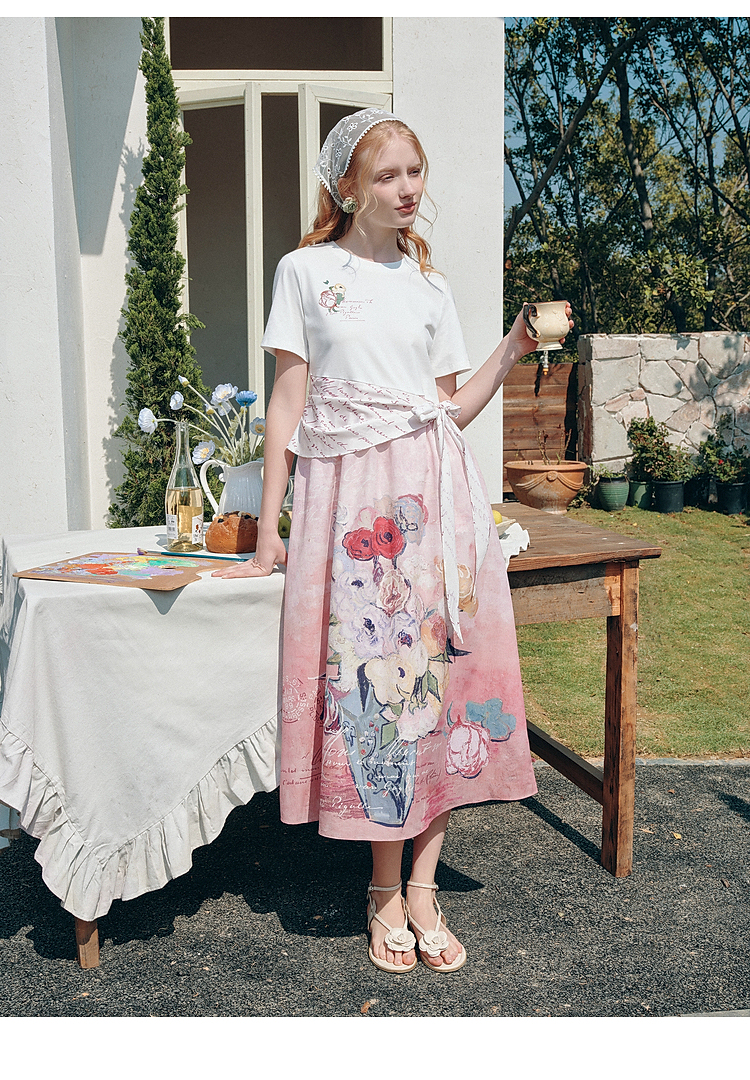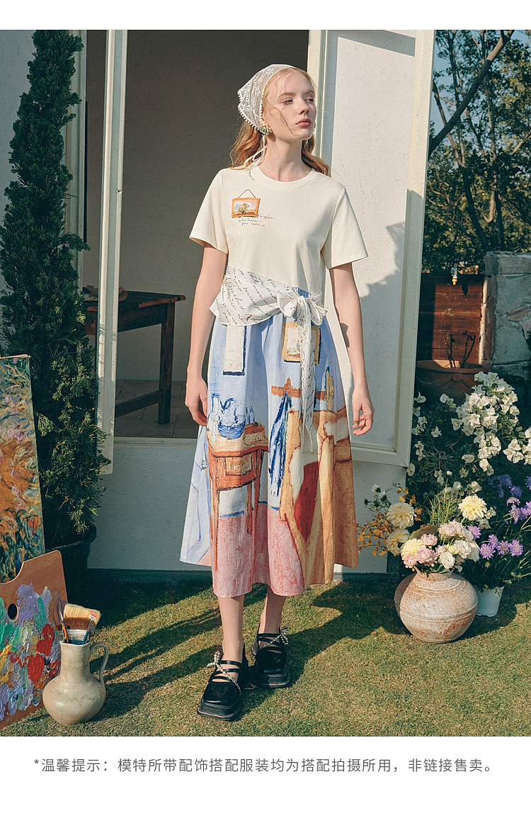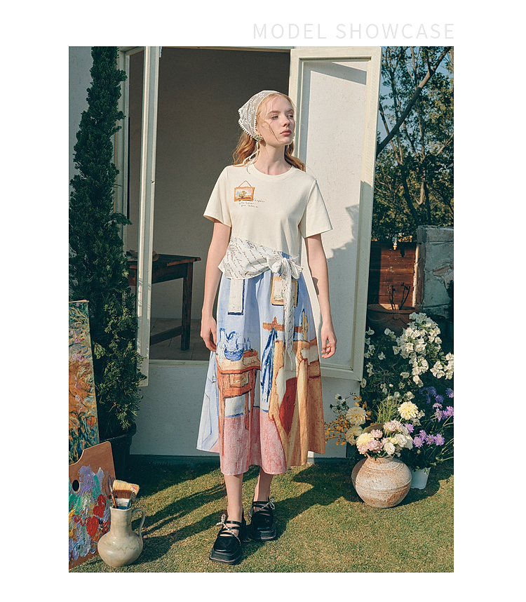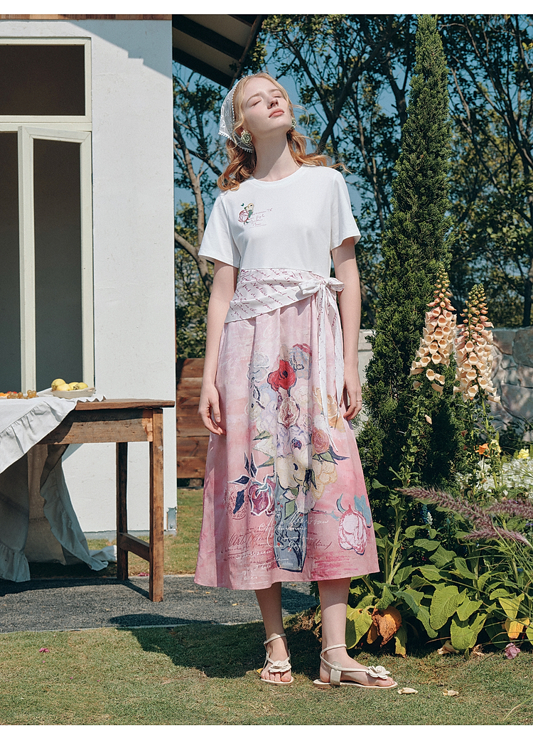 两三事梵高文艺 素写光阴 2026夏季新款印花拼接绑带假两件连衣裙