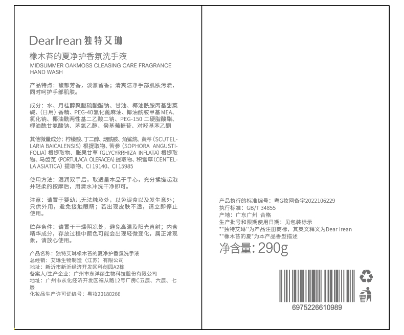 Dear lrean独特艾琳·香氛洗手液-方瓶 290ml/瓶【YW】