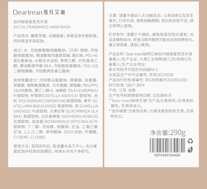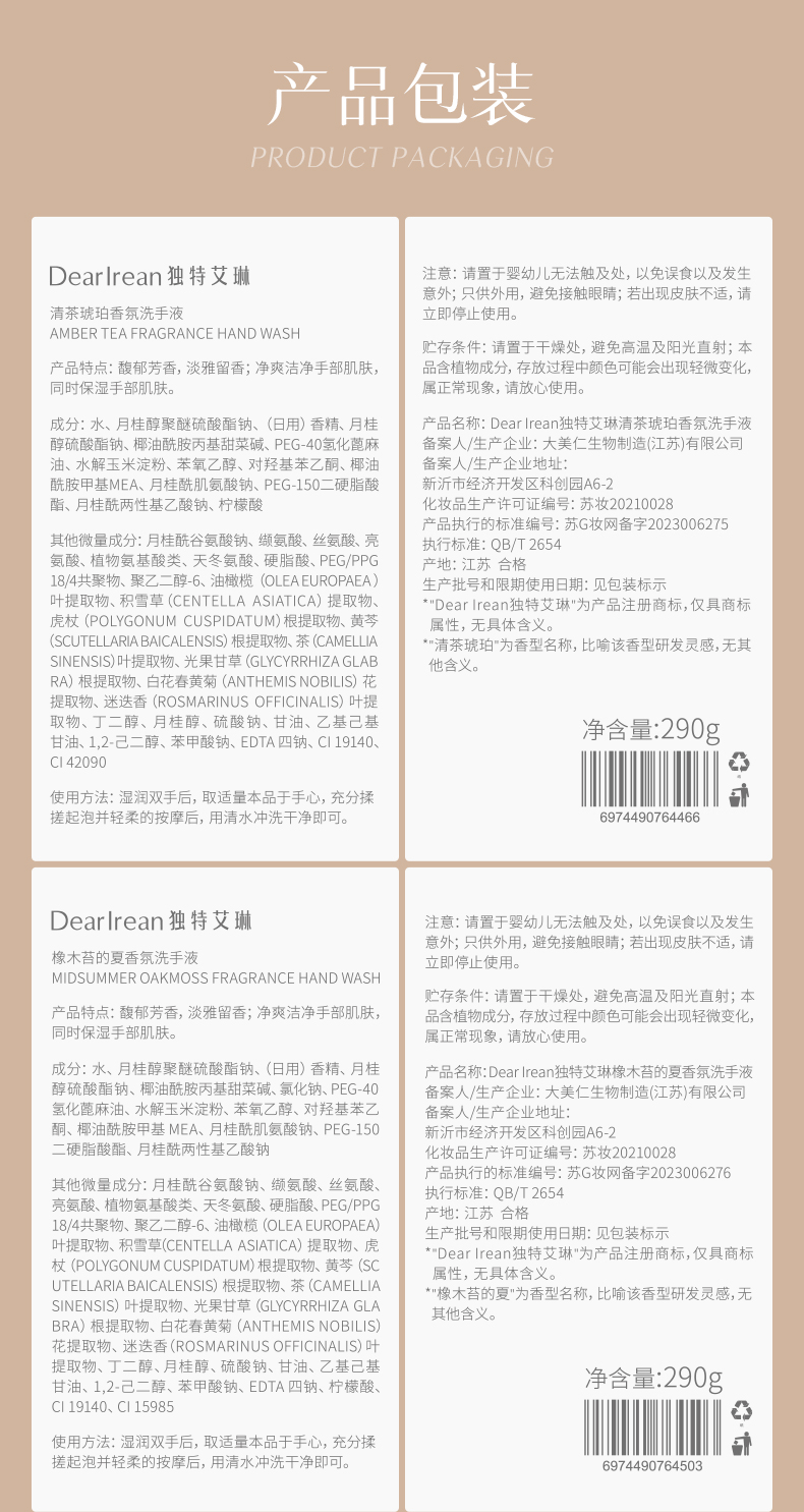 Dear lrean独特艾琳·香氛洗手液-方瓶 290ml/瓶*2【YW】