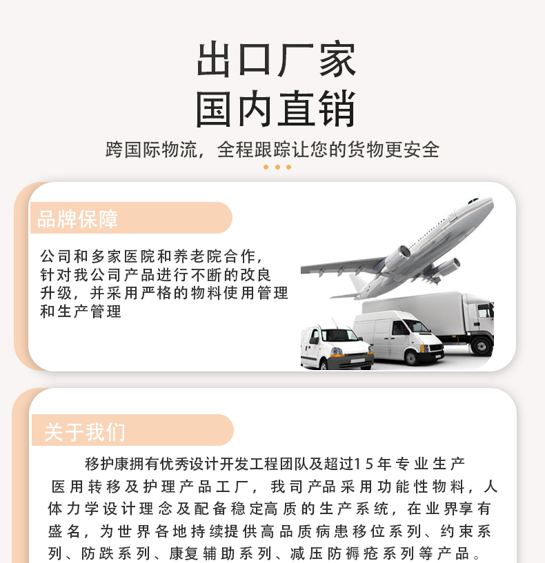 移护康养老用品生产厂家,旗下品牌:移互康专业销售老人转移及日常护理系列产品,包括移位机吊具,转移床垫,防褥疮脚套 ,防抓伤手套,扶抱腰带,长者餐具等产品 。