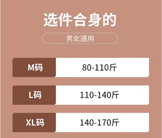 尺码:M码(适合80-110斤);L码(适合110-140斤);XL(适合140-170斤)