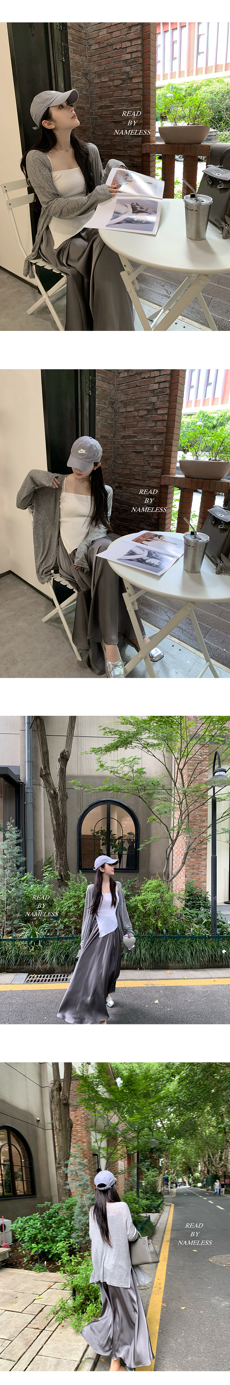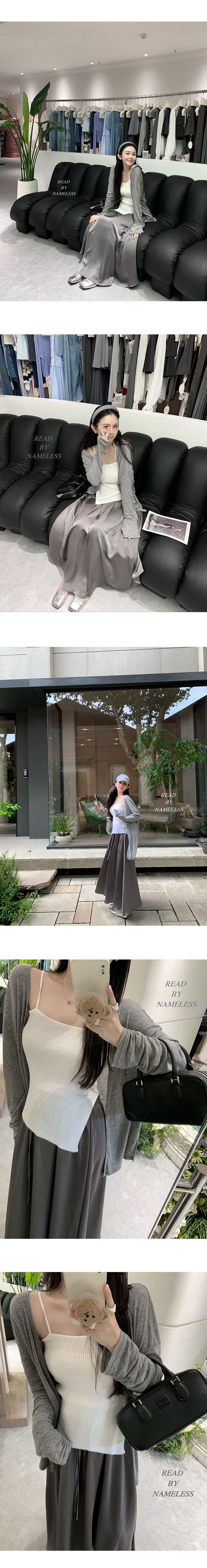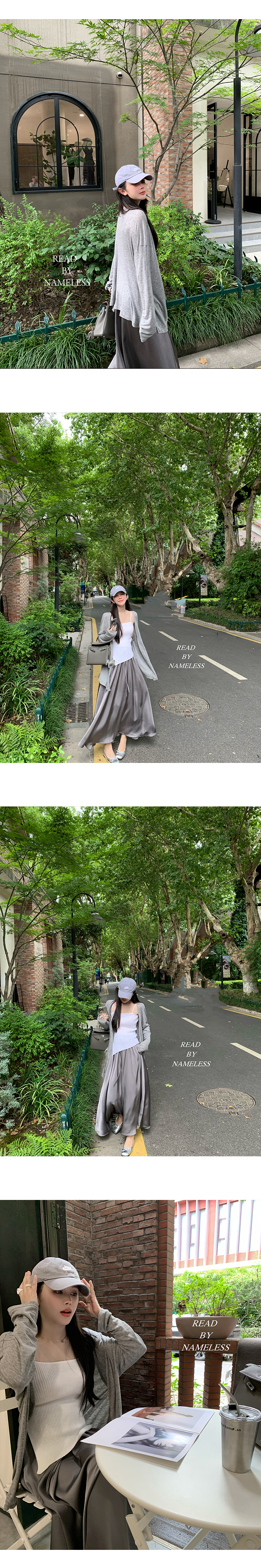 Read Nameless /灰色天丝羊毛超薄开衫+白色斜开衩吊带+灰色缎面松紧腰伞裙