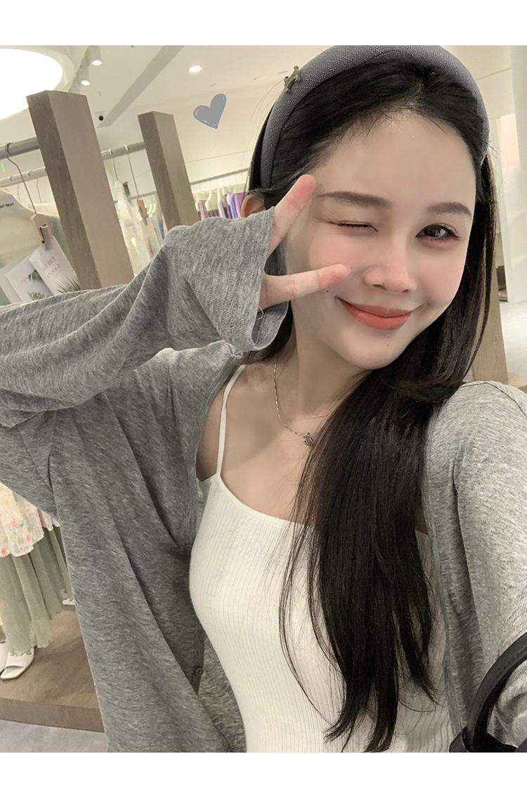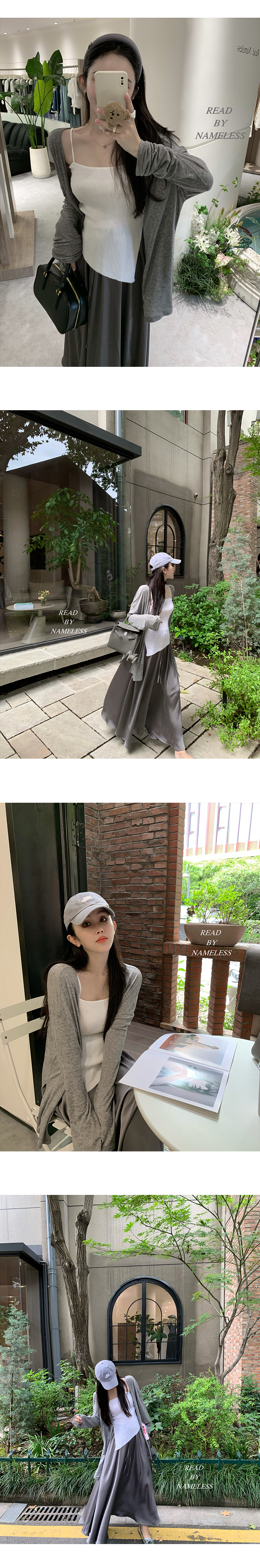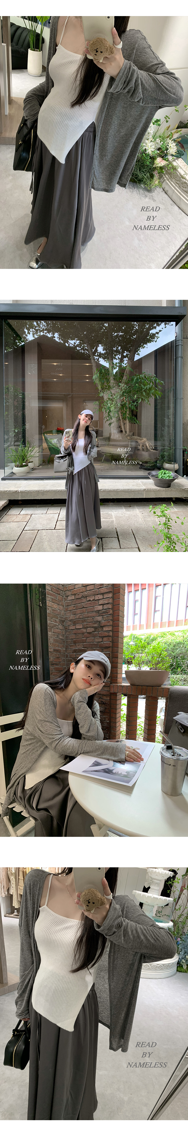 Read Nameless /灰色天丝羊毛超薄开衫+白色斜开衩吊带+灰色缎面松紧腰伞裙