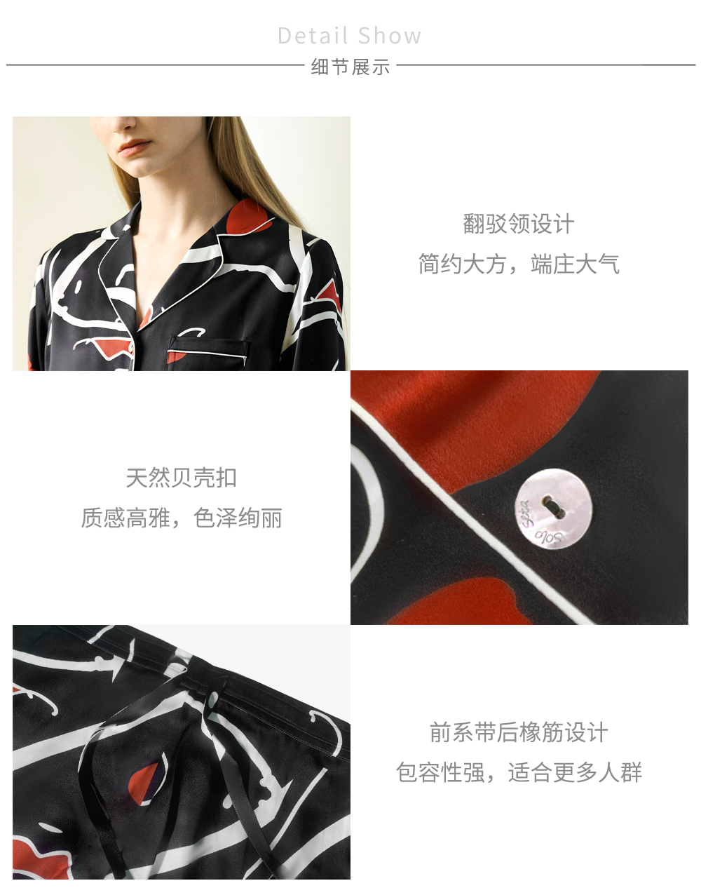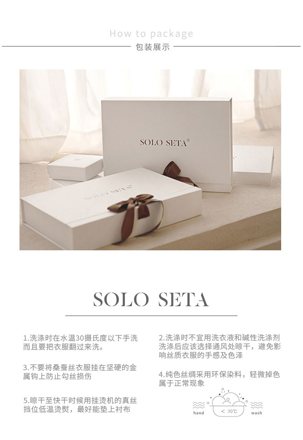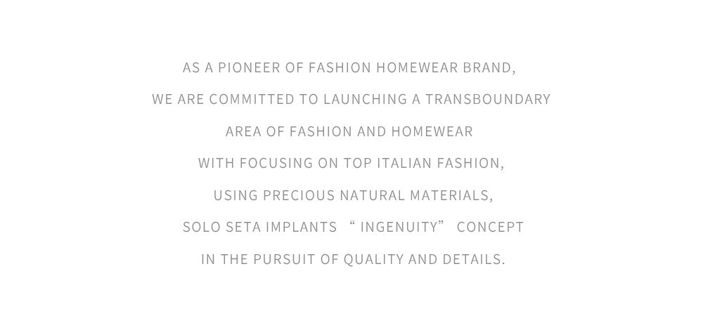 - soloseta专注于真丝织物,灵感源自意大利语,中文含义为“只做真丝”的意思。让睡衣变时尚,居家和外出瞬间切换,使其更具有出街,度假,参加宴会等功能。