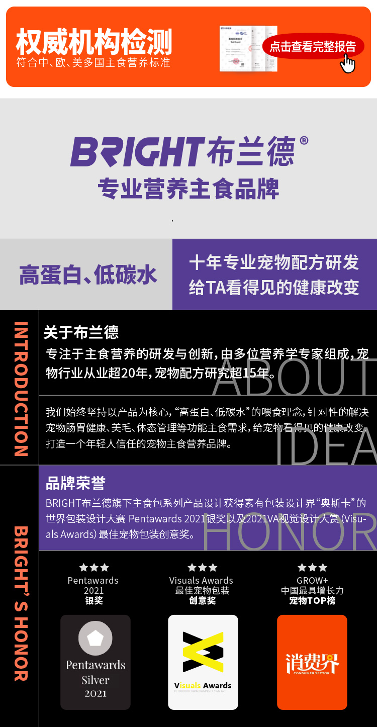 布兰德是一家专注于宠物主食的营养研发与创新的宠物公司,由多位营养学专家共同创立,创始团队成员宠物行业从业超15年,宠物配方研究超10年。布兰德始终坚持“科学有料,专业宠粮的”的产品理念,希望能给宠物看