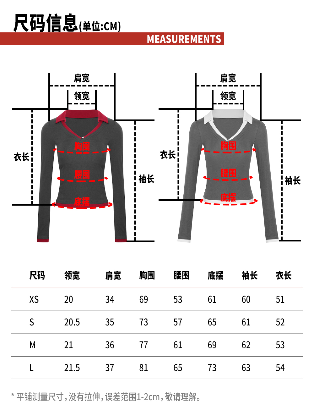 TR她热 时尚学院 灰白灰红撞色假两件修身带胸垫翻领打底衫上衣