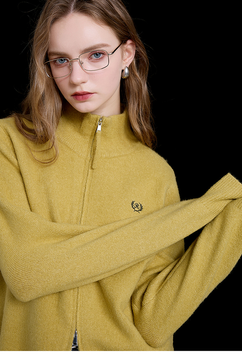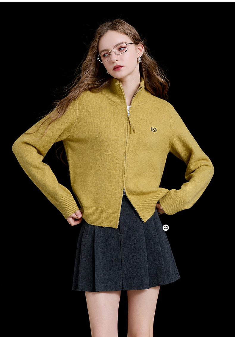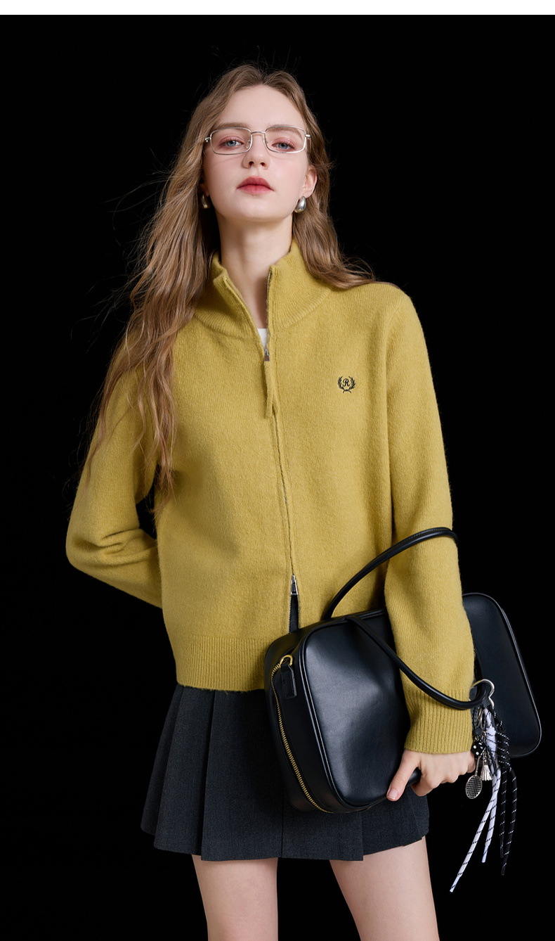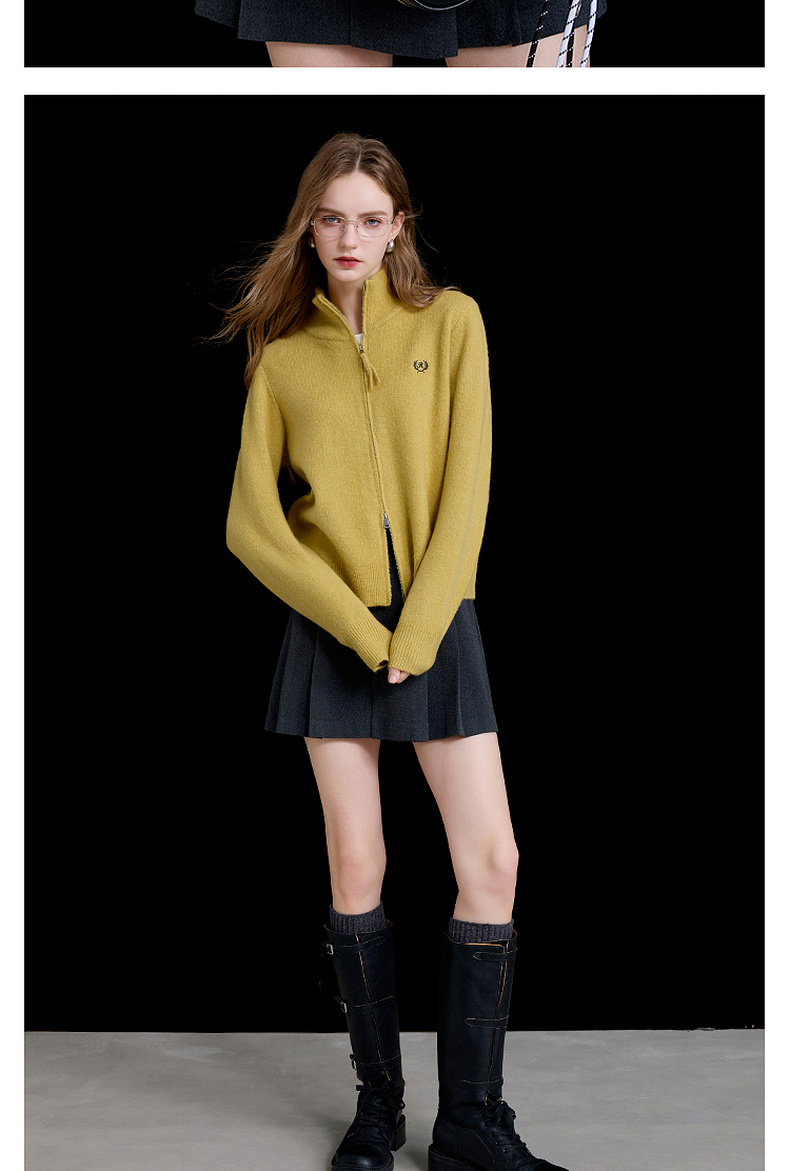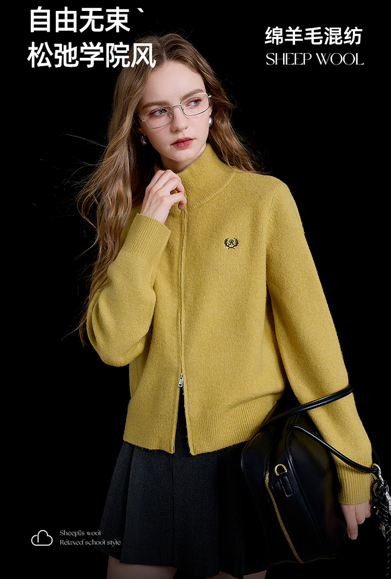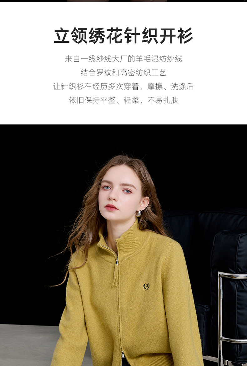 三彩2025冬季新款绣花立领针织衫宽松长袖拉链开衫简约毛衫M