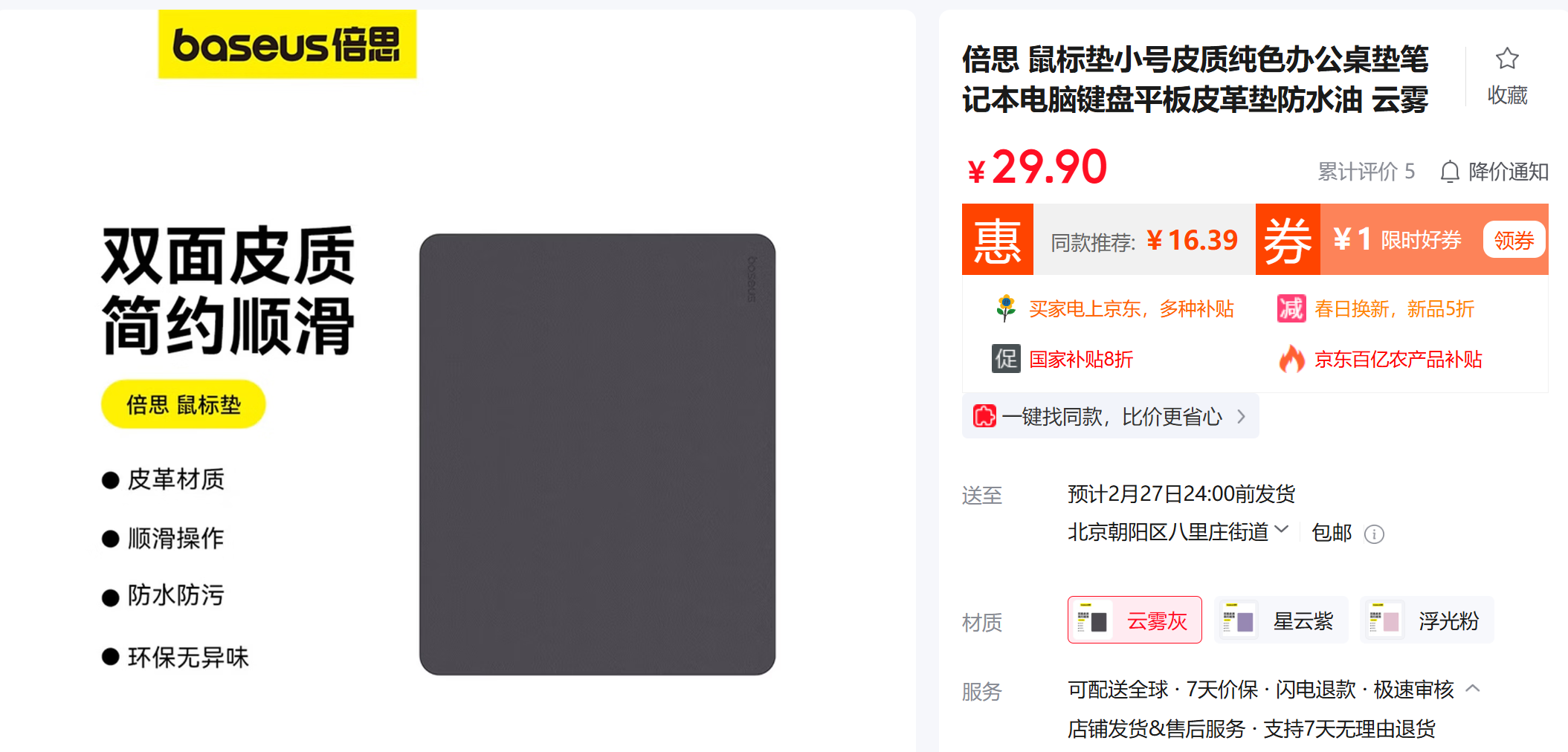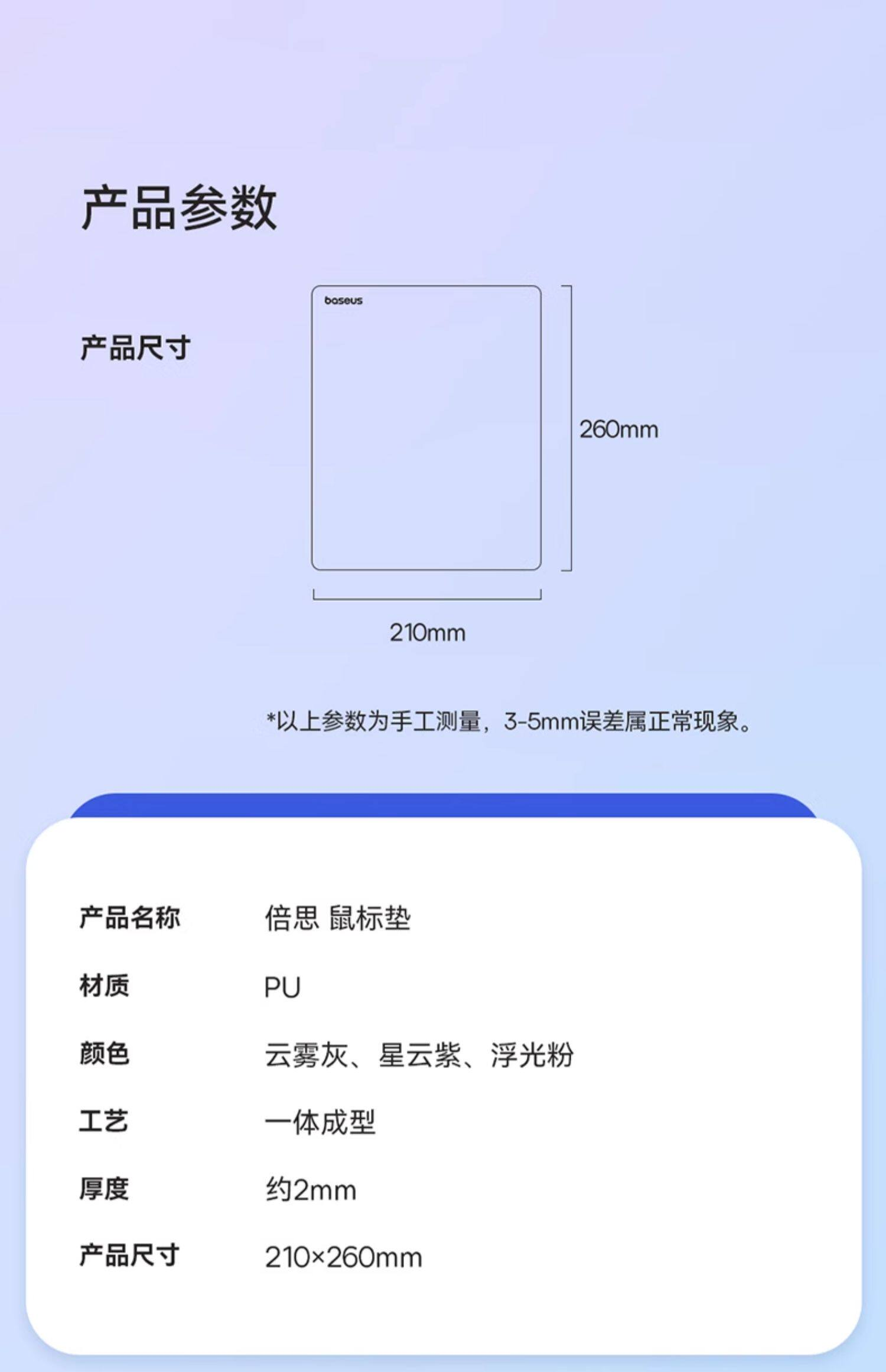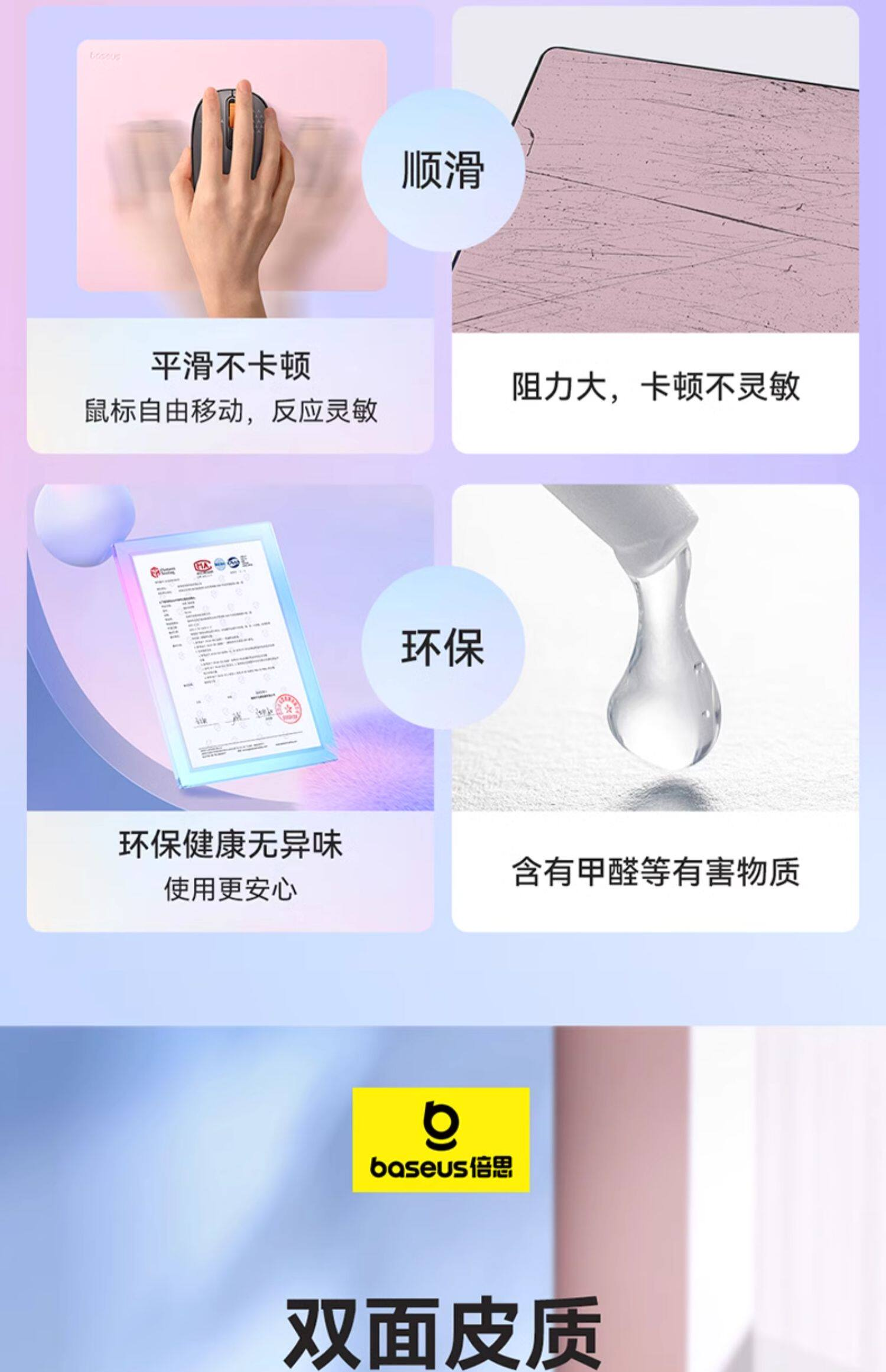 【天猫销量2W+】倍思 双面皮质纯色鼠标垫 顺滑操作 防水防污 小号 210x260mm