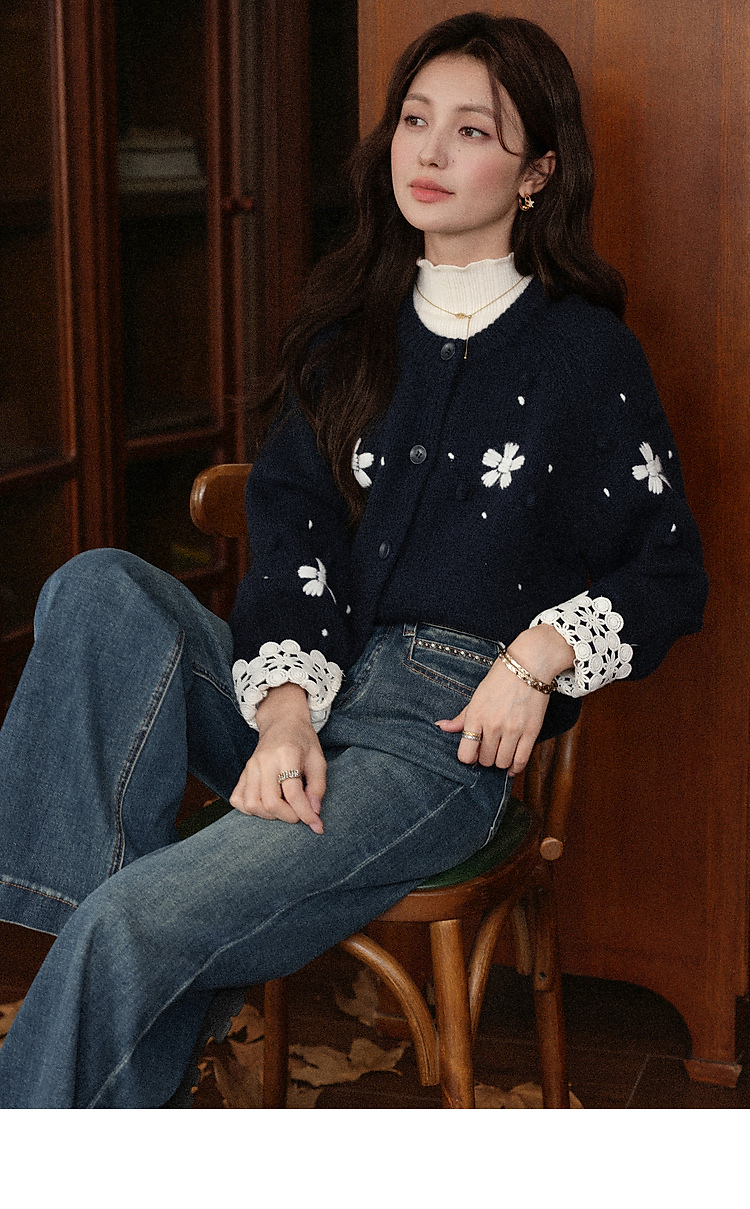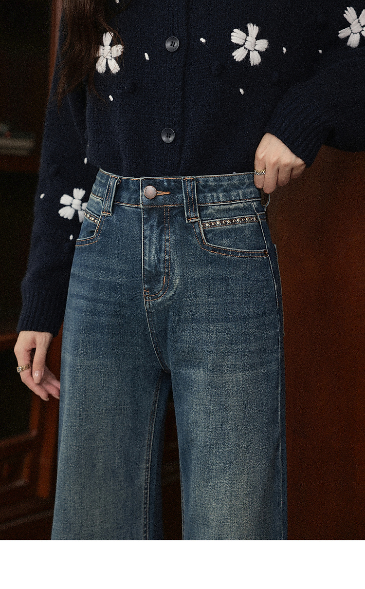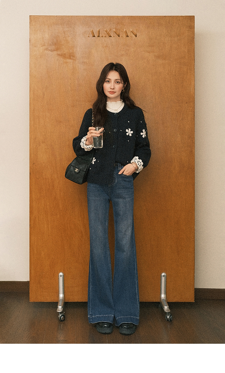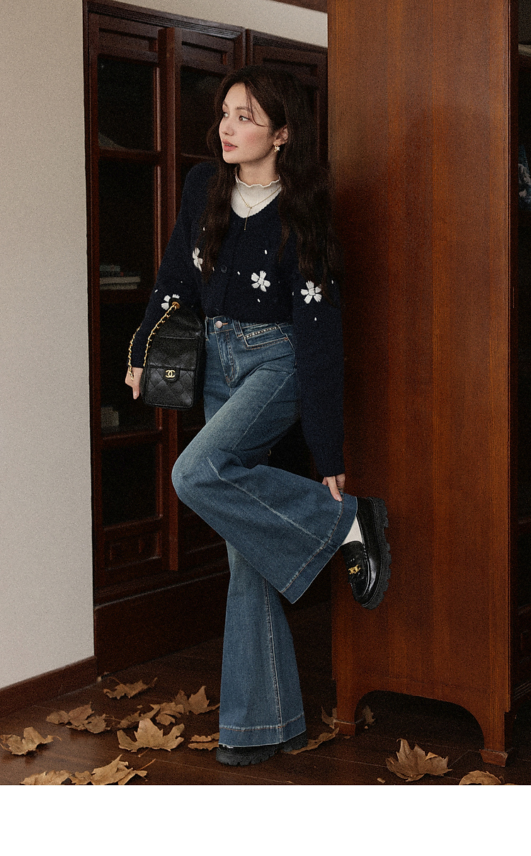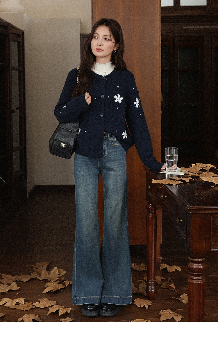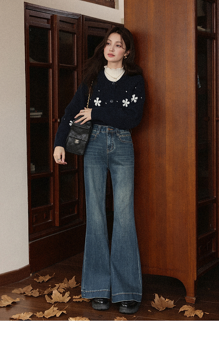 鹿向南「霓甜巴黎」蓝色宽松微喇牛仔裤初秋修身显瘦阔腿长裤女款