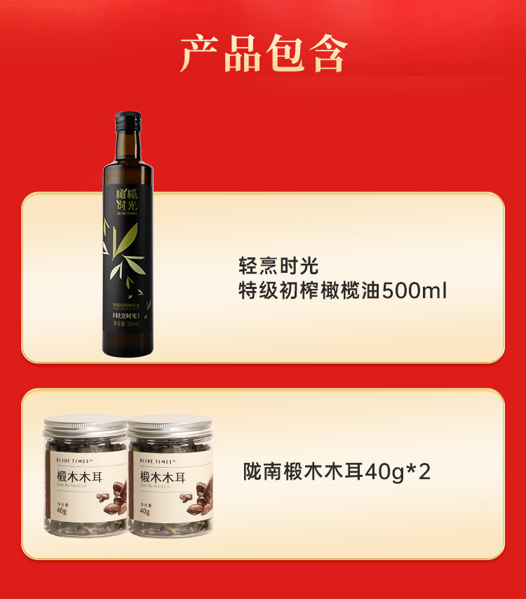 【不饱和脂肪酸】橄榄时光陇南印象橄榄油礼盒500ml+80g椴木木耳