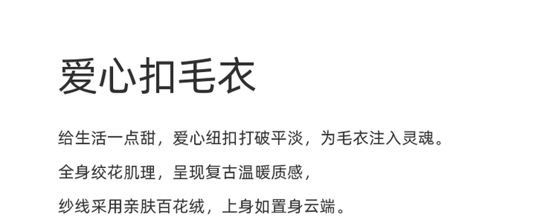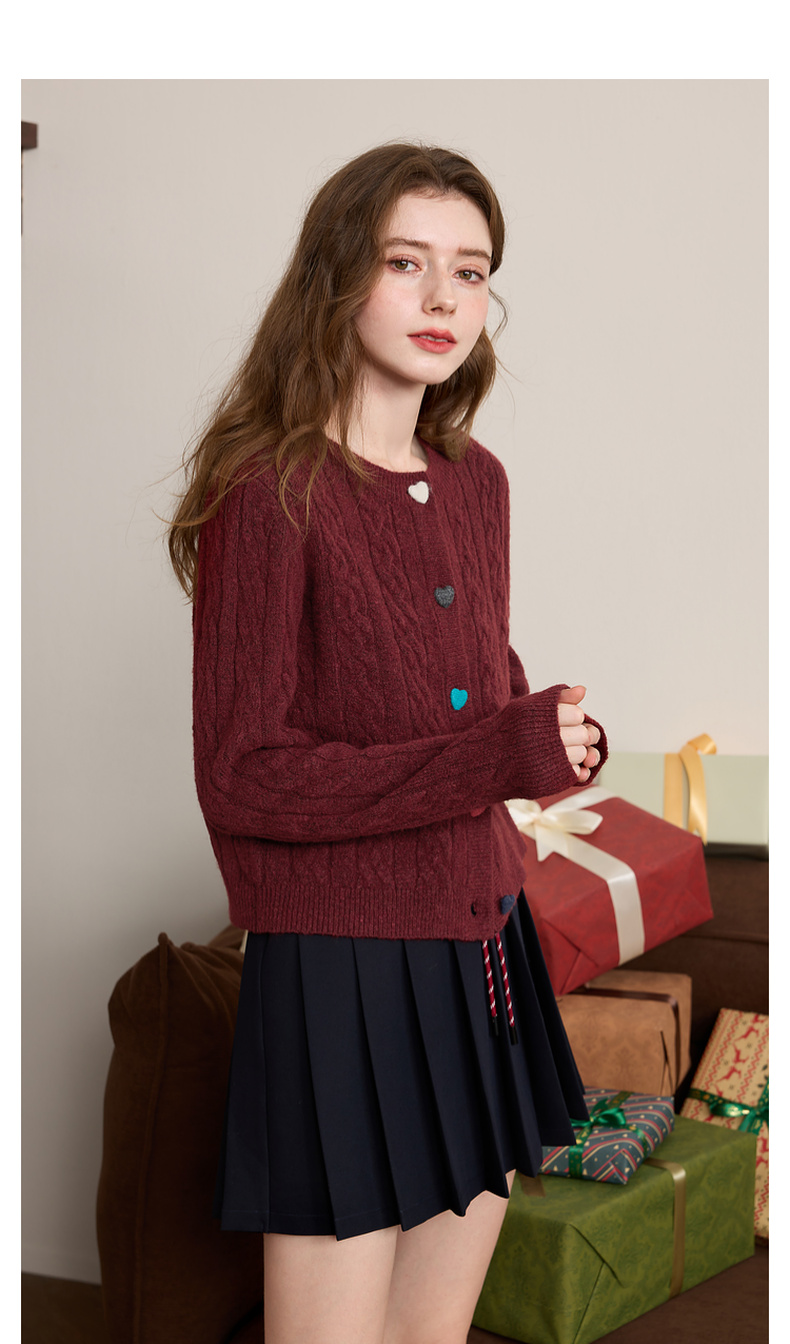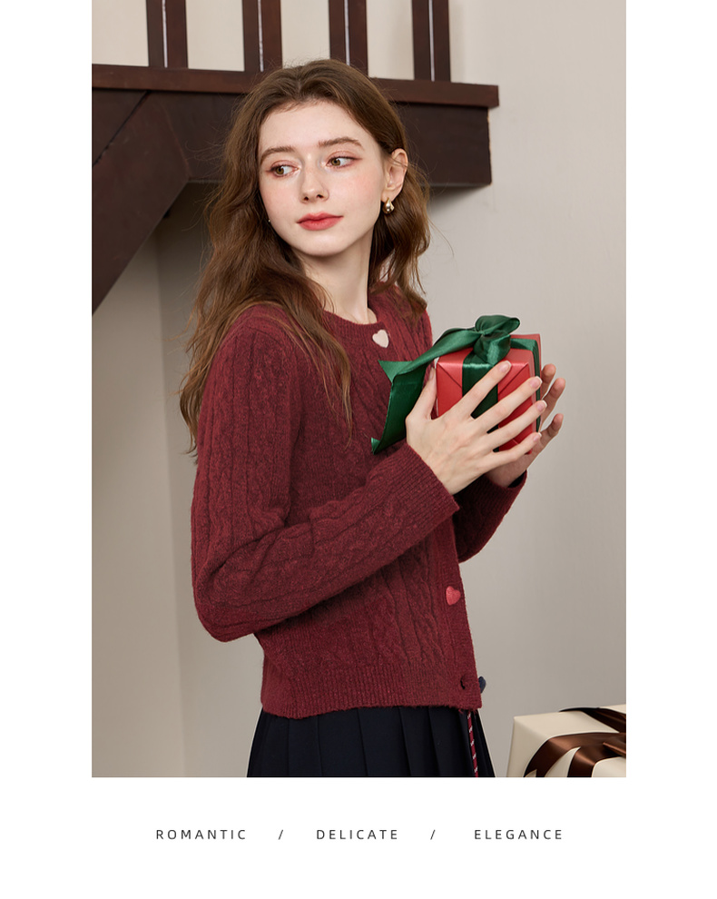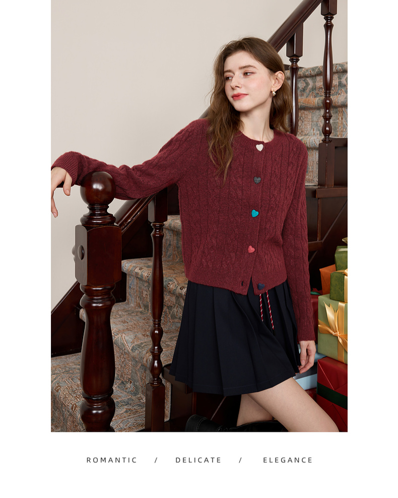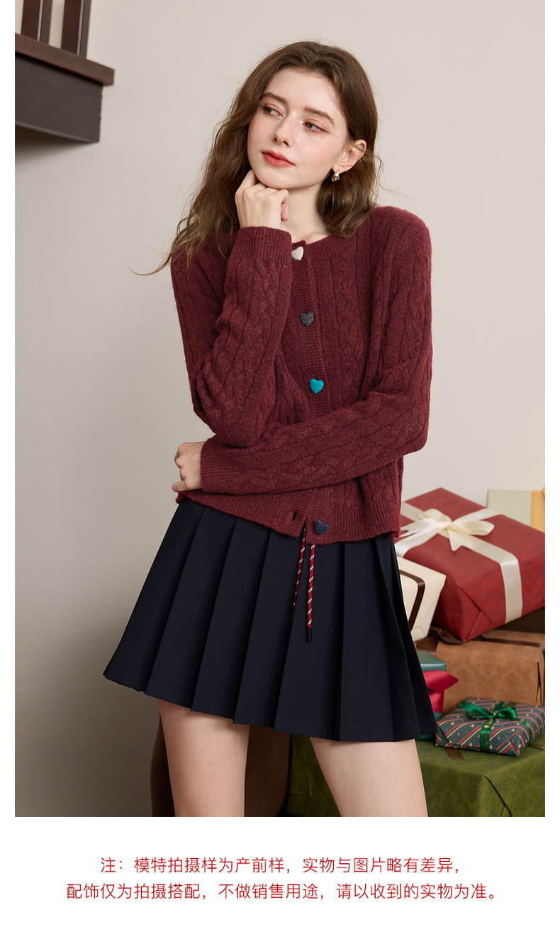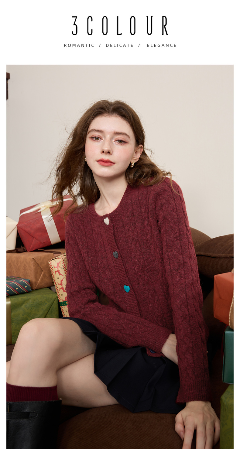 三彩2026春季新款绞花外套开衫爱心纽扣针织衫圆领毛衫复古M