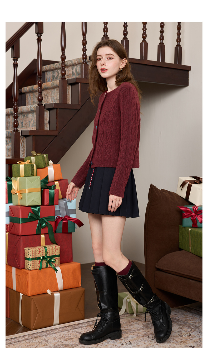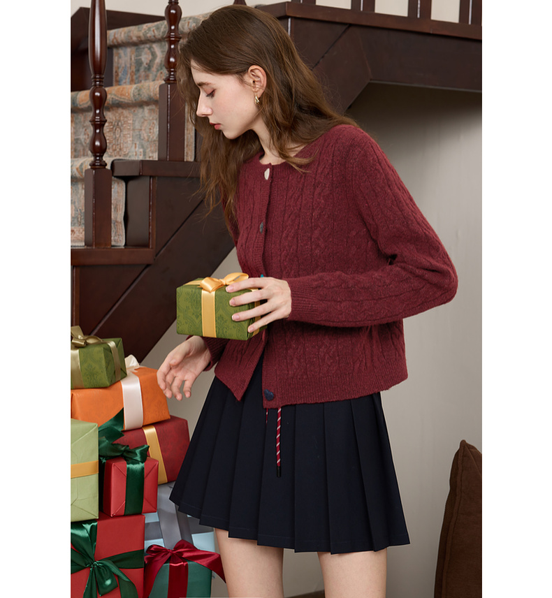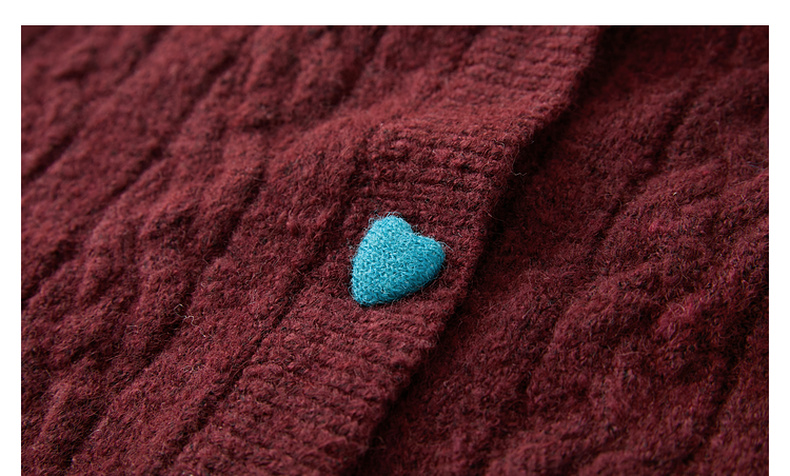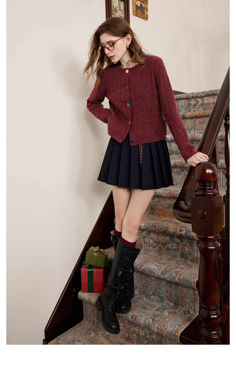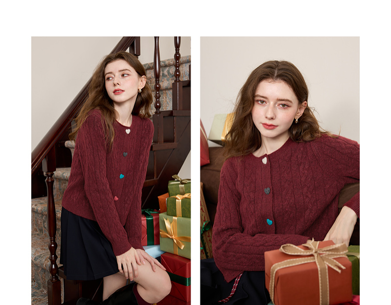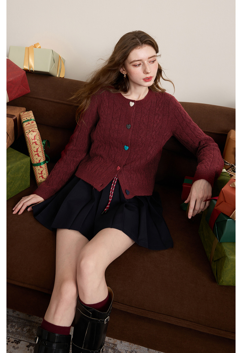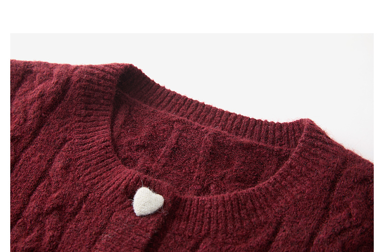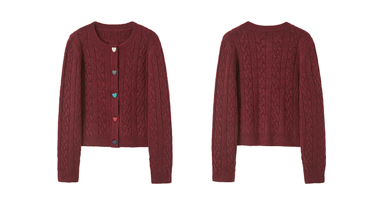 三彩2026春季新款绞花外套开衫爱心纽扣针织衫圆领毛衫复古M
