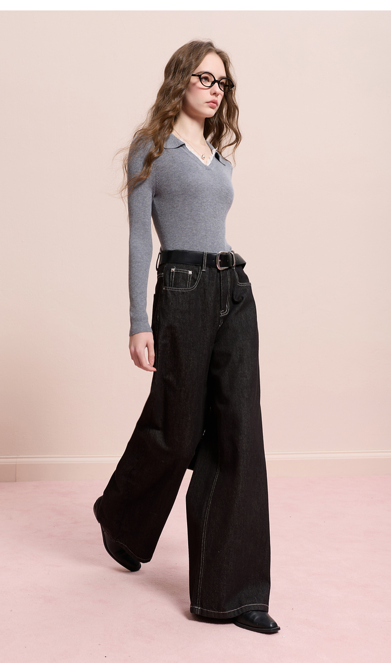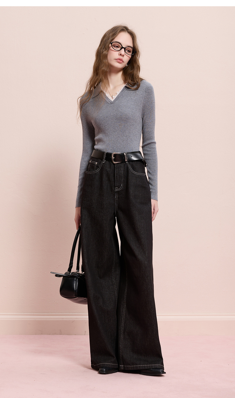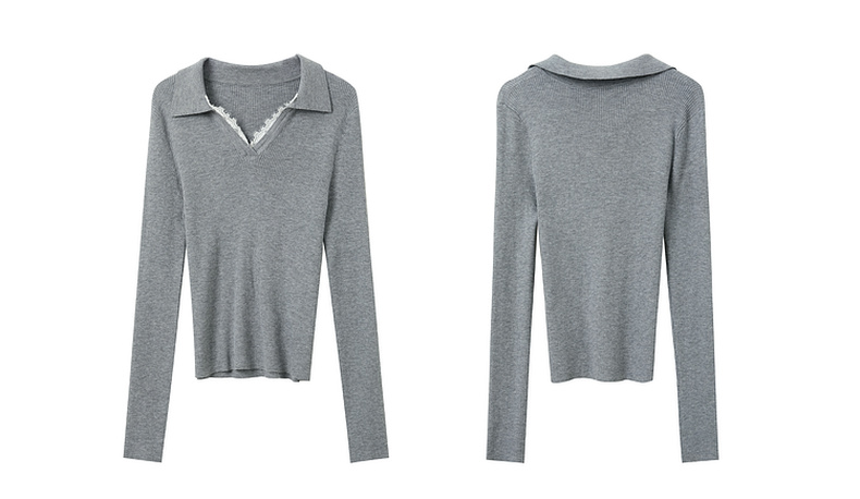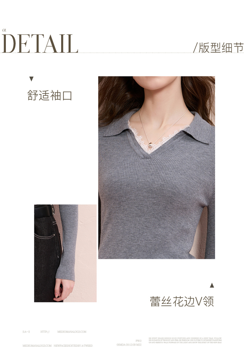 三彩2025冬季新款修身蕾丝花边V领针织衫长袖套头上衣显瘦百搭M