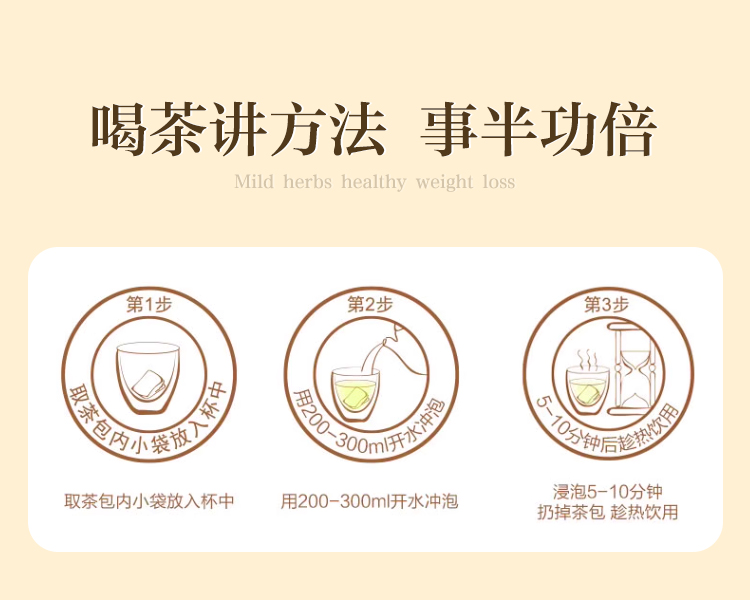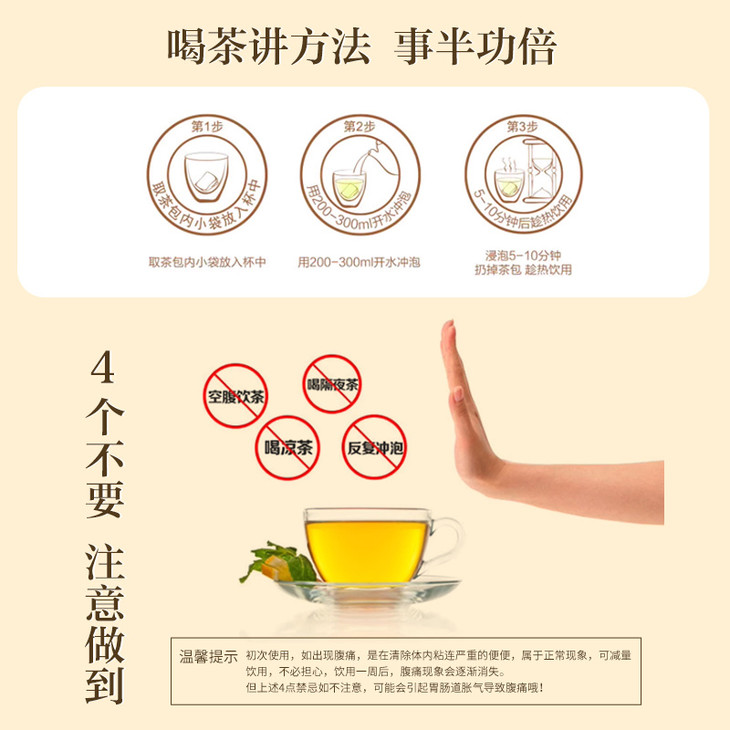 【温馨提示】第一步:取茶包内小袋放入杯中;第二步:用200-300ml开水冲泡;第三步:5-10分钟后趁热饮用