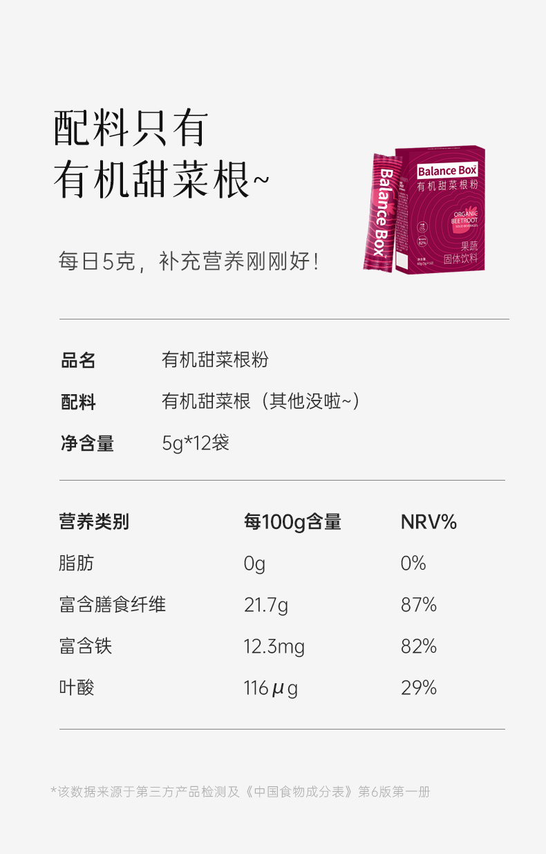 均衡小站 纯有机甜菜根粉 健身即食补冲饮 富含铁叶酸 蔬菜粉便携小包 5g*12袋