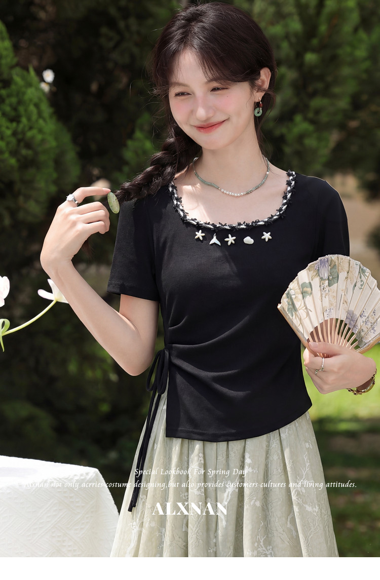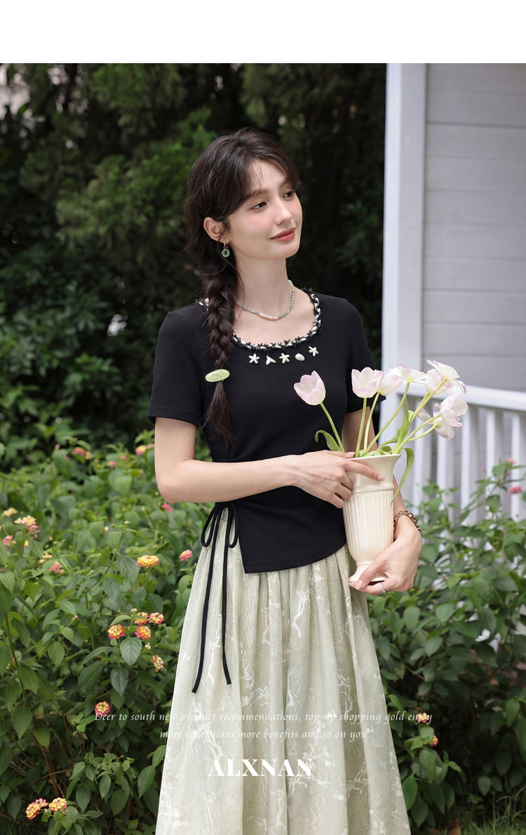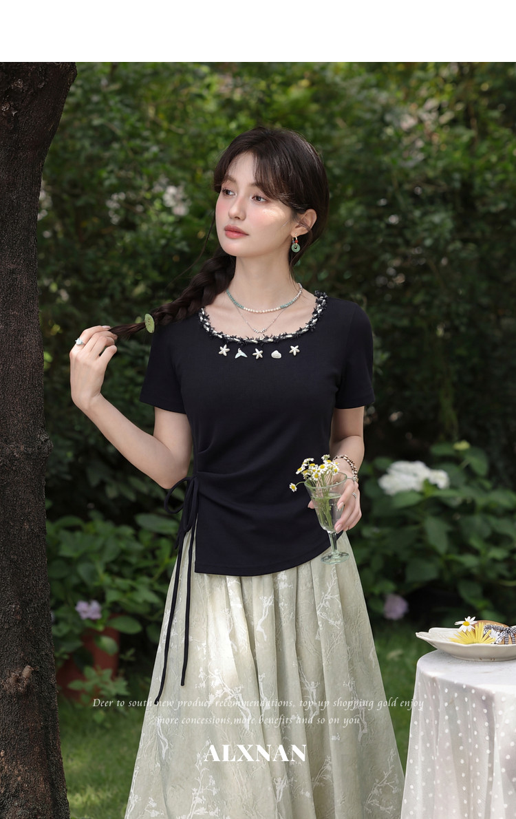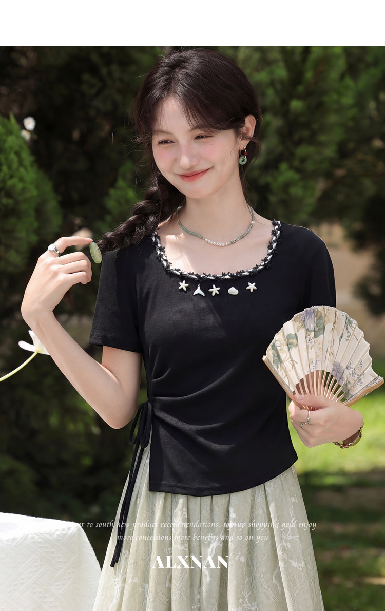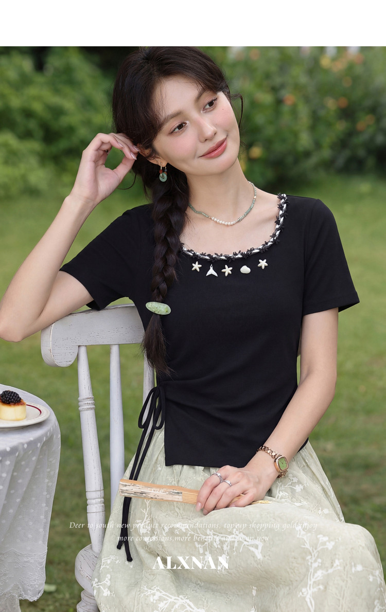 鹿向南「浅夏星眠」黑色气质方领短袖T恤女夏显瘦正肩设计感上衣