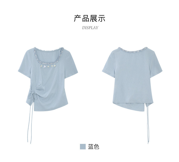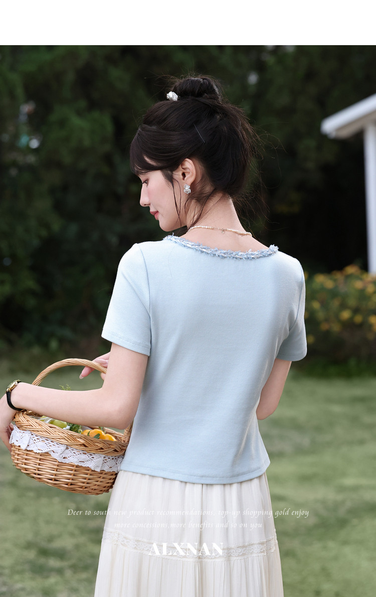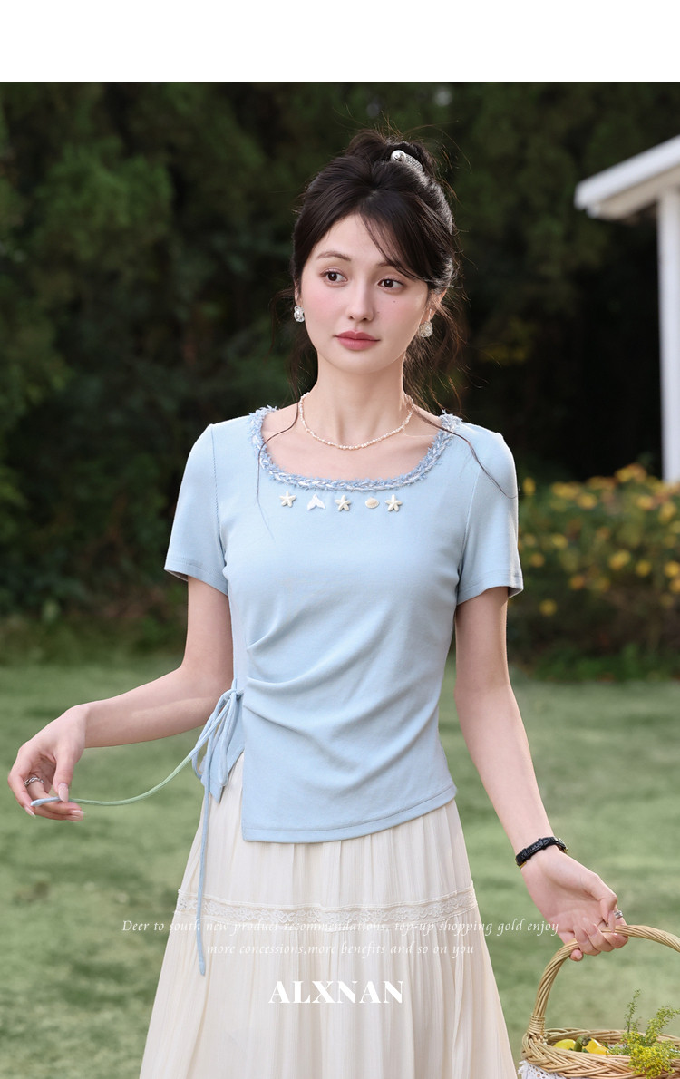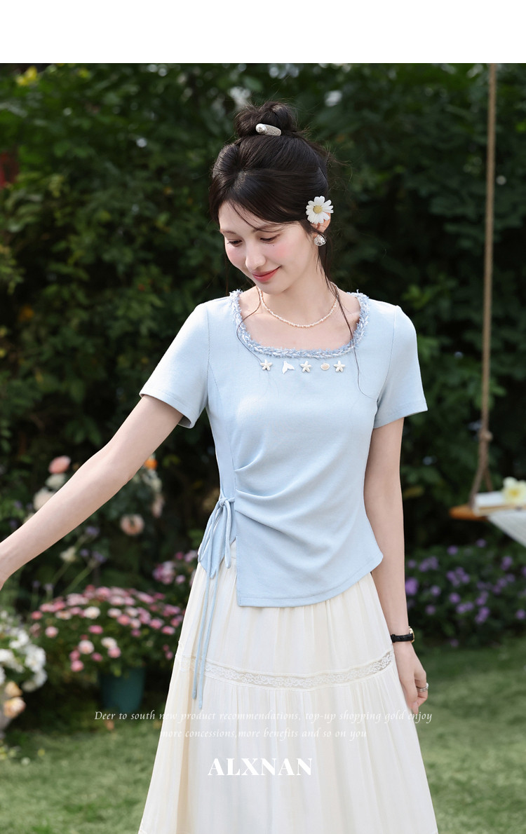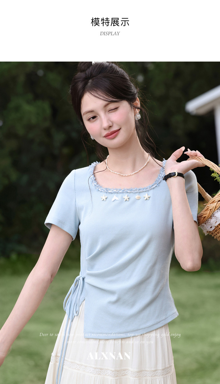 鹿向南「浅夏星眠」黑色气质方领短袖T恤女夏显瘦正肩设计感上衣