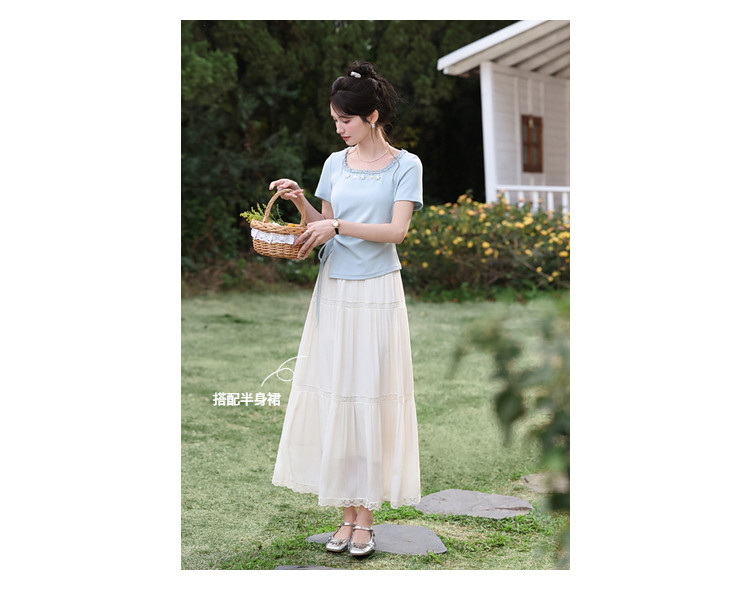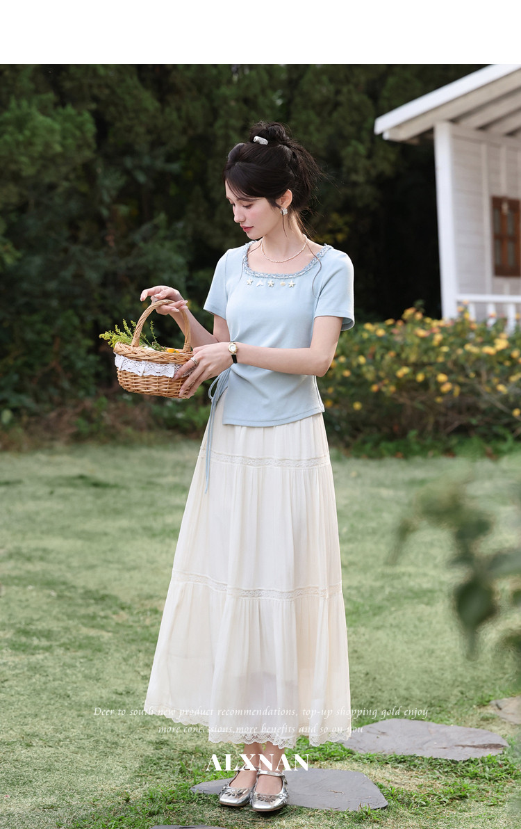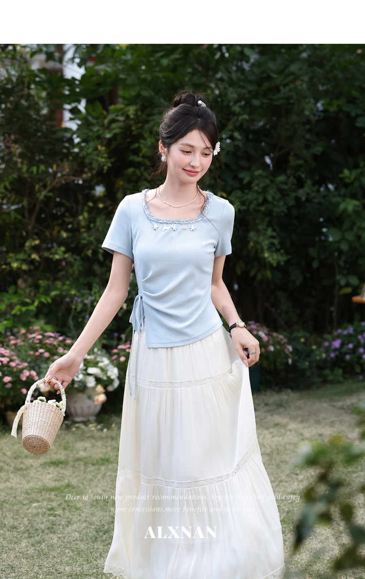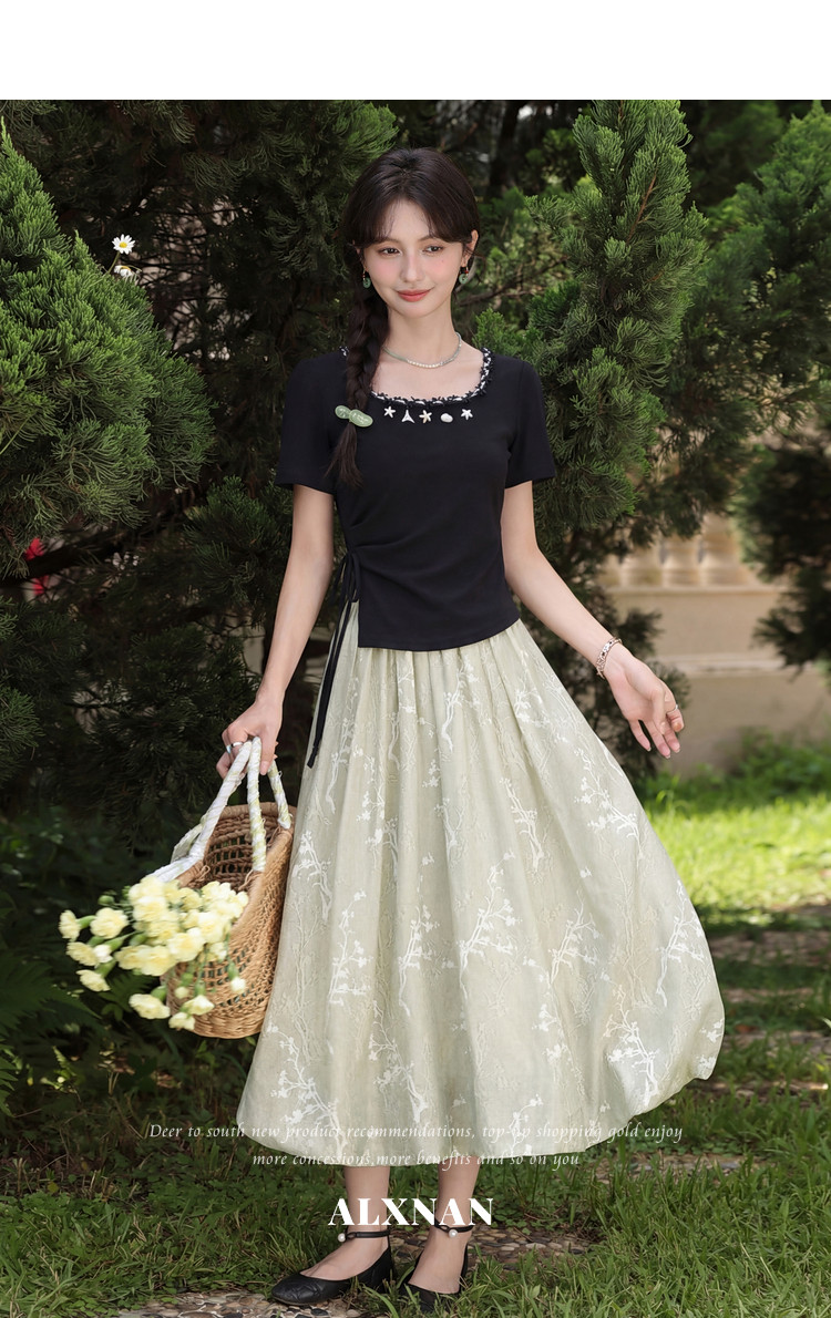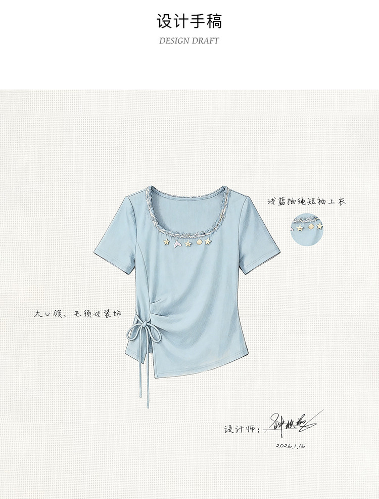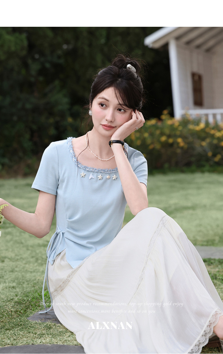 鹿向南「浅夏星眠」黑色气质方领短袖T恤女夏显瘦正肩设计感上衣