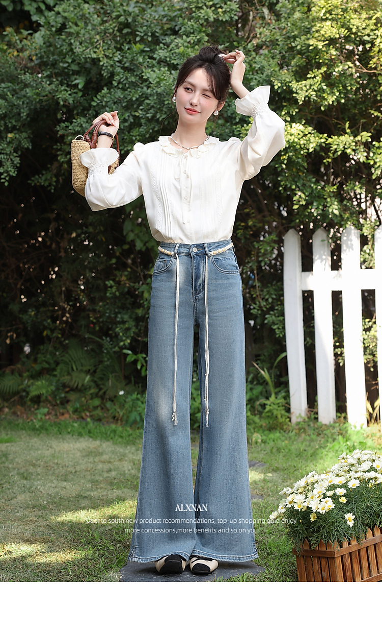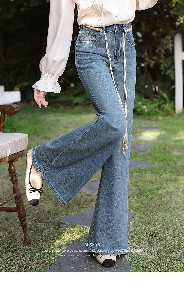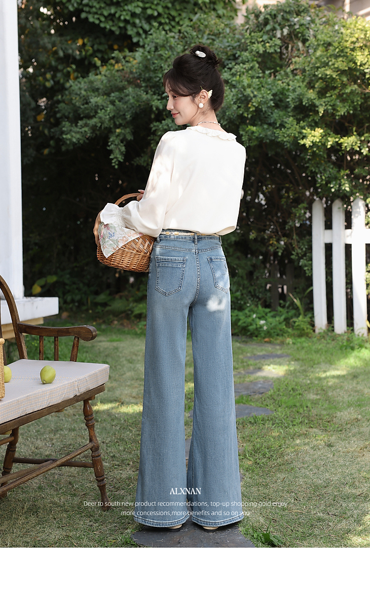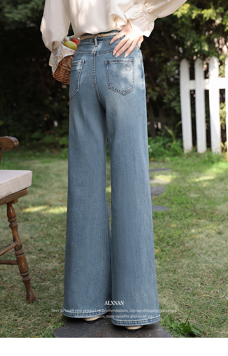 鹿向南「星落花海」蓝色牛仔裤女春季新款高腰宽松拖地长款裤子
