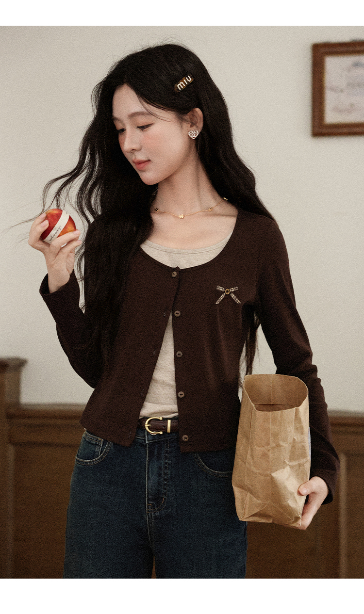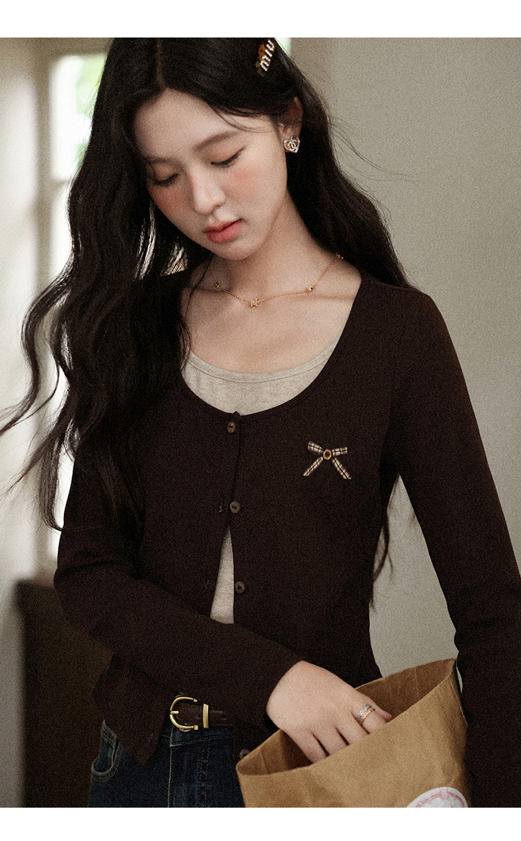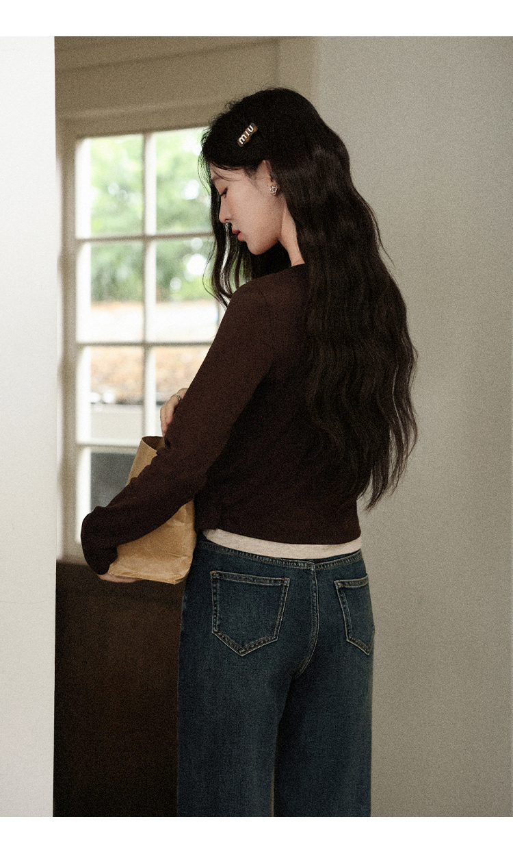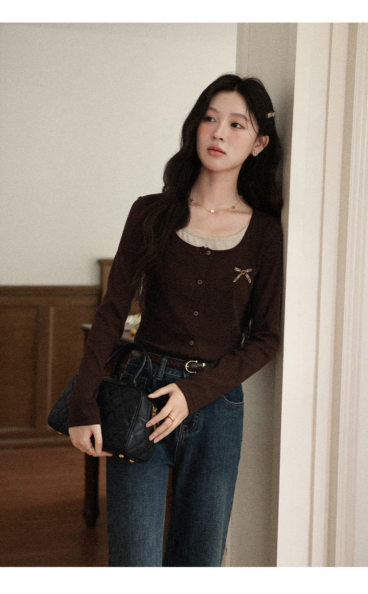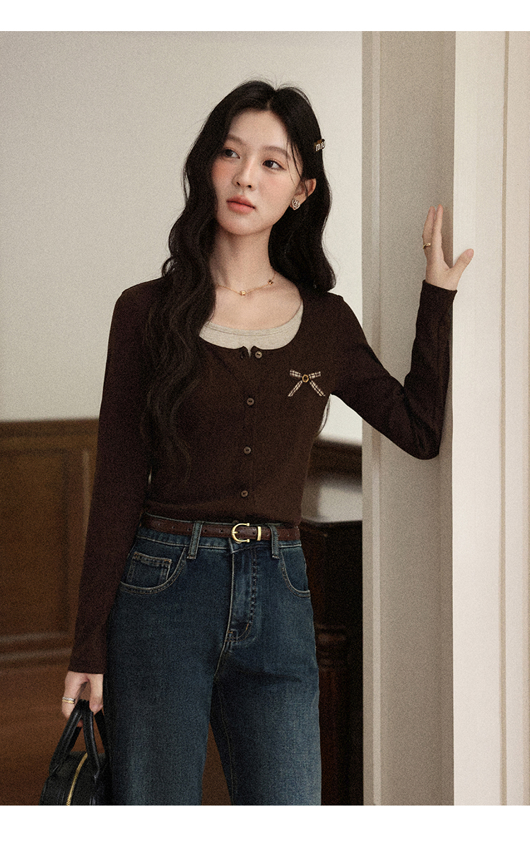 鹿向南「焦糖玛奇朵」假两件正肩长袖t恤女早秋修身短款咖色上衣
