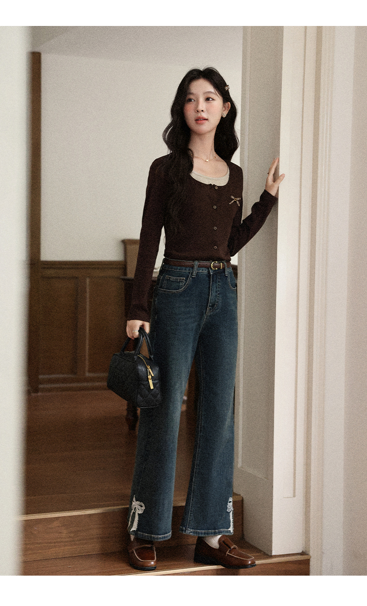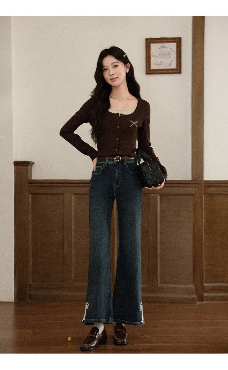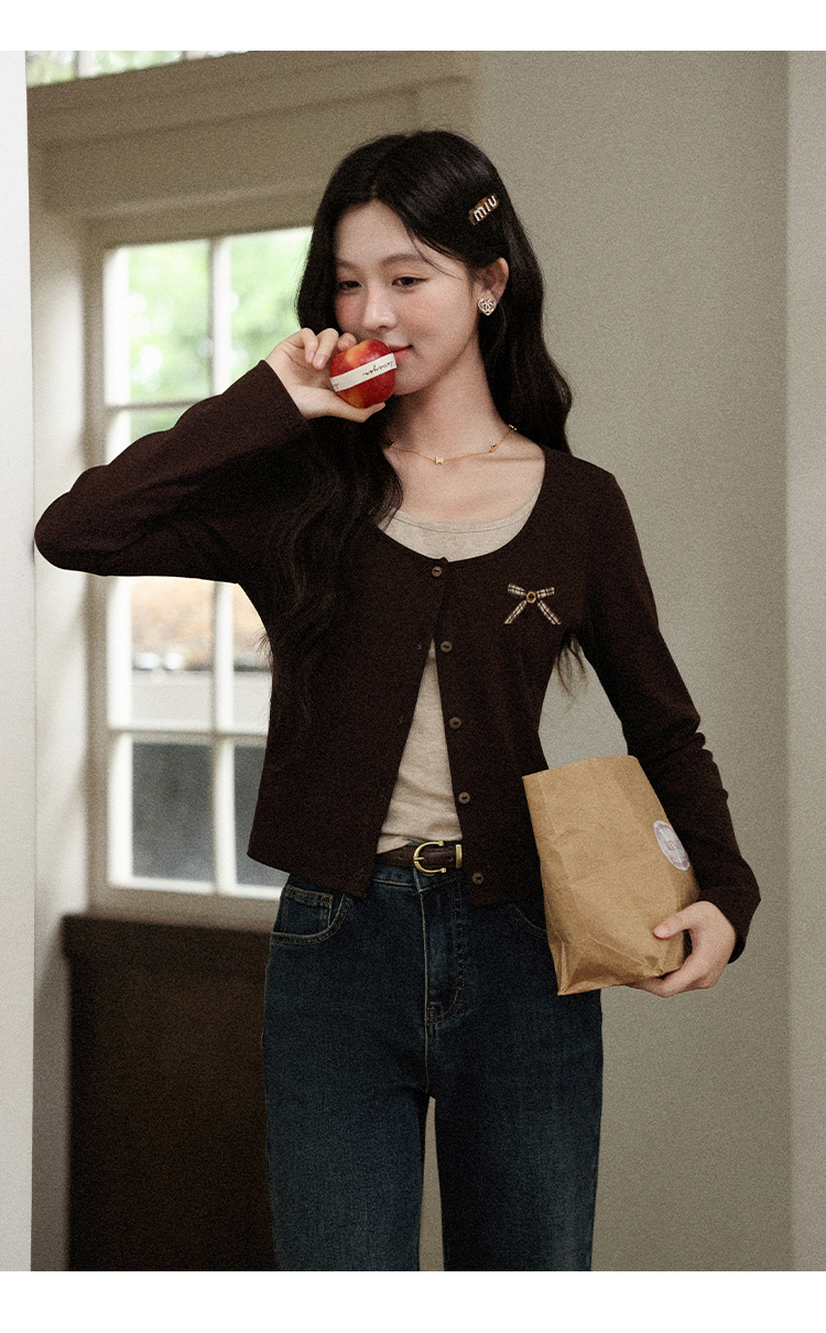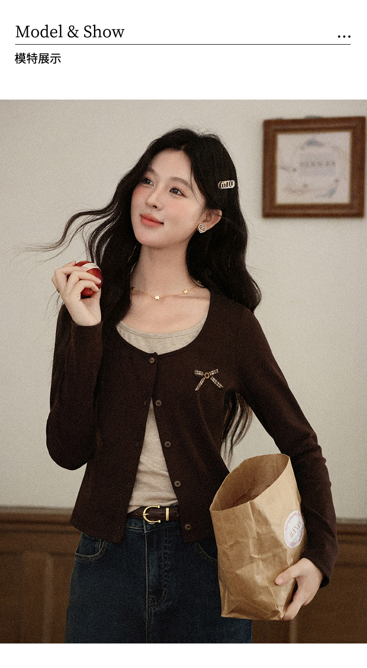 鹿向南「焦糖玛奇朵」假两件正肩长袖t恤女早秋修身短款咖色上衣