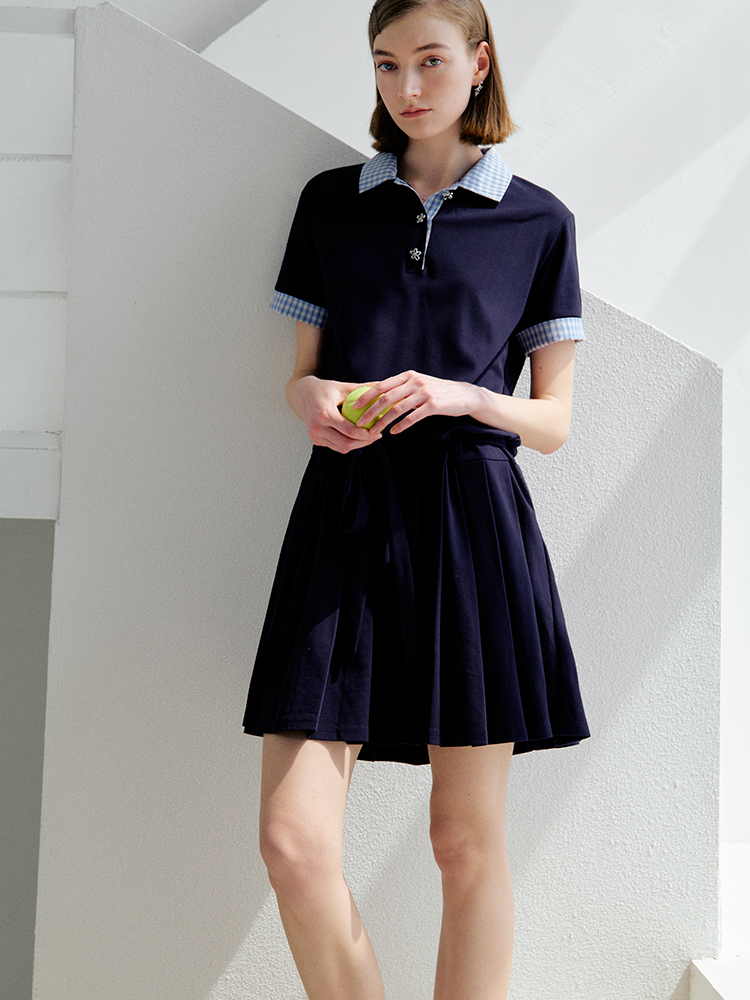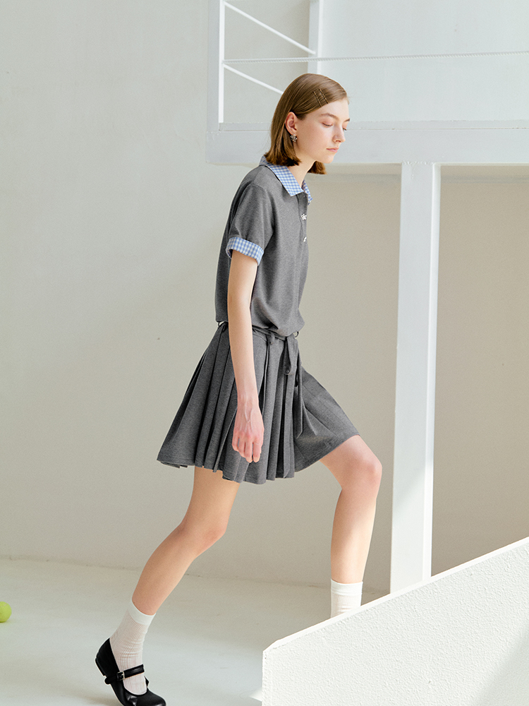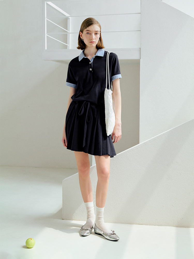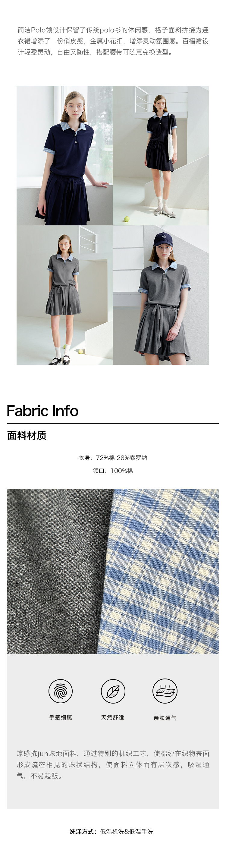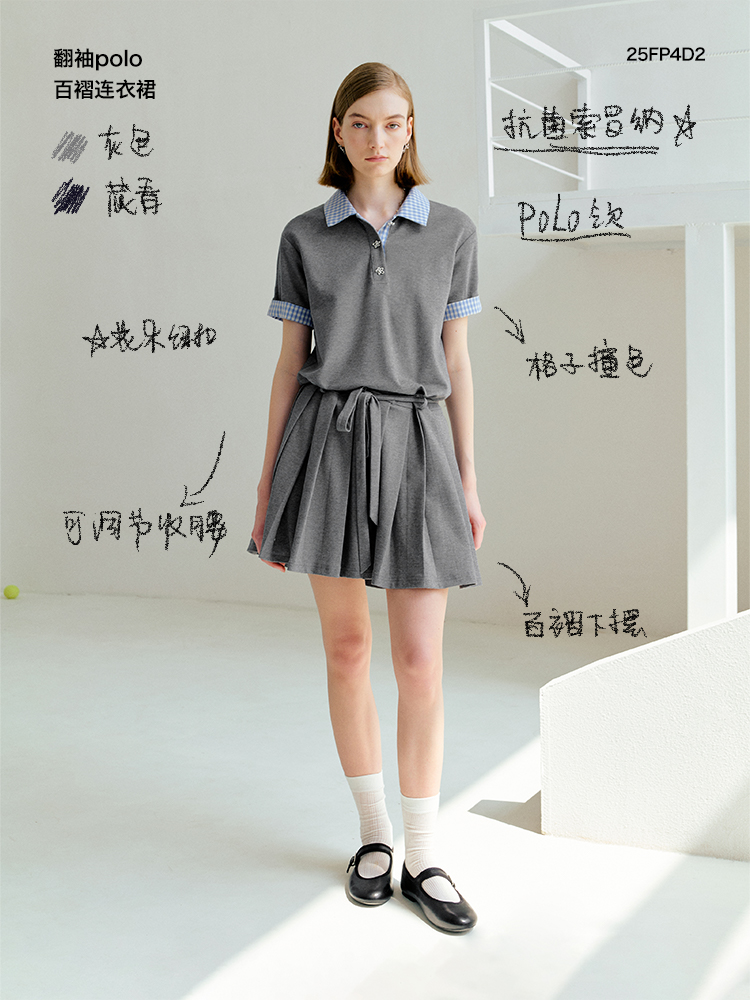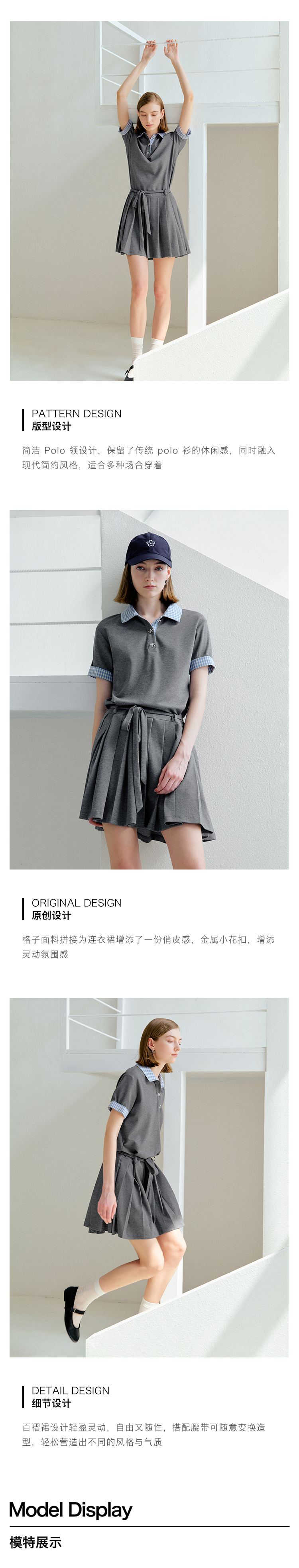 ForPoem 现货 25/SS原创设计凉感抗菌珠地短袖格子POLO百褶连衣裙