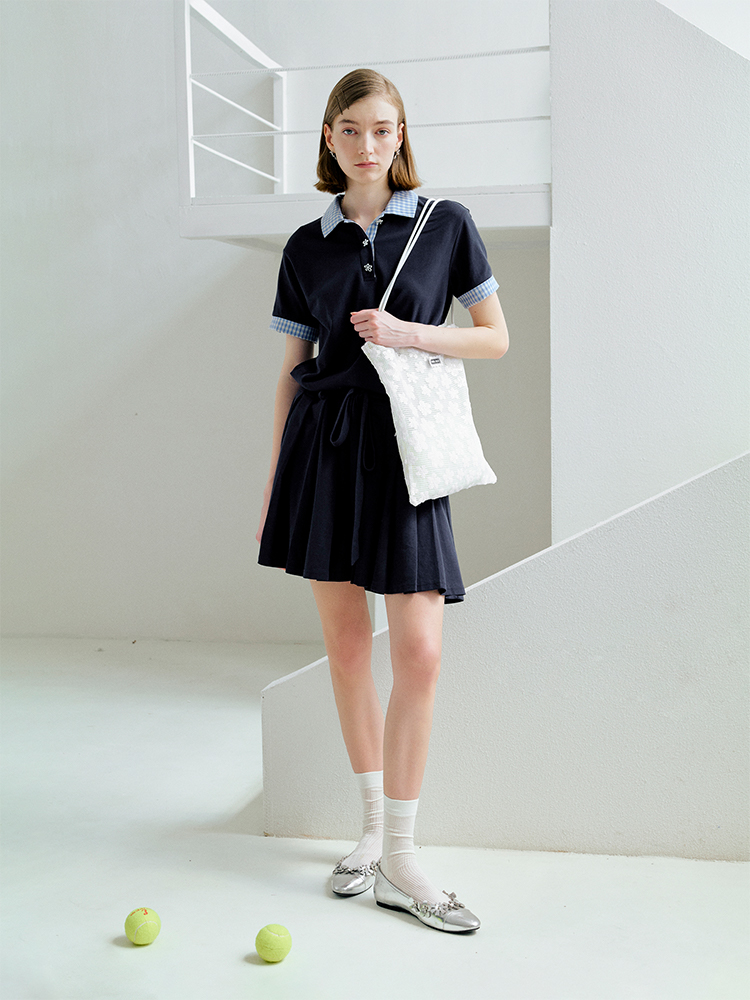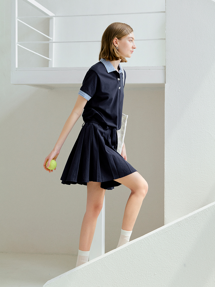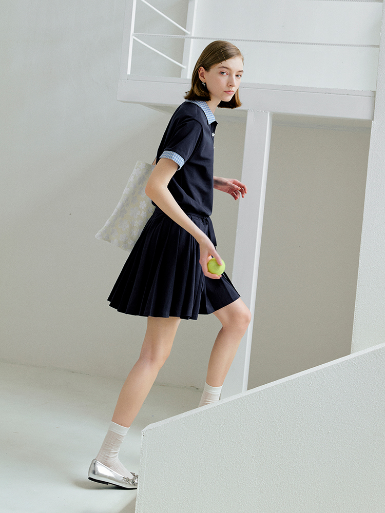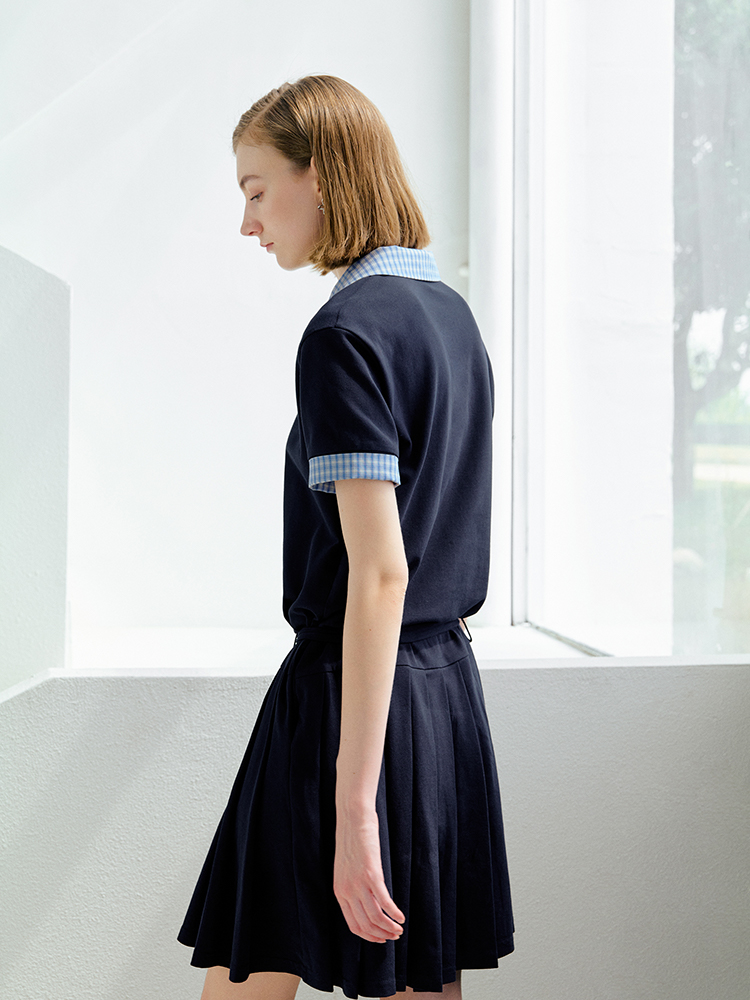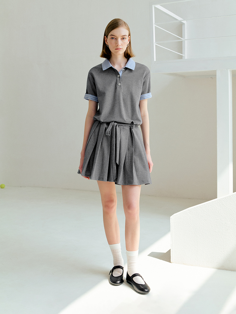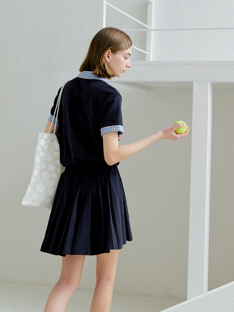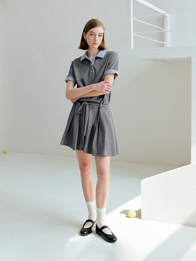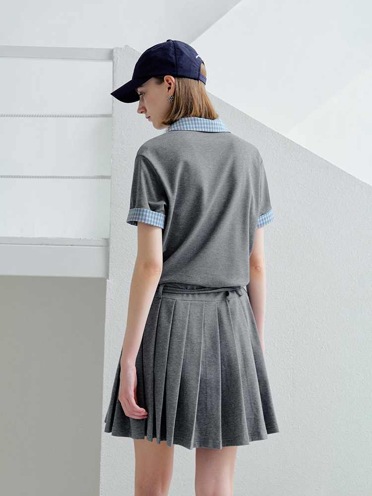 ForPoem 现货 25/SS原创设计凉感抗菌珠地短袖格子POLO百褶连衣裙