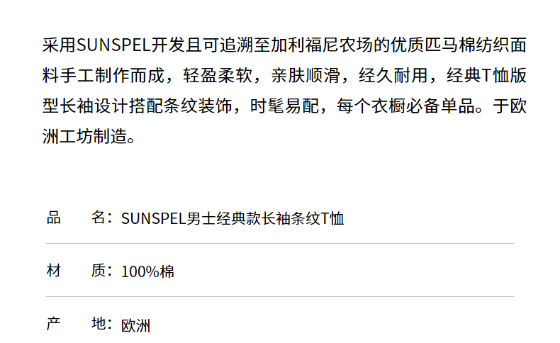 SUNSPEL男士经典款Supima匹马棉条纹长袖经典T恤