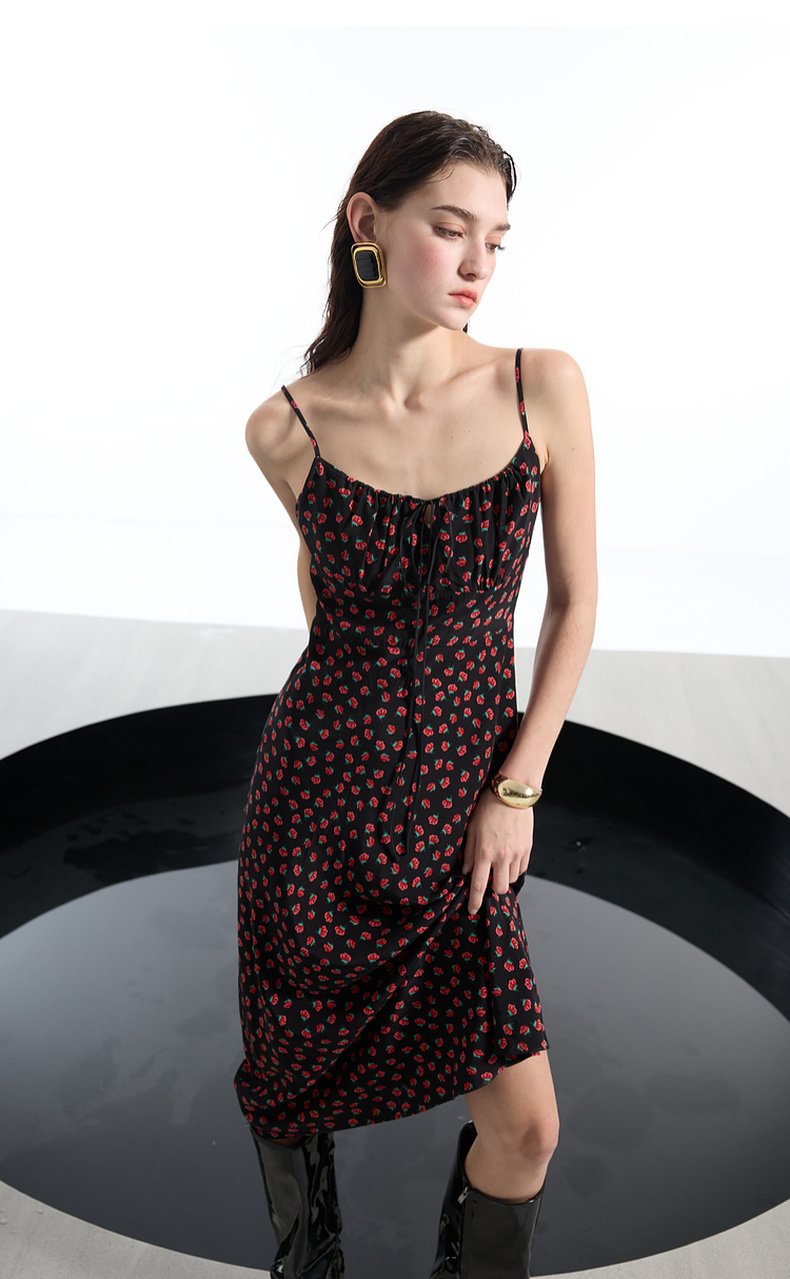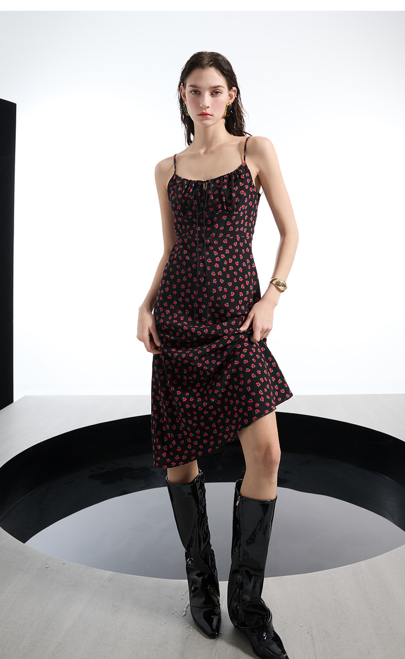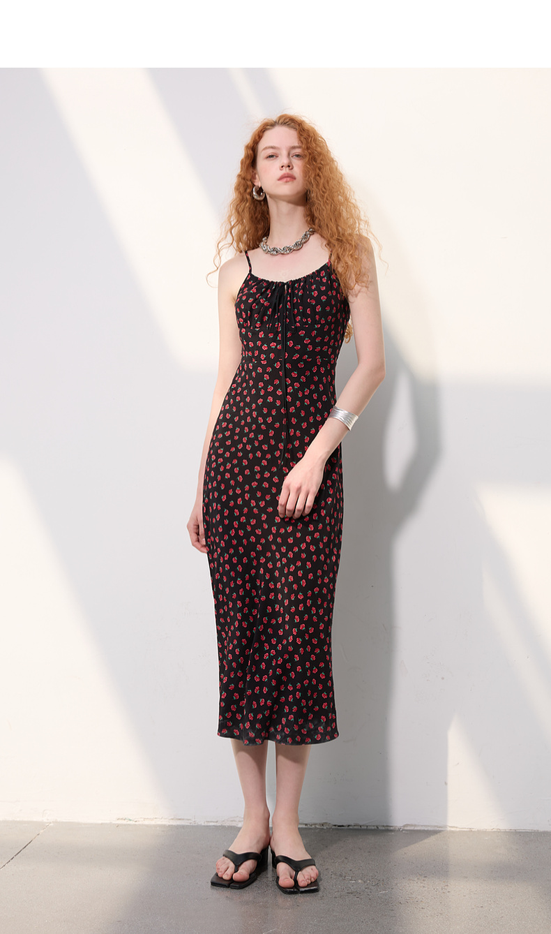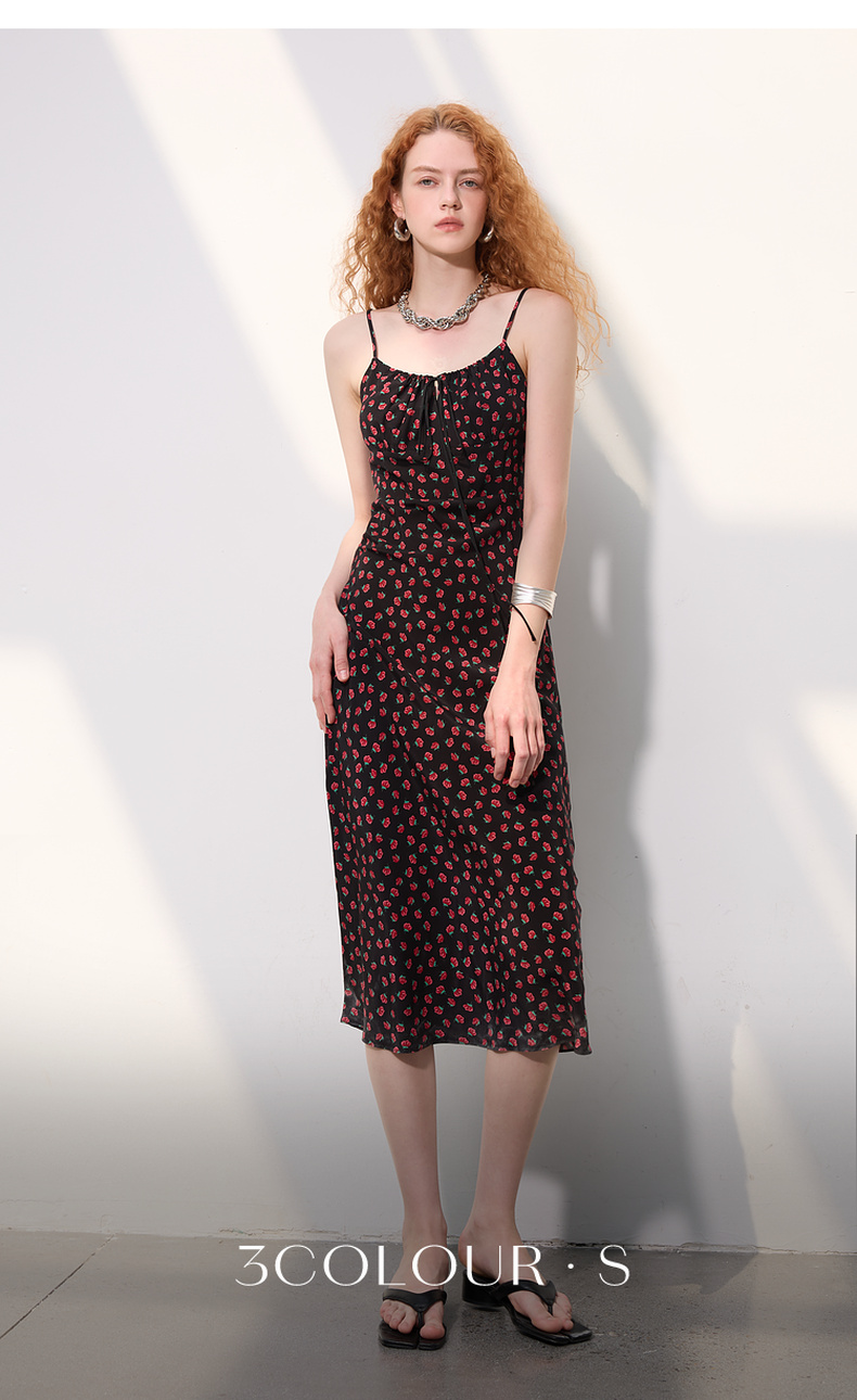 三彩2025春季新款碎花连衣裙无袖吊带裙系带修身长裙浪漫S