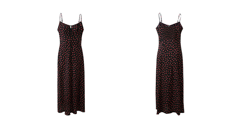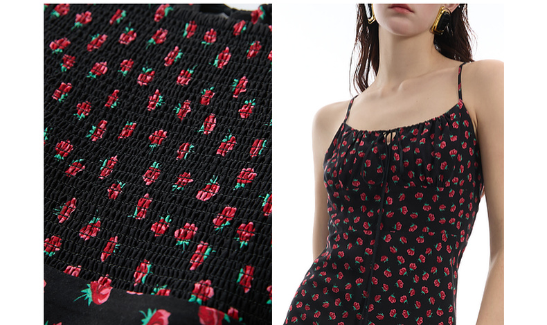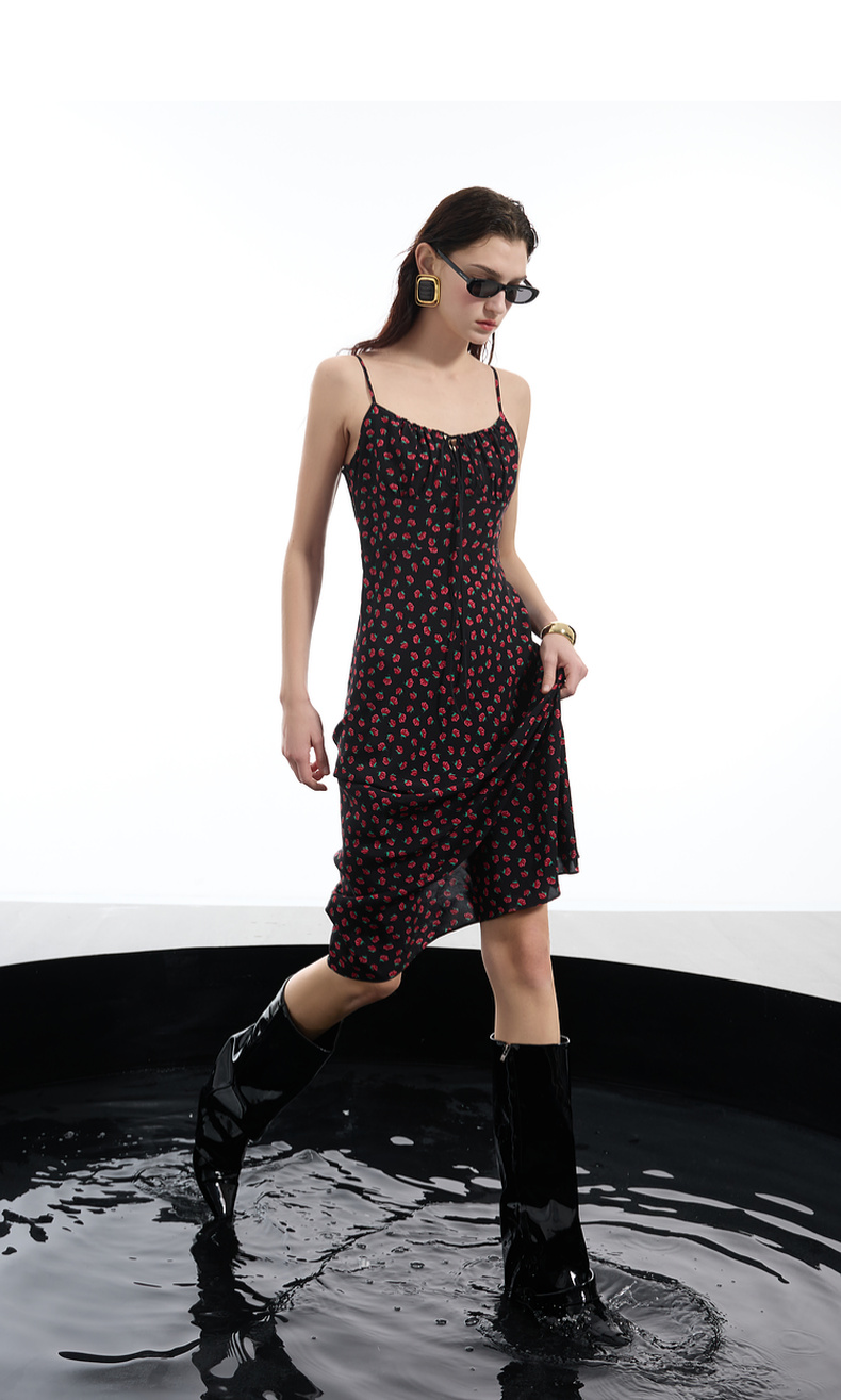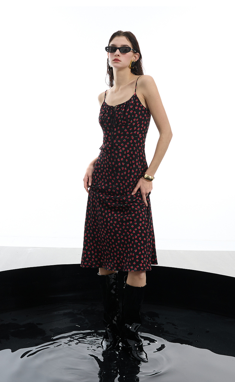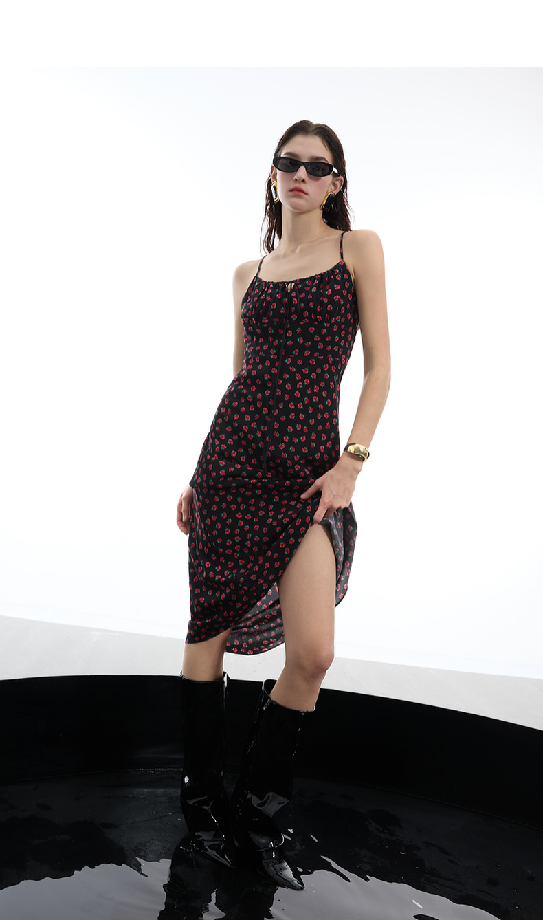 三彩2025春季新款碎花连衣裙无袖吊带裙系带修身长裙浪漫S