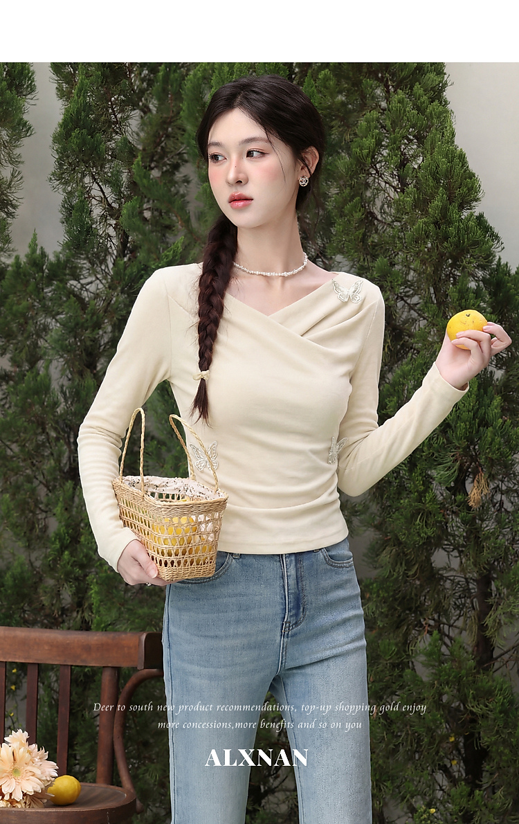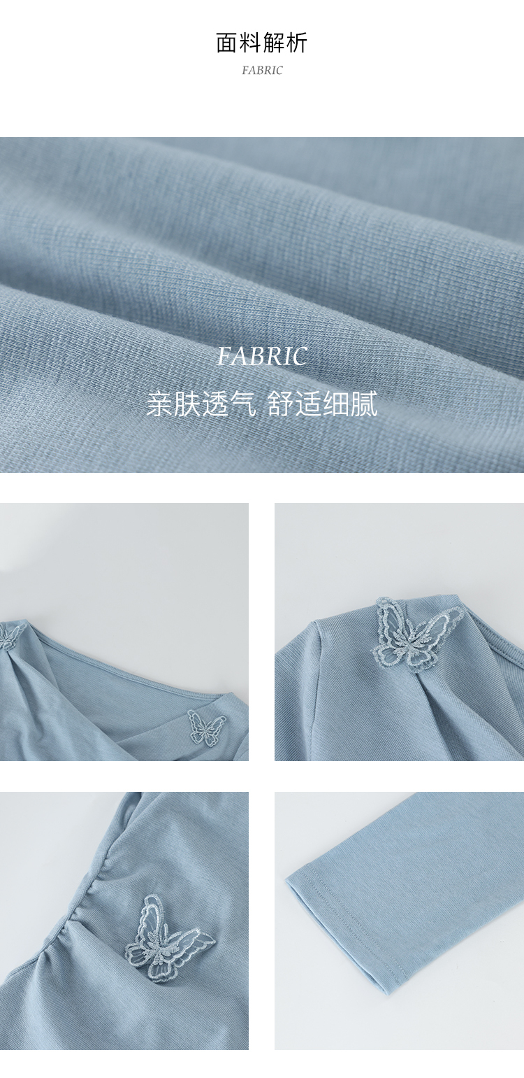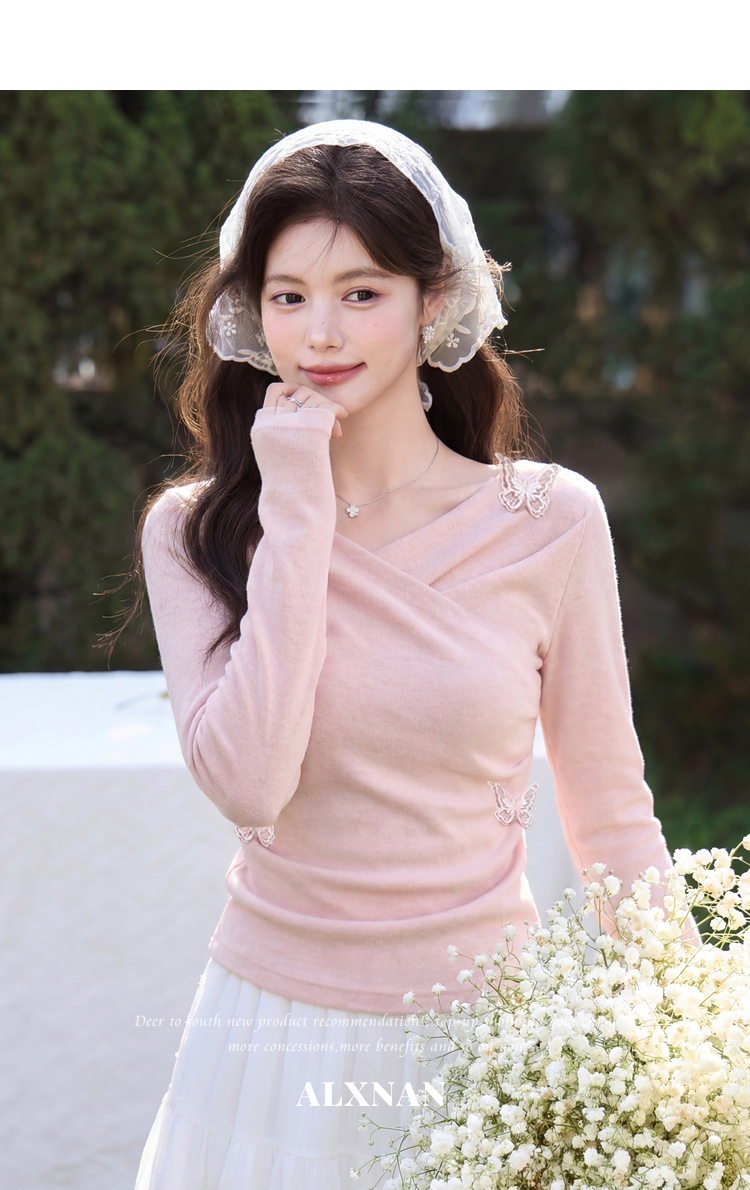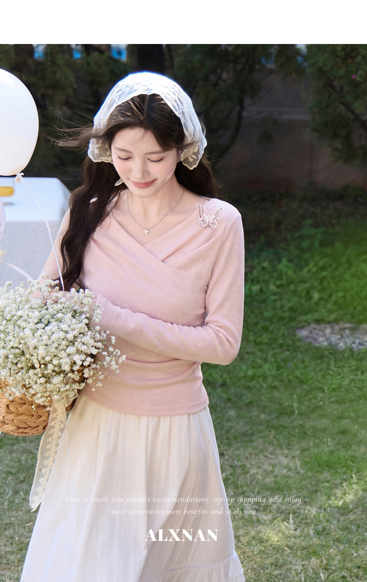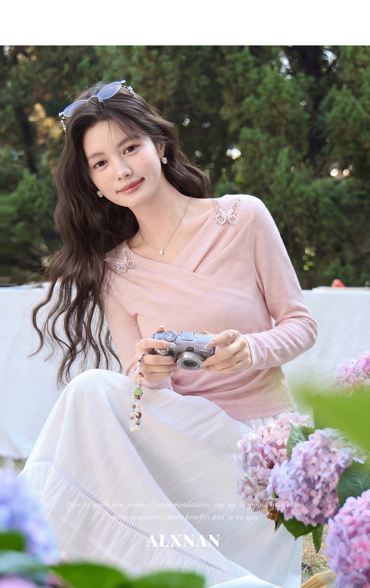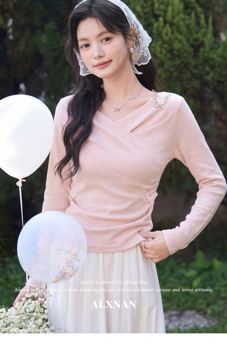 鹿向南「桃与蝶序」莱赛尔设计感粉色长袖T恤女春夏收腰修身上衣