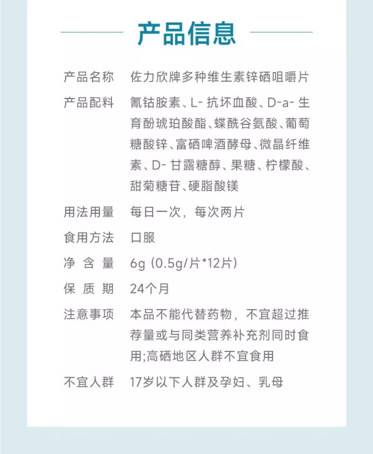 佐力欣倍韵多种维生素锌硒咀嚼片12片装营养素补充剂