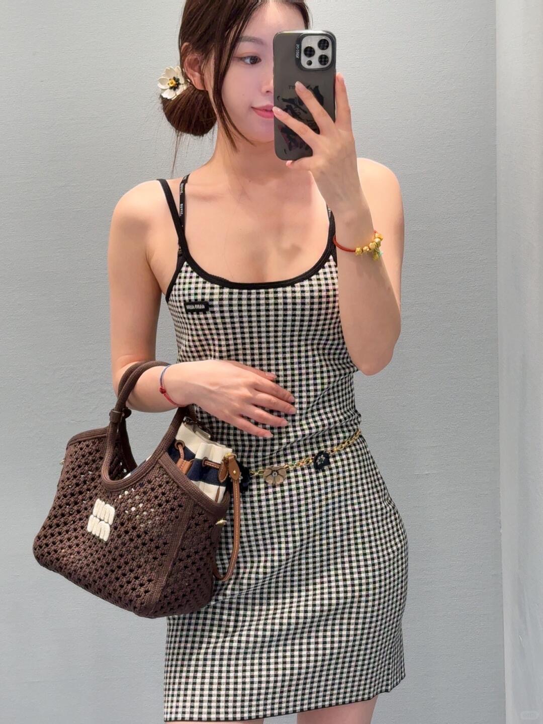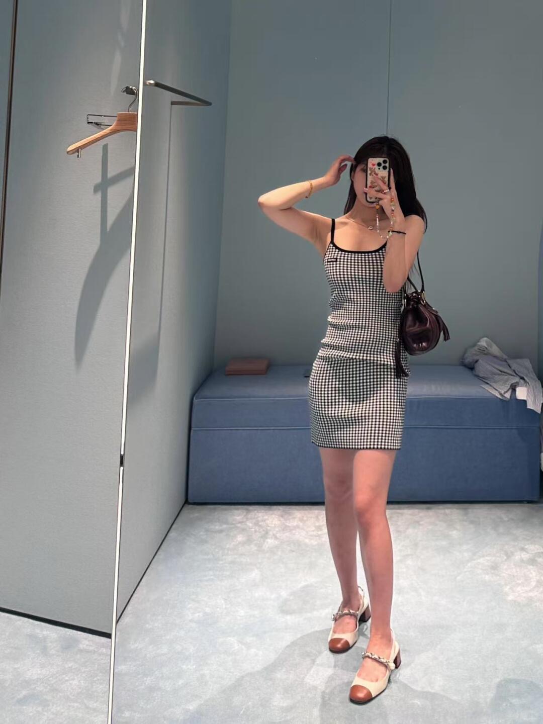 Miumi* 25Ss春夏新款 微标格纹针织吊带连衣裙丨