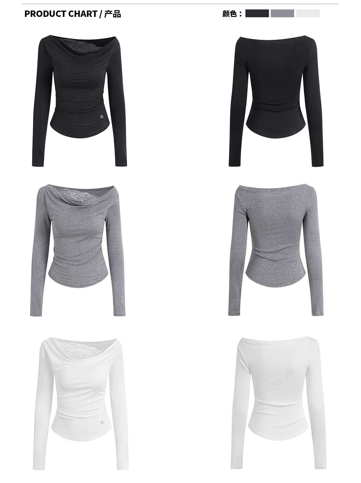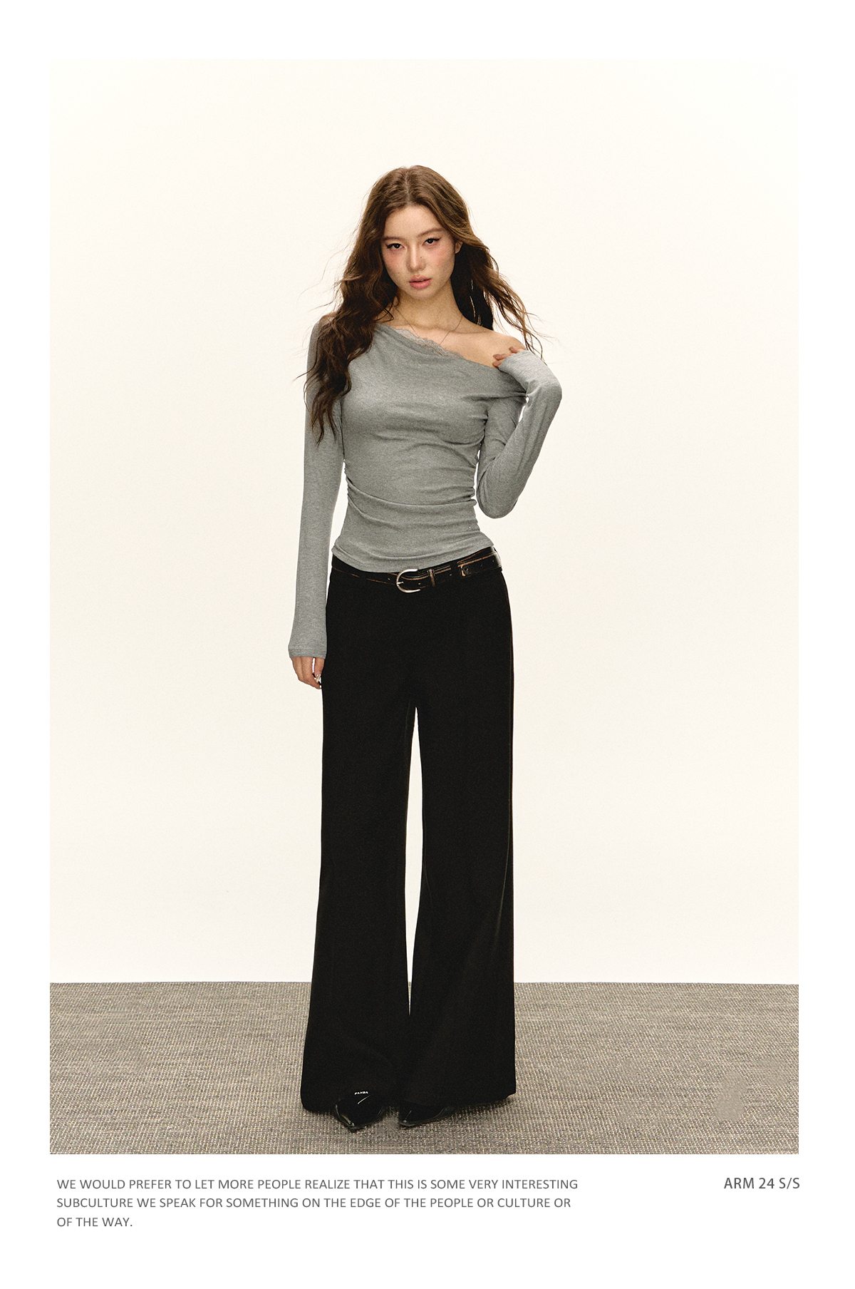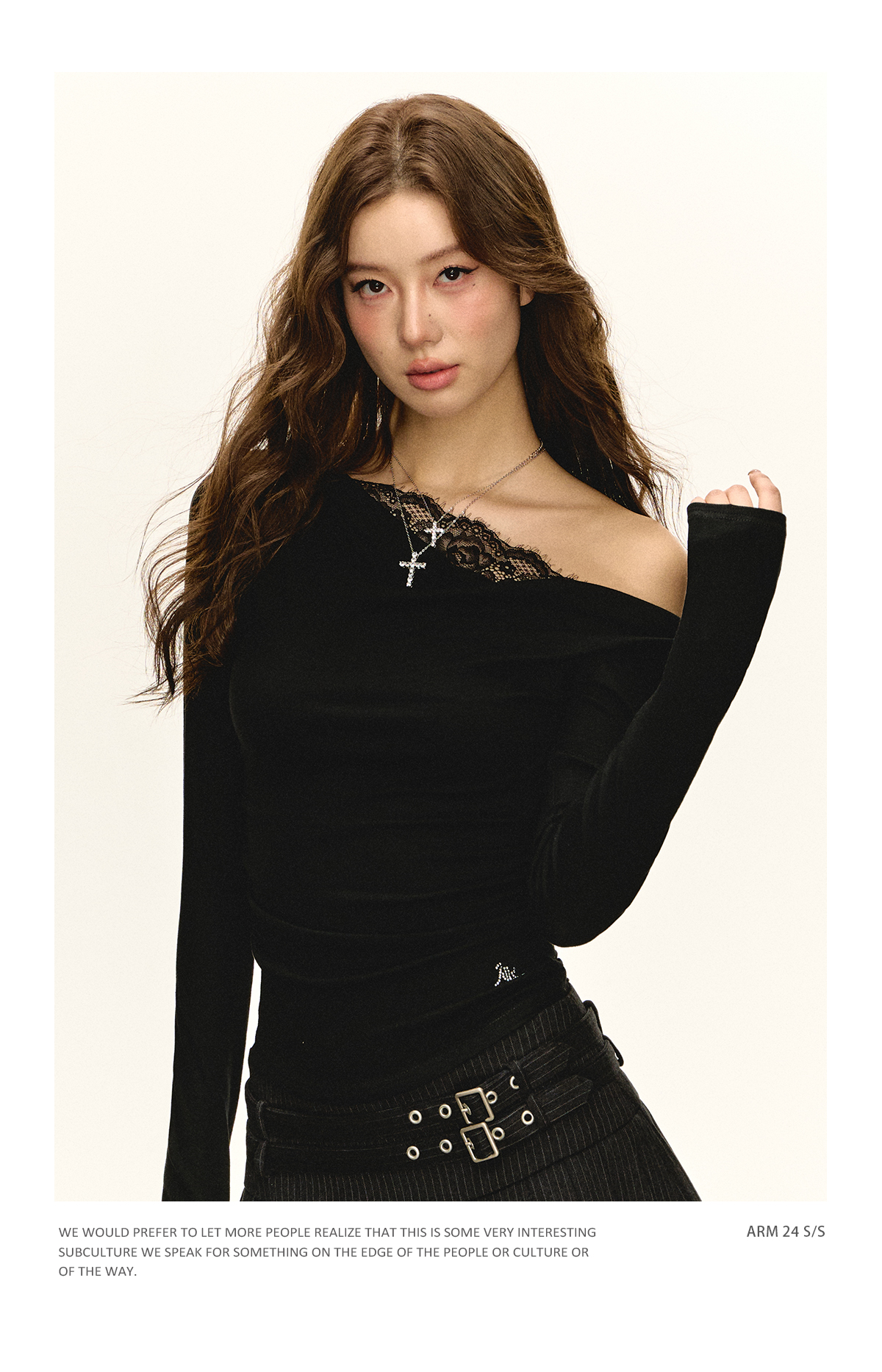 Ariseism 美式复古设计感蕾丝斜肩长袖T恤女春季新款内搭上衣