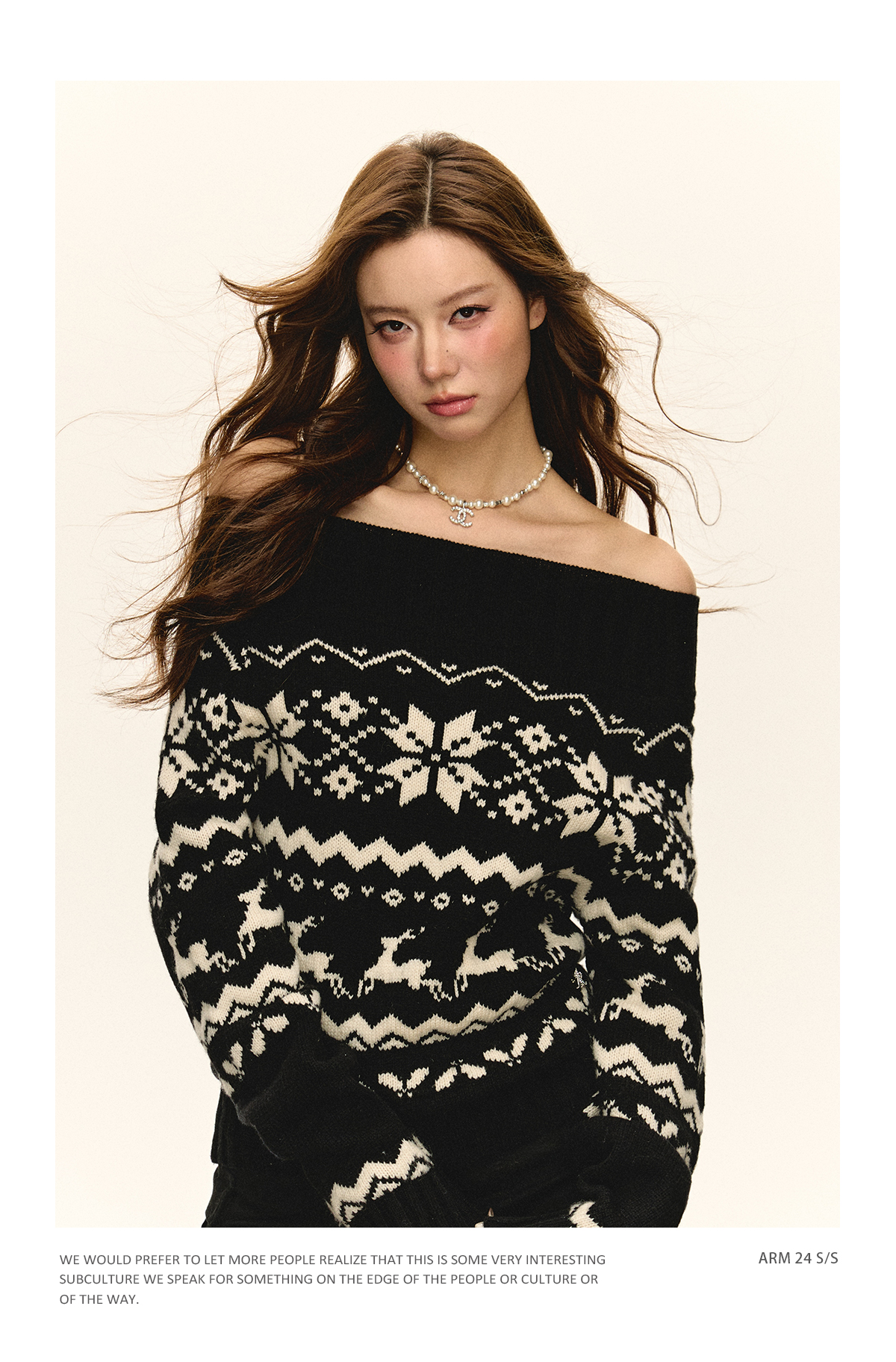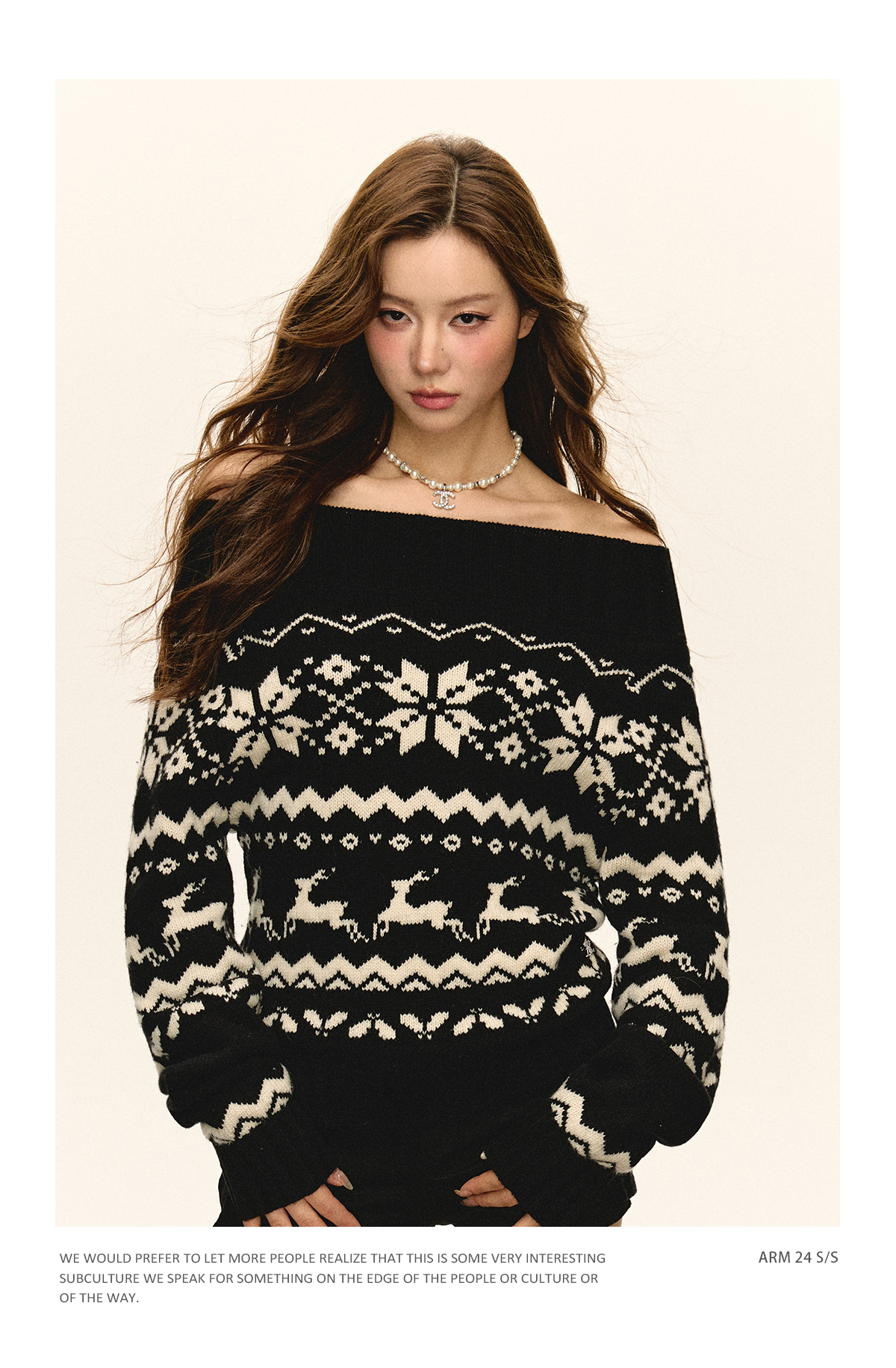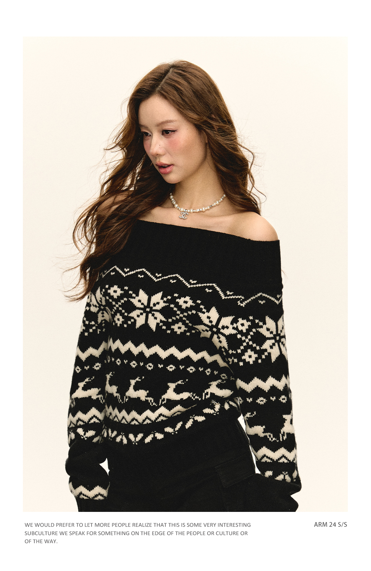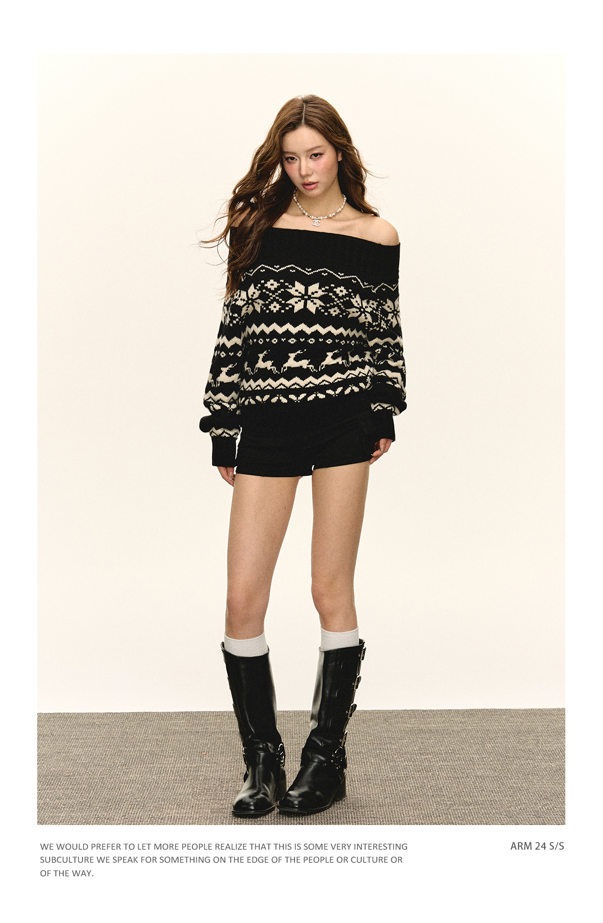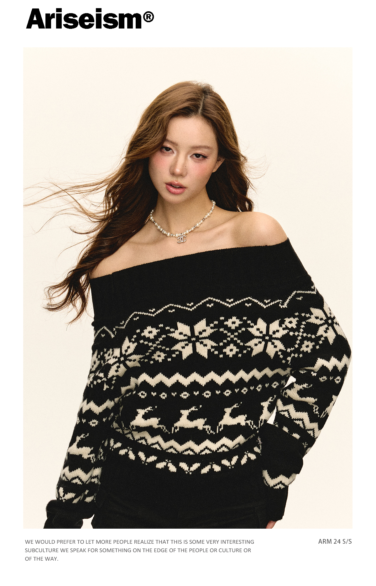Ariseism美式复古设计感费尔岛一字肩毛衣外套女春秋新款露肩上衣