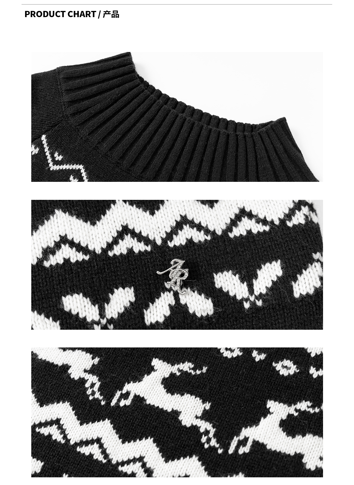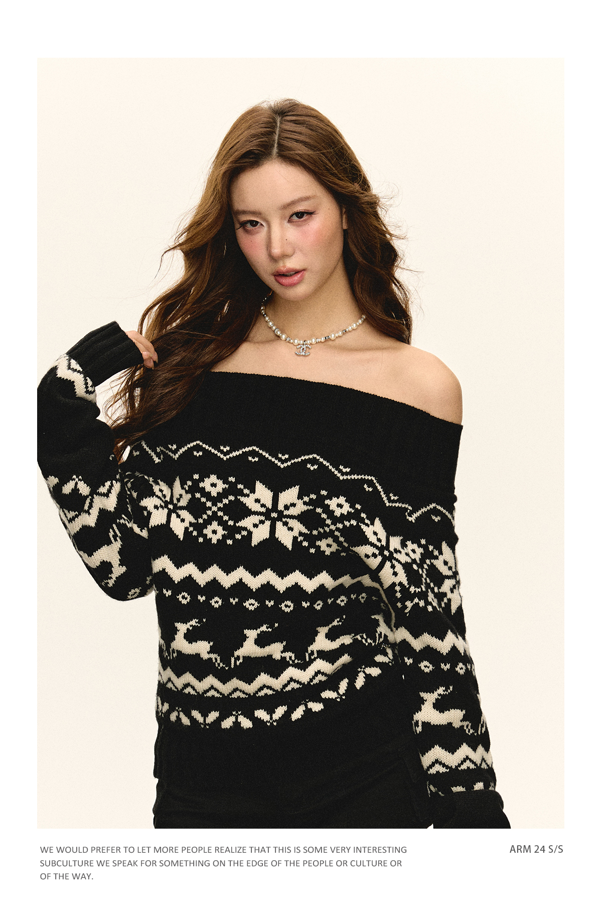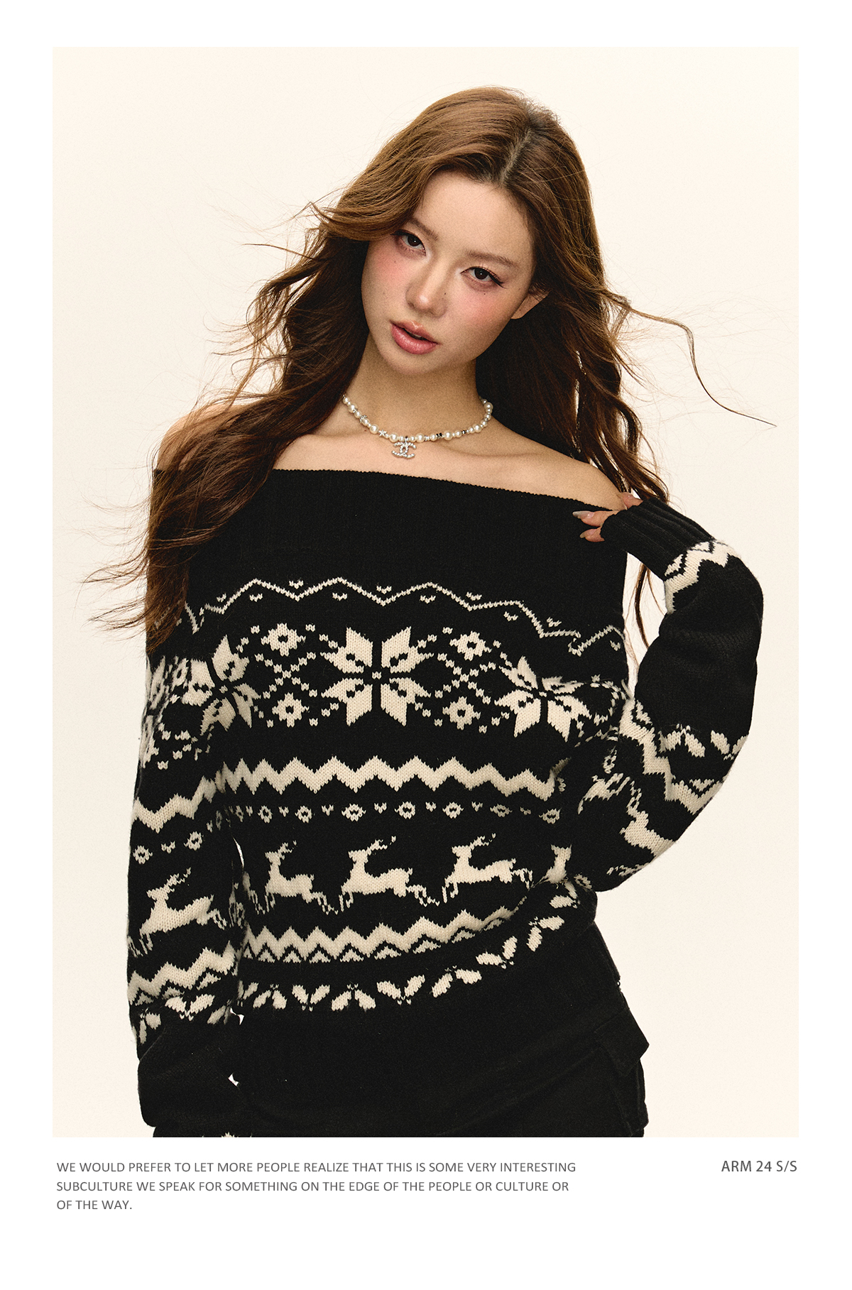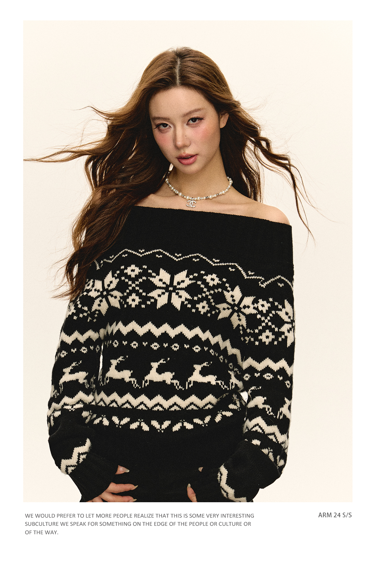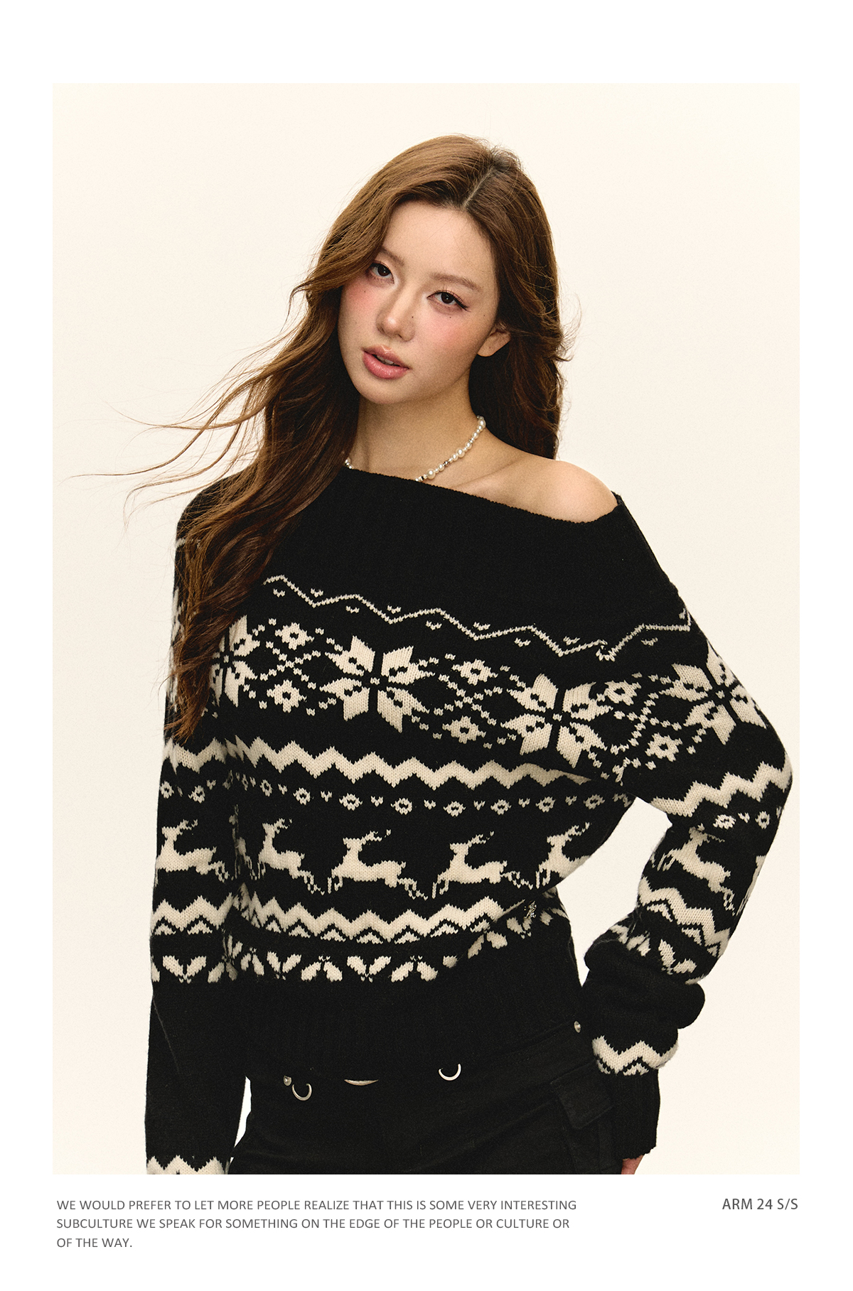 Ariseism美式复古设计感费尔岛一字肩毛衣外套女春秋新款露肩上衣
